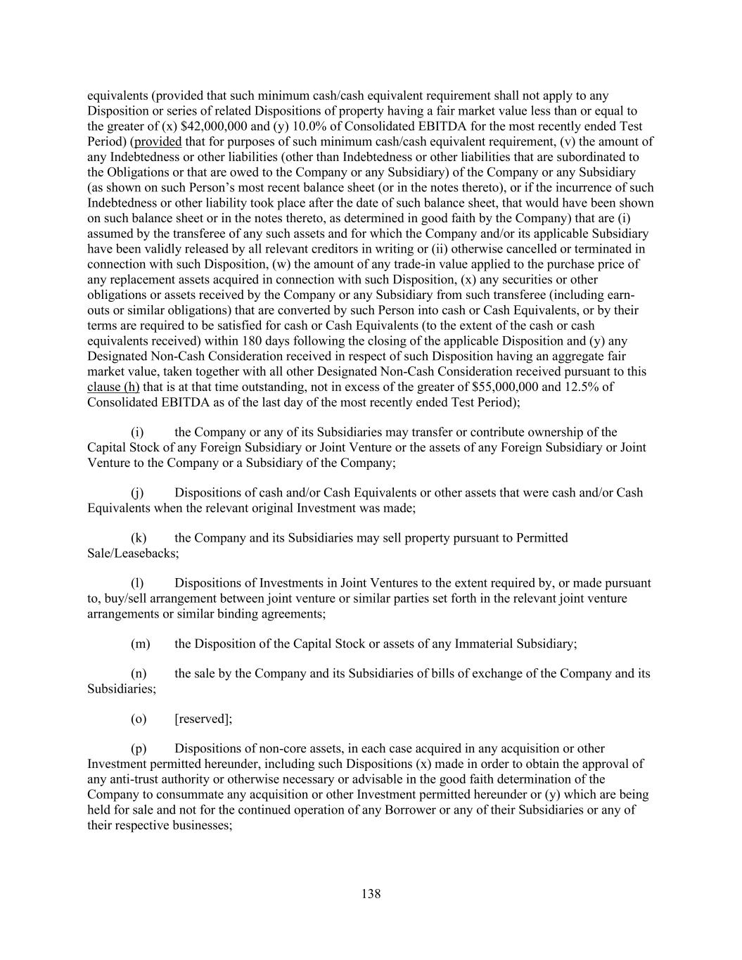 138 equivalents (provided that such minimum cash/cash equivalent requirement shall not apply to any Disposition or series of related Dispositions of property having a fair market value less than or equal to the greater of (x) $42,000,000 and (y) 10.0% of Consolidated EBITDA for the most recently ended Test Period) (provided that for purposes of such minimum cash/cash equivalent requirement, (v) the amount of any Indebtedness or other liabilities (other than Indebtedness or other liabilities that are subordinated to the Obligations or that are owed to the Company or any Subsidiary) of the Company or any Subsidiary (as shown on such Person’s most recent balance sheet (or in the notes thereto), or if the incurrence of such Indebtedness or other liability took place after the date of such balance sheet, that would have been shown on such balance sheet or in the notes thereto, as determined in good faith by the Company) that are (i) assumed by the transferee of any such assets and for which the Company and/or its applicable Subsidiary have been validly released by all relevant creditors in writing or (ii) otherwise cancelled or terminated in connection with such Disposition, (w) the amount of any trade-in value applied to the purchase price of any replacement assets acquired in connection with such Disposition, (x) any securities or other obligations or assets received by the Company or any Subsidiary from such transferee (including earn- outs or similar obligations) that are converted by such Person into cash or Cash Equivalents, or by their terms are required to be satisfied for cash or Cash Equivalents (to the extent of the cash or cash equivalents received) within 180 days following the closing of the applicable Disposition and (y) any Designated Non-Cash Consideration received in respect of such Disposition having an aggregate fair market value, taken together with all other Designated Non-Cash Consideration received pursuant to this clause (h) that is at that time outstanding, not in excess of the greater of $55,000,000 and 12.5% of Consolidated EBITDA as of the last day of the most recently ended Test Period); (i) the Company or any of its Subsidiaries may transfer or contribute ownership of the Capital Stock of any Foreign Subsidiary or Joint Venture or the assets of any Foreign Subsidiary or Joint Venture to the Company or a Subsidiary of the Company; (j) Dispositions of cash and/or Cash Equivalents or other assets that were cash and/or Cash Equivalents when the relevant original Investment was made; (k) the Company and its Subsidiaries may sell property pursuant to Permitted Sale/Leasebacks; (l) Dispositions of Investments in Joint Ventures to the extent required by, or made pursuant to, buy/sell arrangement between joint venture or similar parties set forth in the relevant joint venture arrangements or similar binding agreements; (m) the Disposition of the Capital Stock or assets of any Immaterial Subsidiary; (n) the sale by the Company and its Subsidiaries of bills of exchange of the Company and its Subsidiaries; (o) [reserved]; (p) Dispositions of non-core assets, in each case acquired in any acquisition or other Investment permitted hereunder, including such Dispositions (x) made in order to obtain the approval of any anti-trust authority or otherwise necessary or advisable in the good faith determination of the Company to consummate any acquisition or other Investment permitted hereunder or (y) which are being held for sale and not for the continued operation of any Borrower or any of their Subsidiaries or any of their respective businesses;