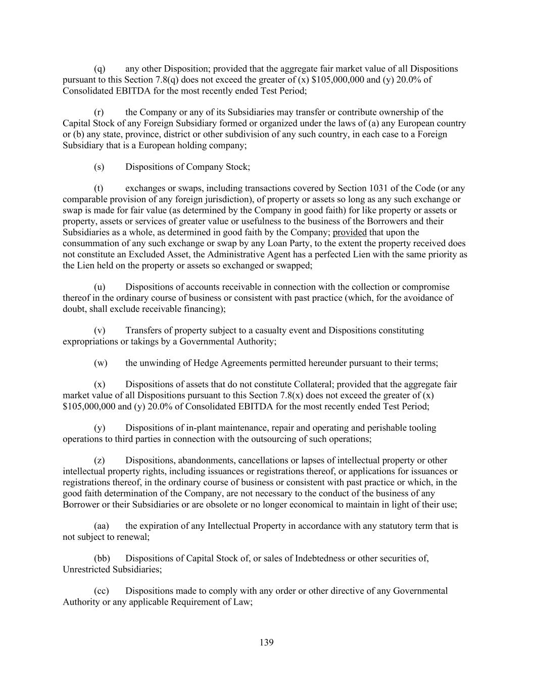 139 (q) any other Disposition; provided that the aggregate fair market value of all Dispositions pursuant to this Section 7.8(q) does not exceed the greater of (x) $105,000,000 and (y) 20.0% of Consolidated EBITDA for the most recently ended Test Period; (r) the Company or any of its Subsidiaries may transfer or contribute ownership of the Capital Stock of any Foreign Subsidiary formed or organized under the laws of (a) any European country or (b) any state, province, district or other subdivision of any such country, in each case to a Foreign Subsidiary that is a European holding company; (s) Dispositions of Company Stock; (t) exchanges or swaps, including transactions covered by Section 1031 of the Code (or any comparable provision of any foreign jurisdiction), of property or assets so long as any such exchange or swap is made for fair value (as determined by the Company in good faith) for like property or assets or property, assets or services of greater value or usefulness to the business of the Borrowers and their Subsidiaries as a whole, as determined in good faith by the Company; provided that upon the consummation of any such exchange or swap by any Loan Party, to the extent the property received does not constitute an Excluded Asset, the Administrative Agent has a perfected Lien with the same priority as the Lien held on the property or assets so exchanged or swapped; (u) Dispositions of accounts receivable in connection with the collection or compromise thereof in the ordinary course of business or consistent with past practice (which, for the avoidance of doubt, shall exclude receivable financing); (v) Transfers of property subject to a casualty event and Dispositions constituting expropriations or takings by a Governmental Authority; (w) the unwinding of Hedge Agreements permitted hereunder pursuant to their terms; (x) Dispositions of assets that do not constitute Collateral; provided that the aggregate fair market value of all Dispositions pursuant to this Section 7.8(x) does not exceed the greater of (x) $105,000,000 and (y) 20.0% of Consolidated EBITDA for the most recently ended Test Period; (y) Dispositions of in-plant maintenance, repair and operating and perishable tooling operations to third parties in connection with the outsourcing of such operations; (z) Dispositions, abandonments, cancellations or lapses of intellectual property or other intellectual property rights, including issuances or registrations thereof, or applications for issuances or registrations thereof, in the ordinary course of business or consistent with past practice or which, in the good faith determination of the Company, are not necessary to the conduct of the business of any Borrower or their Subsidiaries or are obsolete or no longer economical to maintain in light of their use; (aa) the expiration of any Intellectual Property in accordance with any statutory term that is not subject to renewal; (bb) Dispositions of Capital Stock of, or sales of Indebtedness or other securities of, Unrestricted Subsidiaries; (cc) Dispositions made to comply with any order or other directive of any Governmental Authority or any applicable Requirement of Law;