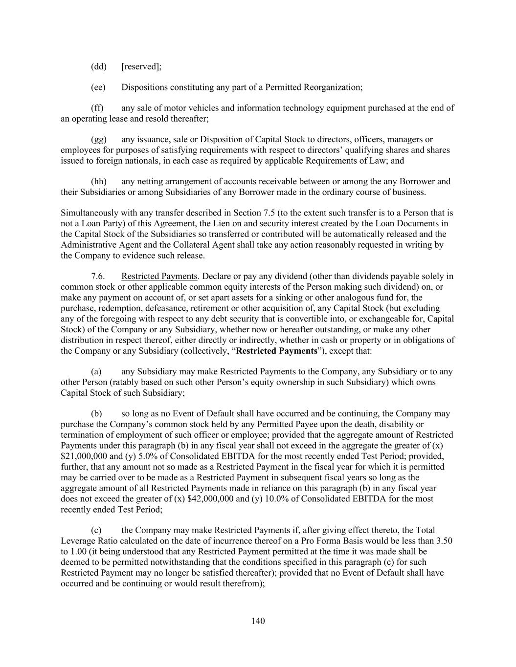 140 (dd) [reserved]; (ee) Dispositions constituting any part of a Permitted Reorganization; (ff) any sale of motor vehicles and information technology equipment purchased at the end of an operating lease and resold thereafter; (gg) any issuance, sale or Disposition of Capital Stock to directors, officers, managers or employees for purposes of satisfying requirements with respect to directors’ qualifying shares and shares issued to foreign nationals, in each case as required by applicable Requirements of Law; and (hh) any netting arrangement of accounts receivable between or among the any Borrower and their Subsidiaries or among Subsidiaries of any Borrower made in the ordinary course of business. Simultaneously with any transfer described in Section 7.5 (to the extent such transfer is to a Person that is not a Loan Party) of this Agreement, the Lien on and security interest created by the Loan Documents in the Capital Stock of the Subsidiaries so transferred or contributed will be automatically released and the Administrative Agent and the Collateral Agent shall take any action reasonably requested in writing by the Company to evidence such release. 7.6. Restricted Payments. Declare or pay any dividend (other than dividends payable solely in common stock or other applicable common equity interests of the Person making such dividend) on, or make any payment on account of, or set apart assets for a sinking or other analogous fund for, the purchase, redemption, defeasance, retirement or other acquisition of, any Capital Stock (but excluding any of the foregoing with respect to any debt security that is convertible into, or exchangeable for, Capital Stock) of the Company or any Subsidiary, whether now or hereafter outstanding, or make any other distribution in respect thereof, either directly or indirectly, whether in cash or property or in obligations of the Company or any Subsidiary (collectively, “Restricted Payments”), except that: (a) any Subsidiary may make Restricted Payments to the Company, any Subsidiary or to any other Person (ratably based on such other Person’s equity ownership in such Subsidiary) which owns Capital Stock of such Subsidiary; (b) so long as no Event of Default shall have occurred and be continuing, the Company may purchase the Company’s common stock held by any Permitted Payee upon the death, disability or termination of employment of such officer or employee; provided that the aggregate amount of Restricted Payments under this paragraph (b) in any fiscal year shall not exceed in the aggregate the greater of (x) $21,000,000 and (y) 5.0% of Consolidated EBITDA for the most recently ended Test Period; provided, further, that any amount not so made as a Restricted Payment in the fiscal year for which it is permitted may be carried over to be made as a Restricted Payment in subsequent fiscal years so long as the aggregate amount of all Restricted Payments made in reliance on this paragraph (b) in any fiscal year does not exceed the greater of (x) $42,000,000 and (y) 10.0% of Consolidated EBITDA for the most recently ended Test Period; (c) the Company may make Restricted Payments if, after giving effect thereto, the Total Leverage Ratio calculated on the date of incurrence thereof on a Pro Forma Basis would be less than 3.50 to 1.00 (it being understood that any Restricted Payment permitted at the time it was made shall be deemed to be permitted notwithstanding that the conditions specified in this paragraph (c) for such Restricted Payment may no longer be satisfied thereafter); provided that no Event of Default shall have occurred and be continuing or would result therefrom);