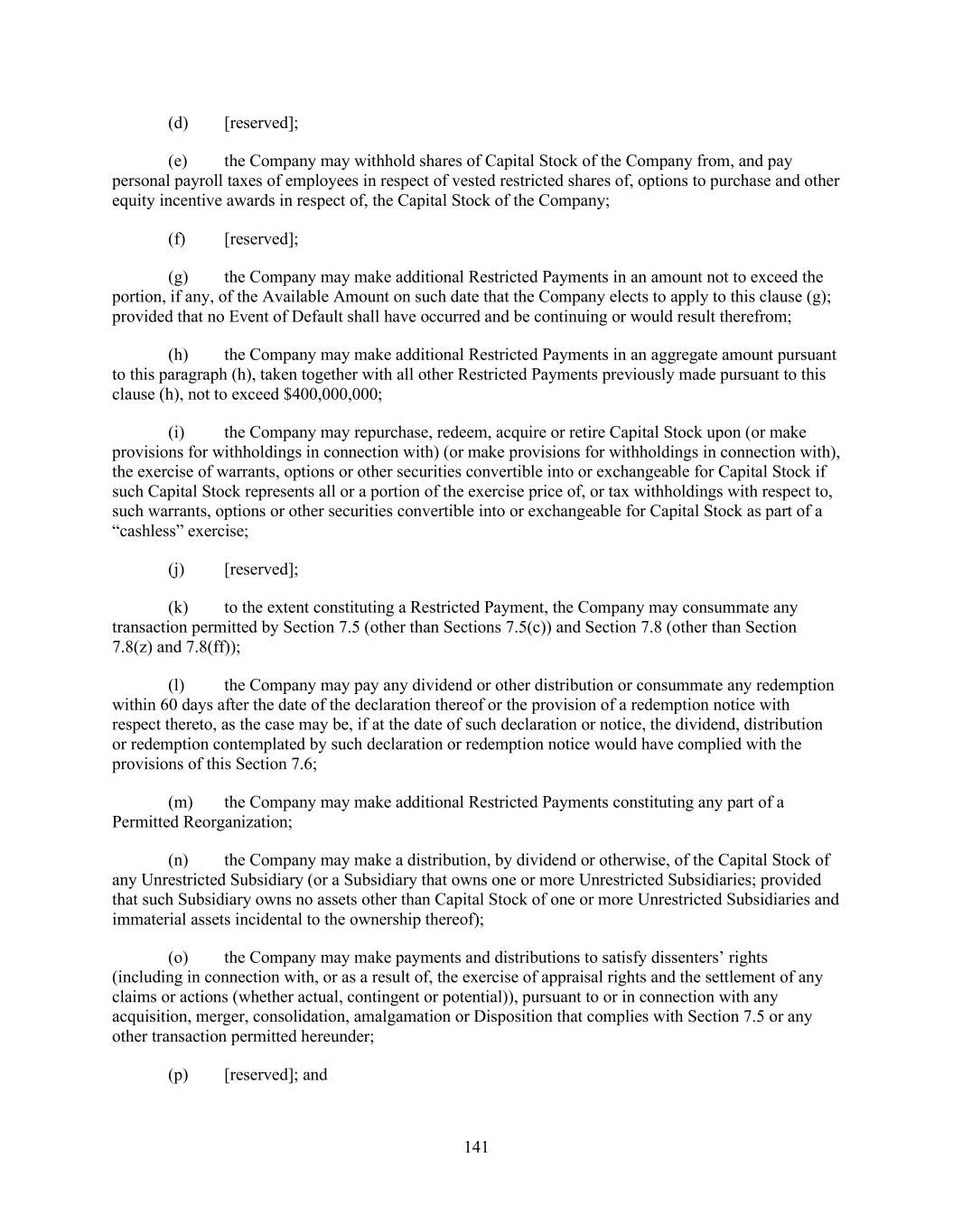 141 (d) [reserved]; (e) the Company may withhold shares of Capital Stock of the Company from, and pay personal payroll taxes of employees in respect of vested restricted shares of, options to purchase and other equity incentive awards in respect of, the Capital Stock of the Company; (f) [reserved]; (g) the Company may make additional Restricted Payments in an amount not to exceed the portion, if any, of the Available Amount on such date that the Company elects to apply to this clause (g); provided that no Event of Default shall have occurred and be continuing or would result therefrom; (h) the Company may make additional Restricted Payments in an aggregate amount pursuant to this paragraph (h), taken together with all other Restricted Payments previously made pursuant to this clause (h), not to exceed $400,000,000; (i) the Company may repurchase, redeem, acquire or retire Capital Stock upon (or make provisions for withholdings in connection with) (or make provisions for withholdings in connection with), the exercise of warrants, options or other securities convertible into or exchangeable for Capital Stock if such Capital Stock represents all or a portion of the exercise price of, or tax withholdings with respect to, such warrants, options or other securities convertible into or exchangeable for Capital Stock as part of a “cashless” exercise; (j) [reserved]; (k) to the extent constituting a Restricted Payment, the Company may consummate any transaction permitted by Section 7.5 (other than Sections 7.5(c)) and Section 7.8 (other than Section 7.8(z) and 7.8(ff)); (l) the Company may pay any dividend or other distribution or consummate any redemption within 60 days after the date of the declaration thereof or the provision of a redemption notice with respect thereto, as the case may be, if at the date of such declaration or notice, the dividend, distribution or redemption contemplated by such declaration or redemption notice would have complied with the provisions of this Section 7.6; (m) the Company may make additional Restricted Payments constituting any part of a Permitted Reorganization; (n) the Company may make a distribution, by dividend or otherwise, of the Capital Stock of any Unrestricted Subsidiary (or a Subsidiary that owns one or more Unrestricted Subsidiaries; provided that such Subsidiary owns no assets other than Capital Stock of one or more Unrestricted Subsidiaries and immaterial assets incidental to the ownership thereof); (o) the Company may make payments and distributions to satisfy dissenters’ rights (including in connection with, or as a result of, the exercise of appraisal rights and the settlement of any claims or actions (whether actual, contingent or potential)), pursuant to or in connection with any acquisition, merger, consolidation, amalgamation or Disposition that complies with Section 7.5 or any other transaction permitted hereunder; (p) [reserved]; and