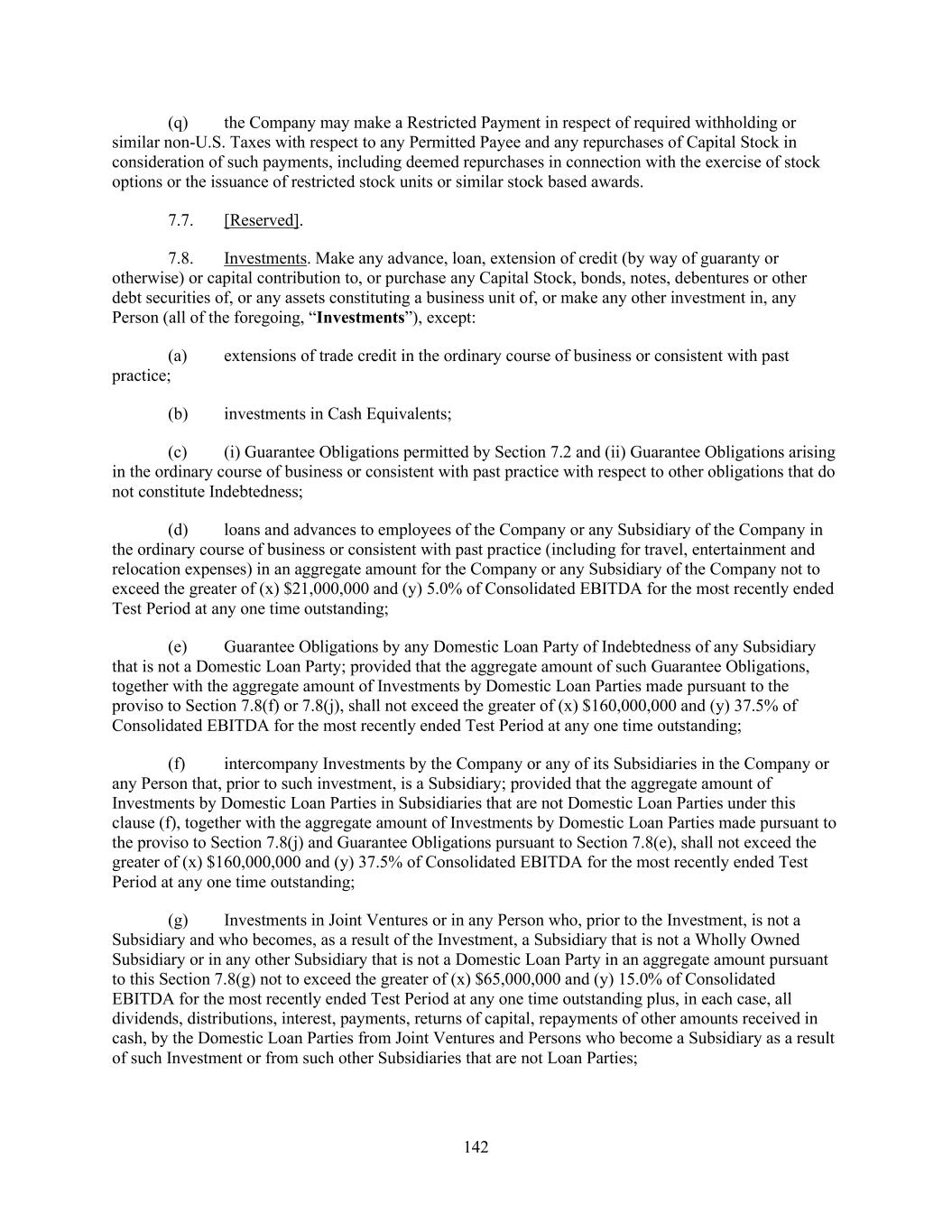 142 (q) the Company may make a Restricted Payment in respect of required withholding or similar non-U.S. Taxes with respect to any Permitted Payee and any repurchases of Capital Stock in consideration of such payments, including deemed repurchases in connection with the exercise of stock options or the issuance of restricted stock units or similar stock based awards. 7.7. [Reserved]. 7.8. Investments. Make any advance, loan, extension of credit (by way of guaranty or otherwise) or capital contribution to, or purchase any Capital Stock, bonds, notes, debentures or other debt securities of, or any assets constituting a business unit of, or make any other investment in, any Person (all of the foregoing, “Investments”), except: (a) extensions of trade credit in the ordinary course of business or consistent with past practice; (b) investments in Cash Equivalents; (c) (i) Guarantee Obligations permitted by Section 7.2 and (ii) Guarantee Obligations arising in the ordinary course of business or consistent with past practice with respect to other obligations that do not constitute Indebtedness; (d) loans and advances to employees of the Company or any Subsidiary of the Company in the ordinary course of business or consistent with past practice (including for travel, entertainment and relocation expenses) in an aggregate amount for the Company or any Subsidiary of the Company not to exceed the greater of (x) $21,000,000 and (y) 5.0% of Consolidated EBITDA for the most recently ended Test Period at any one time outstanding; (e) Guarantee Obligations by any Domestic Loan Party of Indebtedness of any Subsidiary that is not a Domestic Loan Party; provided that the aggregate amount of such Guarantee Obligations, together with the aggregate amount of Investments by Domestic Loan Parties made pursuant to the proviso to Section 7.8(f) or 7.8(j), shall not exceed the greater of (x) $160,000,000 and (y) 37.5% of Consolidated EBITDA for the most recently ended Test Period at any one time outstanding; (f) intercompany Investments by the Company or any of its Subsidiaries in the Company or any Person that, prior to such investment, is a Subsidiary; provided that the aggregate amount of Investments by Domestic Loan Parties in Subsidiaries that are not Domestic Loan Parties under this clause (f), together with the aggregate amount of Investments by Domestic Loan Parties made pursuant to the proviso to Section 7.8(j) and Guarantee Obligations pursuant to Section 7.8(e), shall not exceed the greater of (x) $160,000,000 and (y) 37.5% of Consolidated EBITDA for the most recently ended Test Period at any one time outstanding; (g) Investments in Joint Ventures or in any Person who, prior to the Investment, is not a Subsidiary and who becomes, as a result of the Investment, a Subsidiary that is not a Wholly Owned Subsidiary or in any other Subsidiary that is not a Domestic Loan Party in an aggregate amount pursuant to this Section 7.8(g) not to exceed the greater of (x) $65,000,000 and (y) 15.0% of Consolidated EBITDA for the most recently ended Test Period at any one time outstanding plus, in each case, all dividends, distributions, interest, payments, returns of capital, repayments of other amounts received in cash, by the Domestic Loan Parties from Joint Ventures and Persons who become a Subsidiary as a result of such Investment or from such other Subsidiaries that are not Loan Parties;