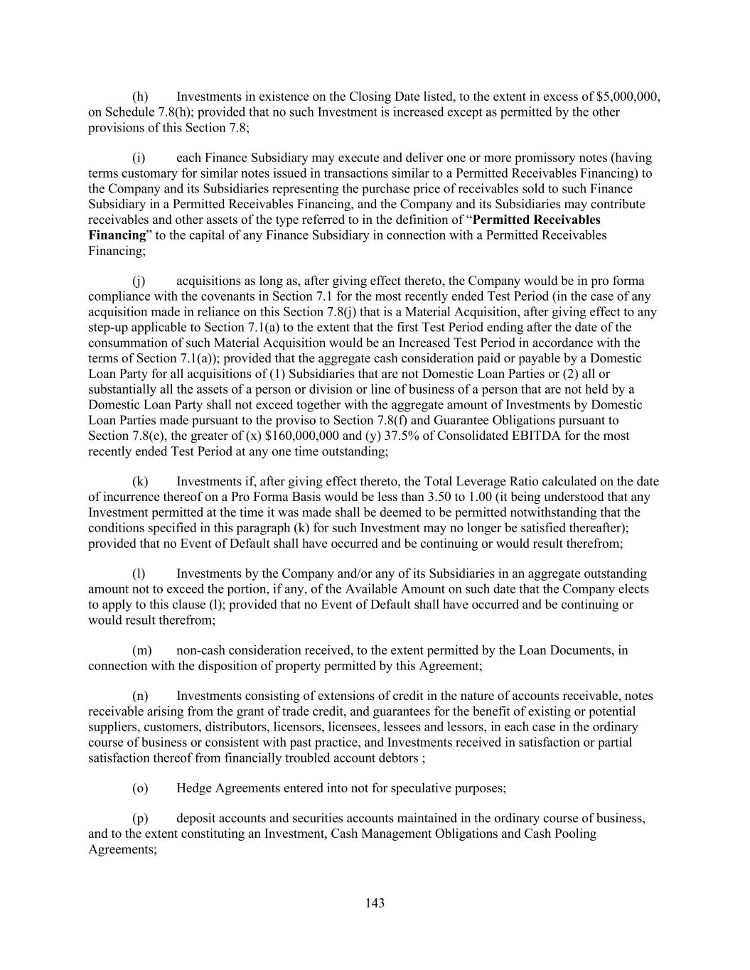 143 (h) Investments in existence on the Closing Date listed, to the extent in excess of $5,000,000, on Schedule 7.8(h); provided that no such Investment is increased except as permitted by the other provisions of this Section 7.8; (i) each Finance Subsidiary may execute and deliver one or more promissory notes (having terms customary for similar notes issued in transactions similar to a Permitted Receivables Financing) to the Company and its Subsidiaries representing the purchase price of receivables sold to such Finance Subsidiary in a Permitted Receivables Financing, and the Company and its Subsidiaries may contribute receivables and other assets of the type referred to in the definition of “Permitted Receivables Financing” to the capital of any Finance Subsidiary in connection with a Permitted Receivables Financing; (j) acquisitions as long as, after giving effect thereto, the Company would be in pro forma compliance with the covenants in Section 7.1 for the most recently ended Test Period (in the case of any acquisition made in reliance on this Section 7.8(j) that is a Material Acquisition, after giving effect to any step-up applicable to Section 7.1(a) to the extent that the first Test Period ending after the date of the consummation of such Material Acquisition would be an Increased Test Period in accordance with the terms of Section 7.1(a)); provided that the aggregate cash consideration paid or payable by a Domestic Loan Party for all acquisitions of (1) Subsidiaries that are not Domestic Loan Parties or (2) all or substantially all the assets of a person or division or line of business of a person that are not held by a Domestic Loan Party shall not exceed together with the aggregate amount of Investments by Domestic Loan Parties made pursuant to the proviso to Section 7.8(f) and Guarantee Obligations pursuant to Section 7.8(e), the greater of (x) $160,000,000 and (y) 37.5% of Consolidated EBITDA for the most recently ended Test Period at any one time outstanding; (k) Investments if, after giving effect thereto, the Total Leverage Ratio calculated on the date of incurrence thereof on a Pro Forma Basis would be less than 3.50 to 1.00 (it being understood that any Investment permitted at the time it was made shall be deemed to be permitted notwithstanding that the conditions specified in this paragraph (k) for such Investment may no longer be satisfied thereafter); provided that no Event of Default shall have occurred and be continuing or would result therefrom; (l) Investments by the Company and/or any of its Subsidiaries in an aggregate outstanding amount not to exceed the portion, if any, of the Available Amount on such date that the Company elects to apply to this clause (l); provided that no Event of Default shall have occurred and be continuing or would result therefrom; (m) non-cash consideration received, to the extent permitted by the Loan Documents, in connection with the disposition of property permitted by this Agreement; (n) Investments consisting of extensions of credit in the nature of accounts receivable, notes receivable arising from the grant of trade credit, and guarantees for the benefit of existing or potential suppliers, customers, distributors, licensors, licensees, lessees and lessors, in each case in the ordinary course of business or consistent with past practice, and Investments received in satisfaction or partial satisfaction thereof from financially troubled account debtors ; (o) Hedge Agreements entered into not for speculative purposes; (p) deposit accounts and securities accounts maintained in the ordinary course of business, and to the extent constituting an Investment, Cash Management Obligations and Cash Pooling Agreements;