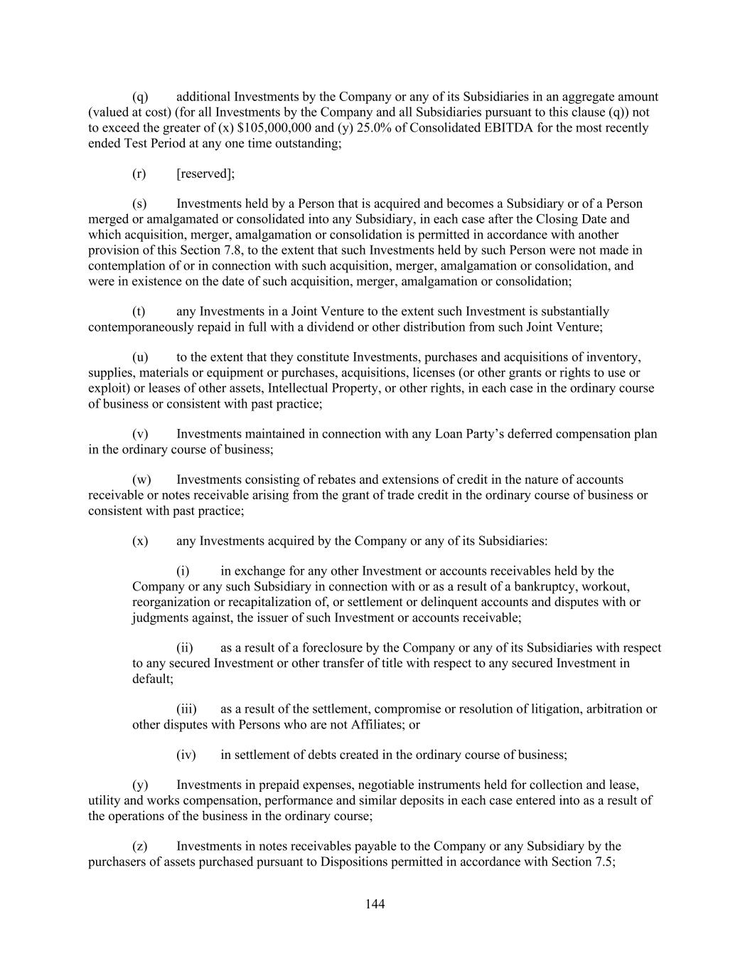 144 (q) additional Investments by the Company or any of its Subsidiaries in an aggregate amount (valued at cost) (for all Investments by the Company and all Subsidiaries pursuant to this clause (q)) not to exceed the greater of (x) $105,000,000 and (y) 25.0% of Consolidated EBITDA for the most recently ended Test Period at any one time outstanding; (r) [reserved]; (s) Investments held by a Person that is acquired and becomes a Subsidiary or of a Person merged or amalgamated or consolidated into any Subsidiary, in each case after the Closing Date and which acquisition, merger, amalgamation or consolidation is permitted in accordance with another provision of this Section 7.8, to the extent that such Investments held by such Person were not made in contemplation of or in connection with such acquisition, merger, amalgamation or consolidation, and were in existence on the date of such acquisition, merger, amalgamation or consolidation; (t) any Investments in a Joint Venture to the extent such Investment is substantially contemporaneously repaid in full with a dividend or other distribution from such Joint Venture; (u) to the extent that they constitute Investments, purchases and acquisitions of inventory, supplies, materials or equipment or purchases, acquisitions, licenses (or other grants or rights to use or exploit) or leases of other assets, Intellectual Property, or other rights, in each case in the ordinary course of business or consistent with past practice; (v) Investments maintained in connection with any Loan Party’s deferred compensation plan in the ordinary course of business; (w) Investments consisting of rebates and extensions of credit in the nature of accounts receivable or notes receivable arising from the grant of trade credit in the ordinary course of business or consistent with past practice; (x) any Investments acquired by the Company or any of its Subsidiaries: (i) in exchange for any other Investment or accounts receivables held by the Company or any such Subsidiary in connection with or as a result of a bankruptcy, workout, reorganization or recapitalization of, or settlement or delinquent accounts and disputes with or judgments against, the issuer of such Investment or accounts receivable; (ii) as a result of a foreclosure by the Company or any of its Subsidiaries with respect to any secured Investment or other transfer of title with respect to any secured Investment in default; (iii) as a result of the settlement, compromise or resolution of litigation, arbitration or other disputes with Persons who are not Affiliates; or (iv) in settlement of debts created in the ordinary course of business; (y) Investments in prepaid expenses, negotiable instruments held for collection and lease, utility and works compensation, performance and similar deposits in each case entered into as a result of the operations of the business in the ordinary course; (z) Investments in notes receivables payable to the Company or any Subsidiary by the purchasers of assets purchased pursuant to Dispositions permitted in accordance with Section 7.5;