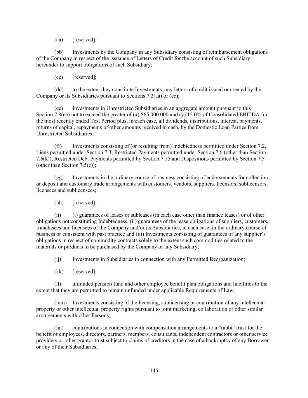 145 (aa) [reserved]; (bb) Investments by the Company in any Subsidiary consisting of reimbursement obligations of the Company in respect of the issuance of Letters of Credit for the account of such Subsidiary hereunder to support obligations of such Subsidiary; (cc) [reserved]; (dd) to the extent they constitute Investments, any letters of credit issued or created by the Company or its Subsidiaries pursuant to Sections 7.2(aa) or (cc); (ee) Investments in Unrestricted Subsidiaries in an aggregate amount pursuant to this Section 7.8(ee) not to exceed the greater of (x) $65,000,000 and (y) 15.0% of Consolidated EBITDA for the most recently ended Test Period plus, in each case, all dividends, distributions, interest, payments, returns of capital, repayments of other amounts received in cash, by the Domestic Loan Parties from Unrestricted Subsidiaries; (ff) Investments consisting of (or resulting from) Indebtedness permitted under Section 7.2, Liens permitted under Section 7.3, Restricted Payments permitted under Section 7.6 (other than Section 7.6(k)), Restricted Debt Payments permitted by Section 7.15 and Dispositions permitted by Section 7.5 (other than Section 7.5(c)); (gg) Investments in the ordinary course of business consisting of endorsements for collection or deposit and customary trade arrangements with customers, vendors, suppliers, licensors, sublicensors, licensees and sublicensees; (hh) [reserved]; (ii) (i) guarantees of leases or subleases (in each case other than finance leases) or of other obligations not constituting Indebtedness, (ii) guarantees of the lease obligations of suppliers, customers, franchisees and licensees of the Company and/or its Subsidiaries, in each case, in the ordinary course of business or consistent with past practice and (iii) Investments consisting of guarantees of any supplier’s obligations in respect of commodity contracts solely to the extent such commodities related to the materials or products to be purchased by the Company or any Subsidiary; (jj) Investments in Subsidiaries in connection with any Permitted Reorganization; (kk) [reserved]; (ll) unfunded pension fund and other employee benefit plan obligations and liabilities to the extent that they are permitted to remain unfunded under applicable Requirements of Law; (mm) Investments consisting of the licensing, sublicensing or contribution of any intellectual property or other intellectual property rights pursuant to joint marketing, collaboration or other similar arrangements with other Persons; (nn) contributions in connection with compensation arrangements to a “rabbi” trust for the benefit of employees, directors, partners, members, consultants, independent contractors or other service providers or other grantor trust subject to claims of creditors in the case of a bankruptcy of any Borrower or any of their Subsidiaries;