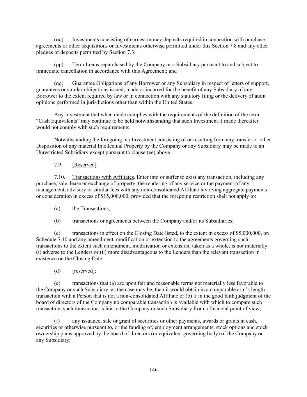 146 (oo) Investments consisting of earnest money deposits required in connection with purchase agreements or other acquisitions or Investments otherwise permitted under this Section 7.8 and any other pledges or deposits permitted by Section 7.3; (pp) Term Loans repurchased by the Company or a Subsidiary pursuant to and subject to immediate cancellation in accordance with this Agreement; and (qq) Guarantee Obligations of any Borrower or any Subsidiary in respect of letters of support, guarantees or similar obligations issued, made or incurred for the benefit of any Subsidiary of any Borrower to the extent required by law or in connection with any statutory filing or the delivery of audit opinions performed in jurisdictions other than within the United States. Any Investment that when made complies with the requirements of the definition of the term “Cash Equivalents” may continue to be held notwithstanding that such Investment if made thereafter would not comply with such requirements. Notwithstanding the foregoing, no Investment consisting of or resulting from any transfer or other Disposition of any material Intellectual Property by the Company or any Subsidiary may be made to an Unrestricted Subsidiary except pursuant to clause (ee) above. 7.9. [Reserved]. 7.10. Transactions with Affiliates. Enter into or suffer to exist any transaction, including any purchase, sale, lease or exchange of property, the rendering of any service or the payment of any management, advisory or similar fees with any non-consolidated Affiliate involving aggregate payments or consideration in excess of $15,000,000; provided that the foregoing restriction shall not apply to: (a) the Transactions; (b) transactions or agreements between the Company and/or its Subsidiaries; (c) transactions in effect on the Closing Date listed, to the extent in excess of $5,000,000, on Schedule 7.10 and any amendment, modification or extension to the agreements governing such transactions to the extent such amendment, modification or extension, taken as a whole, is not materially (i) adverse to the Lenders or (ii) more disadvantageous to the Lenders than the relevant transaction in existence on the Closing Date; (d) [reserved]; (e) transactions that (a) are upon fair and reasonable terms not materially less favorable to the Company or such Subsidiary, as the case may be, than it would obtain in a comparable arm’s length transaction with a Person that is not a non-consolidated Affiliate or (b) if in the good faith judgment of the board of directors of the Company no comparable transaction is available with which to compare such transaction, such transaction is fair to the Company or such Subsidiary from a financial point of view; (f) any issuance, sale or grant of securities or other payments, awards or grants in cash, securities or otherwise pursuant to, or the funding of, employment arrangements, stock options and stock ownership plans approved by the board of directors (or equivalent governing body) of the Company or any Subsidiary;