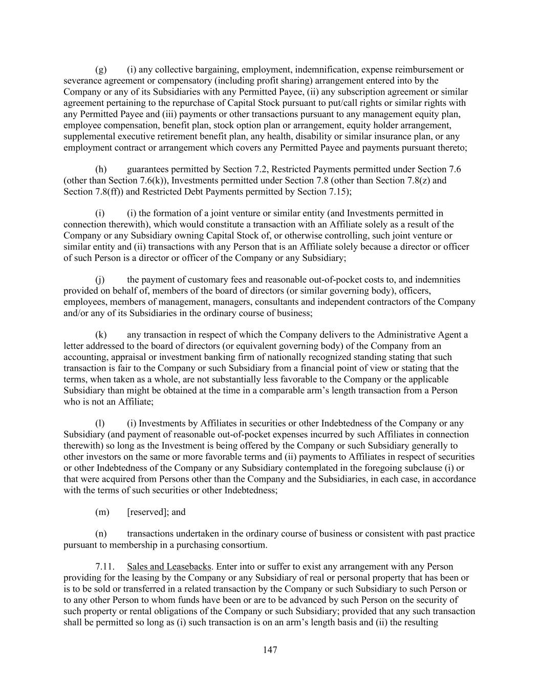 147 (g) (i) any collective bargaining, employment, indemnification, expense reimbursement or severance agreement or compensatory (including profit sharing) arrangement entered into by the Company or any of its Subsidiaries with any Permitted Payee, (ii) any subscription agreement or similar agreement pertaining to the repurchase of Capital Stock pursuant to put/call rights or similar rights with any Permitted Payee and (iii) payments or other transactions pursuant to any management equity plan, employee compensation, benefit plan, stock option plan or arrangement, equity holder arrangement, supplemental executive retirement benefit plan, any health, disability or similar insurance plan, or any employment contract or arrangement which covers any Permitted Payee and payments pursuant thereto; (h) guarantees permitted by Section 7.2, Restricted Payments permitted under Section 7.6 (other than Section 7.6(k)), Investments permitted under Section 7.8 (other than Section 7.8(z) and Section 7.8(ff)) and Restricted Debt Payments permitted by Section 7.15); (i) (i) the formation of a joint venture or similar entity (and Investments permitted in connection therewith), which would constitute a transaction with an Affiliate solely as a result of the Company or any Subsidiary owning Capital Stock of, or otherwise controlling, such joint venture or similar entity and (ii) transactions with any Person that is an Affiliate solely because a director or officer of such Person is a director or officer of the Company or any Subsidiary; (j) the payment of customary fees and reasonable out-of-pocket costs to, and indemnities provided on behalf of, members of the board of directors (or similar governing body), officers, employees, members of management, managers, consultants and independent contractors of the Company and/or any of its Subsidiaries in the ordinary course of business; (k) any transaction in respect of which the Company delivers to the Administrative Agent a letter addressed to the board of directors (or equivalent governing body) of the Company from an accounting, appraisal or investment banking firm of nationally recognized standing stating that such transaction is fair to the Company or such Subsidiary from a financial point of view or stating that the terms, when taken as a whole, are not substantially less favorable to the Company or the applicable Subsidiary than might be obtained at the time in a comparable arm’s length transaction from a Person who is not an Affiliate; (l) (i) Investments by Affiliates in securities or other Indebtedness of the Company or any Subsidiary (and payment of reasonable out-of-pocket expenses incurred by such Affiliates in connection therewith) so long as the Investment is being offered by the Company or such Subsidiary generally to other investors on the same or more favorable terms and (ii) payments to Affiliates in respect of securities or other Indebtedness of the Company or any Subsidiary contemplated in the foregoing subclause (i) or that were acquired from Persons other than the Company and the Subsidiaries, in each case, in accordance with the terms of such securities or other Indebtedness; (m) [reserved]; and (n) transactions undertaken in the ordinary course of business or consistent with past practice pursuant to membership in a purchasing consortium. 7.11. Sales and Leasebacks. Enter into or suffer to exist any arrangement with any Person providing for the leasing by the Company or any Subsidiary of real or personal property that has been or is to be sold or transferred in a related transaction by the Company or such Subsidiary to such Person or to any other Person to whom funds have been or are to be advanced by such Person on the security of such property or rental obligations of the Company or such Subsidiary; provided that any such transaction shall be permitted so long as (i) such transaction is on an arm’s length basis and (ii) the resulting