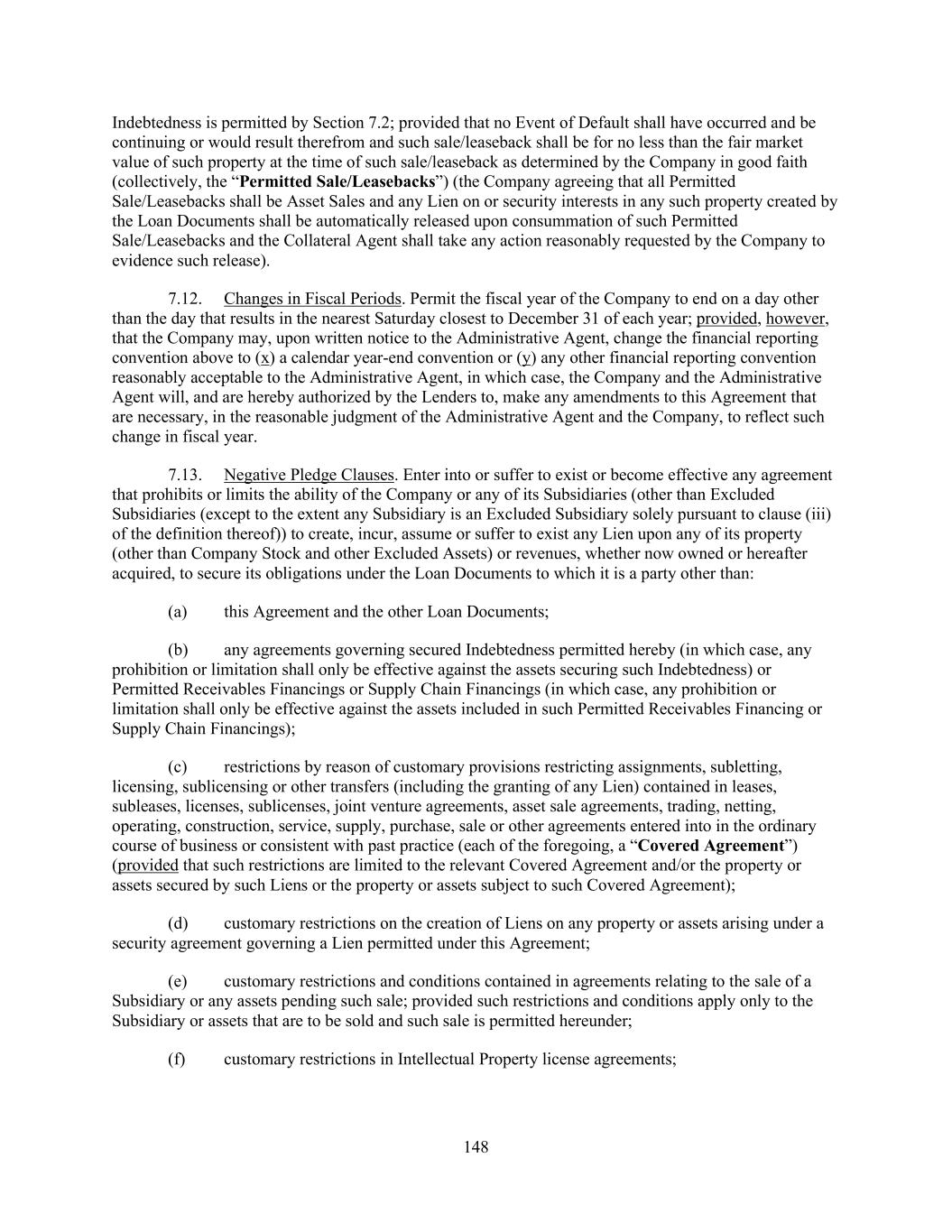 148 Indebtedness is permitted by Section 7.2; provided that no Event of Default shall have occurred and be continuing or would result therefrom and such sale/leaseback shall be for no less than the fair market value of such property at the time of such sale/leaseback as determined by the Company in good faith (collectively, the “Permitted Sale/Leasebacks”) (the Company agreeing that all Permitted Sale/Leasebacks shall be Asset Sales and any Lien on or security interests in any such property created by the Loan Documents shall be automatically released upon consummation of such Permitted Sale/Leasebacks and the Collateral Agent shall take any action reasonably requested by the Company to evidence such release). 7.12. Changes in Fiscal Periods. Permit the fiscal year of the Company to end on a day other than the day that results in the nearest Saturday closest to December 31 of each year; provided, however, that the Company may, upon written notice to the Administrative Agent, change the financial reporting convention above to (x) a calendar year-end convention or (y) any other financial reporting convention reasonably acceptable to the Administrative Agent, in which case, the Company and the Administrative Agent will, and are hereby authorized by the Lenders to, make any amendments to this Agreement that are necessary, in the reasonable judgment of the Administrative Agent and the Company, to reflect such change in fiscal year. 7.13. Negative Pledge Clauses. Enter into or suffer to exist or become effective any agreement that prohibits or limits the ability of the Company or any of its Subsidiaries (other than Excluded Subsidiaries (except to the extent any Subsidiary is an Excluded Subsidiary solely pursuant to clause (iii) of the definition thereof)) to create, incur, assume or suffer to exist any Lien upon any of its property (other than Company Stock and other Excluded Assets) or revenues, whether now owned or hereafter acquired, to secure its obligations under the Loan Documents to which it is a party other than: (a) this Agreement and the other Loan Documents; (b) any agreements governing secured Indebtedness permitted hereby (in which case, any prohibition or limitation shall only be effective against the assets securing such Indebtedness) or Permitted Receivables Financings or Supply Chain Financings (in which case, any prohibition or limitation shall only be effective against the assets included in such Permitted Receivables Financing or Supply Chain Financings); (c) restrictions by reason of customary provisions restricting assignments, subletting, licensing, sublicensing or other transfers (including the granting of any Lien) contained in leases, subleases, licenses, sublicenses, joint venture agreements, asset sale agreements, trading, netting, operating, construction, service, supply, purchase, sale or other agreements entered into in the ordinary course of business or consistent with past practice (each of the foregoing, a “Covered Agreement”) (provided that such restrictions are limited to the relevant Covered Agreement and/or the property or assets secured by such Liens or the property or assets subject to such Covered Agreement); (d) customary restrictions on the creation of Liens on any property or assets arising under a security agreement governing a Lien permitted under this Agreement; (e) customary restrictions and conditions contained in agreements relating to the sale of a Subsidiary or any assets pending such sale; provided such restrictions and conditions apply only to the Subsidiary or assets that are to be sold and such sale is permitted hereunder; (f) customary restrictions in Intellectual Property license agreements;