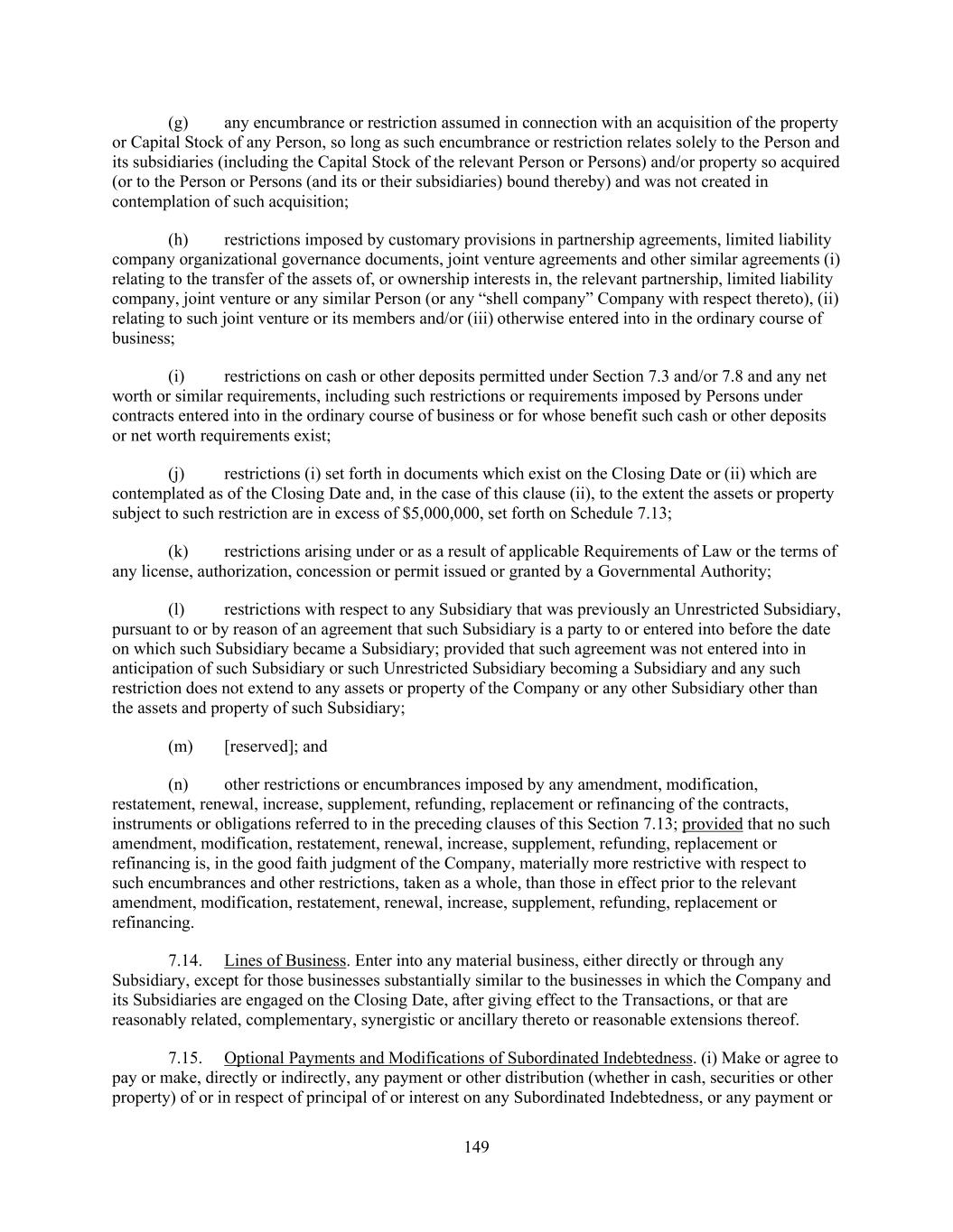 149 (g) any encumbrance or restriction assumed in connection with an acquisition of the property or Capital Stock of any Person, so long as such encumbrance or restriction relates solely to the Person and its subsidiaries (including the Capital Stock of the relevant Person or Persons) and/or property so acquired (or to the Person or Persons (and its or their subsidiaries) bound thereby) and was not created in contemplation of such acquisition; (h) restrictions imposed by customary provisions in partnership agreements, limited liability company organizational governance documents, joint venture agreements and other similar agreements (i) relating to the transfer of the assets of, or ownership interests in, the relevant partnership, limited liability company, joint venture or any similar Person (or any “shell company” Company with respect thereto), (ii) relating to such joint venture or its members and/or (iii) otherwise entered into in the ordinary course of business; (i) restrictions on cash or other deposits permitted under Section 7.3 and/or 7.8 and any net worth or similar requirements, including such restrictions or requirements imposed by Persons under contracts entered into in the ordinary course of business or for whose benefit such cash or other deposits or net worth requirements exist; (j) restrictions (i) set forth in documents which exist on the Closing Date or (ii) which are contemplated as of the Closing Date and, in the case of this clause (ii), to the extent the assets or property subject to such restriction are in excess of $5,000,000, set forth on Schedule 7.13; (k) restrictions arising under or as a result of applicable Requirements of Law or the terms of any license, authorization, concession or permit issued or granted by a Governmental Authority; (l) restrictions with respect to any Subsidiary that was previously an Unrestricted Subsidiary, pursuant to or by reason of an agreement that such Subsidiary is a party to or entered into before the date on which such Subsidiary became a Subsidiary; provided that such agreement was not entered into in anticipation of such Subsidiary or such Unrestricted Subsidiary becoming a Subsidiary and any such restriction does not extend to any assets or property of the Company or any other Subsidiary other than the assets and property of such Subsidiary; (m) [reserved]; and (n) other restrictions or encumbrances imposed by any amendment, modification, restatement, renewal, increase, supplement, refunding, replacement or refinancing of the contracts, instruments or obligations referred to in the preceding clauses of this Section 7.13; provided that no such amendment, modification, restatement, renewal, increase, supplement, refunding, replacement or refinancing is, in the good faith judgment of the Company, materially more restrictive with respect to such encumbrances and other restrictions, taken as a whole, than those in effect prior to the relevant amendment, modification, restatement, renewal, increase, supplement, refunding, replacement or refinancing. 7.14. Lines of Business. Enter into any material business, either directly or through any Subsidiary, except for those businesses substantially similar to the businesses in which the Company and its Subsidiaries are engaged on the Closing Date, after giving effect to the Transactions, or that are reasonably related, complementary, synergistic or ancillary thereto or reasonable extensions thereof. 7.15. Optional Payments and Modifications of Subordinated Indebtedness. (i) Make or agree to pay or make, directly or indirectly, any payment or other distribution (whether in cash, securities or other property) of or in respect of principal of or interest on any Subordinated Indebtedness, or any payment or
