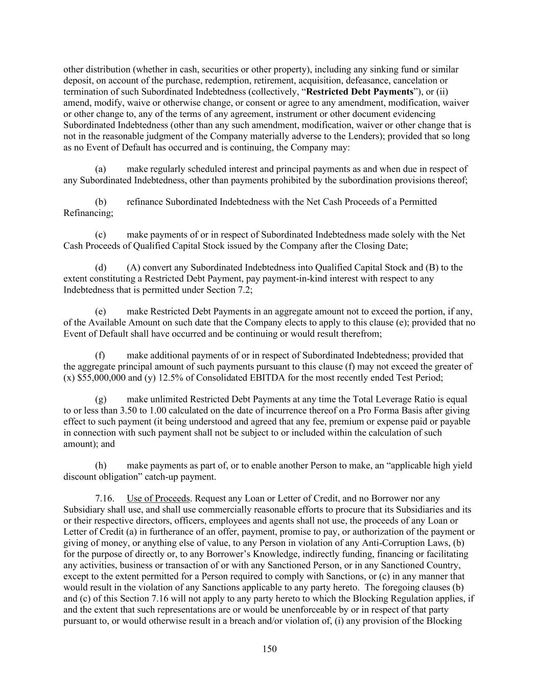 150 other distribution (whether in cash, securities or other property), including any sinking fund or similar deposit, on account of the purchase, redemption, retirement, acquisition, defeasance, cancelation or termination of such Subordinated Indebtedness (collectively, “Restricted Debt Payments”), or (ii) amend, modify, waive or otherwise change, or consent or agree to any amendment, modification, waiver or other change to, any of the terms of any agreement, instrument or other document evidencing Subordinated Indebtedness (other than any such amendment, modification, waiver or other change that is not in the reasonable judgment of the Company materially adverse to the Lenders); provided that so long as no Event of Default has occurred and is continuing, the Company may: (a) make regularly scheduled interest and principal payments as and when due in respect of any Subordinated Indebtedness, other than payments prohibited by the subordination provisions thereof; (b) refinance Subordinated Indebtedness with the Net Cash Proceeds of a Permitted Refinancing; (c) make payments of or in respect of Subordinated Indebtedness made solely with the Net Cash Proceeds of Qualified Capital Stock issued by the Company after the Closing Date; (d) (A) convert any Subordinated Indebtedness into Qualified Capital Stock and (B) to the extent constituting a Restricted Debt Payment, pay payment-in-kind interest with respect to any Indebtedness that is permitted under Section 7.2; (e) make Restricted Debt Payments in an aggregate amount not to exceed the portion, if any, of the Available Amount on such date that the Company elects to apply to this clause (e); provided that no Event of Default shall have occurred and be continuing or would result therefrom; (f) make additional payments of or in respect of Subordinated Indebtedness; provided that the aggregate principal amount of such payments pursuant to this clause (f) may not exceed the greater of (x) $55,000,000 and (y) 12.5% of Consolidated EBITDA for the most recently ended Test Period; (g) make unlimited Restricted Debt Payments at any time the Total Leverage Ratio is equal to or less than 3.50 to 1.00 calculated on the date of incurrence thereof on a Pro Forma Basis after giving effect to such payment (it being understood and agreed that any fee, premium or expense paid or payable in connection with such payment shall not be subject to or included within the calculation of such amount); and (h) make payments as part of, or to enable another Person to make, an “applicable high yield discount obligation” catch-up payment. 7.16. Use of Proceeds. Request any Loan or Letter of Credit, and no Borrower nor any Subsidiary shall use, and shall use commercially reasonable efforts to procure that its Subsidiaries and its or their respective directors, officers, employees and agents shall not use, the proceeds of any Loan or Letter of Credit (a) in furtherance of an offer, payment, promise to pay, or authorization of the payment or giving of money, or anything else of value, to any Person in violation of any Anti-Corruption Laws, (b) for the purpose of directly or, to any Borrower’s Knowledge, indirectly funding, financing or facilitating any activities, business or transaction of or with any Sanctioned Person, or in any Sanctioned Country, except to the extent permitted for a Person required to comply with Sanctions, or (c) in any manner that would result in the violation of any Sanctions applicable to any party hereto. The foregoing clauses (b) and (c) of this Section 7.16 will not apply to any party hereto to which the Blocking Regulation applies, if and the extent that such representations are or would be unenforceable by or in respect of that party pursuant to, or would otherwise result in a breach and/or violation of, (i) any provision of the Blocking