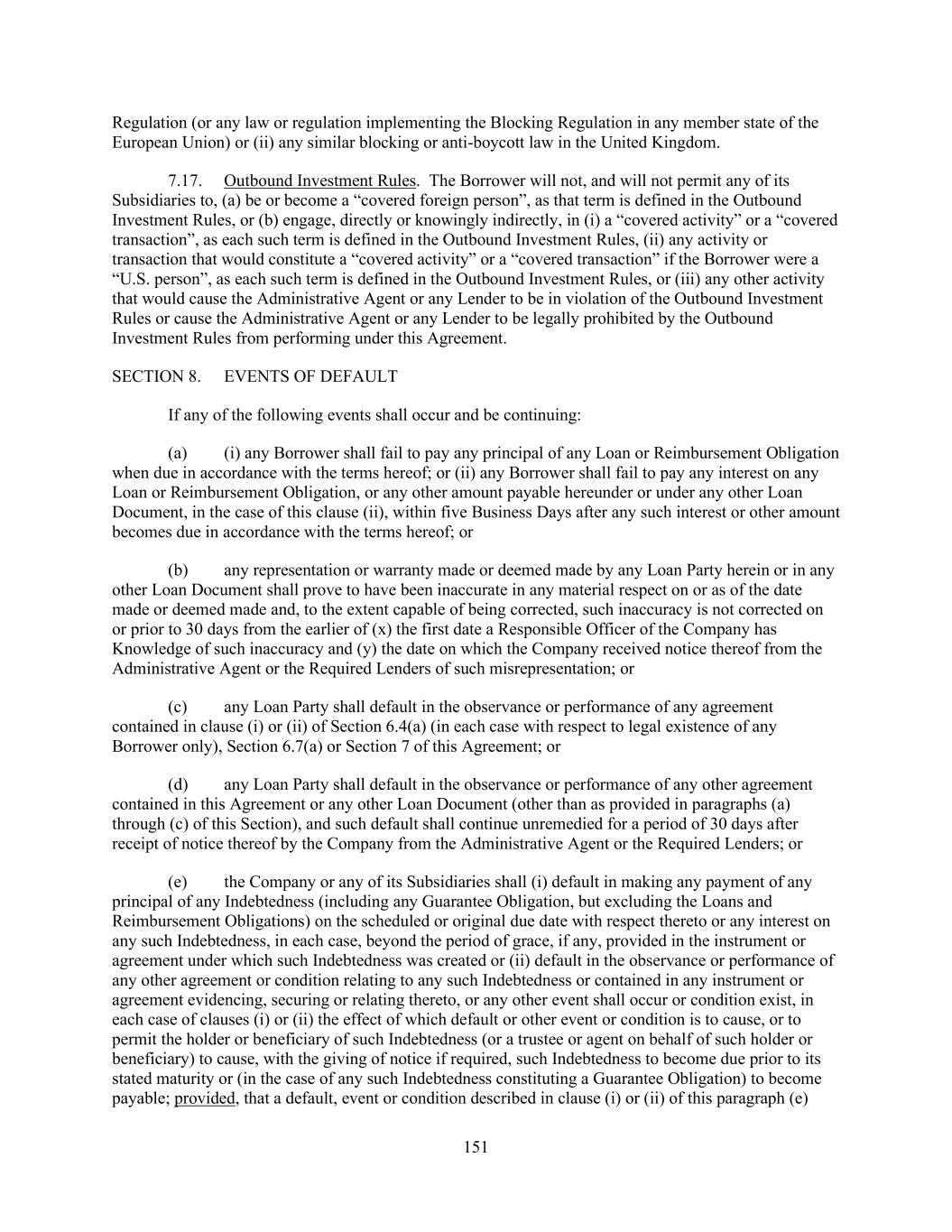 151 Regulation (or any law or regulation implementing the Blocking Regulation in any member state of the European Union) or (ii) any similar blocking or anti-boycott law in the United Kingdom. 7.17. Outbound Investment Rules. The Borrower will not, and will not permit any of its Subsidiaries to, (a) be or become a “covered foreign person”, as that term is defined in the Outbound Investment Rules, or (b) engage, directly or knowingly indirectly, in (i) a “covered activity” or a “covered transaction”, as each such term is defined in the Outbound Investment Rules, (ii) any activity or transaction that would constitute a “covered activity” or a “covered transaction” if the Borrower were a “U.S. person”, as each such term is defined in the Outbound Investment Rules, or (iii) any other activity that would cause the Administrative Agent or any Lender to be in violation of the Outbound Investment Rules or cause the Administrative Agent or any Lender to be legally prohibited by the Outbound Investment Rules from performing under this Agreement. SECTION 8. EVENTS OF DEFAULT If any of the following events shall occur and be continuing: (a) (i) any Borrower shall fail to pay any principal of any Loan or Reimbursement Obligation when due in accordance with the terms hereof; or (ii) any Borrower shall fail to pay any interest on any Loan or Reimbursement Obligation, or any other amount payable hereunder or under any other Loan Document, in the case of this clause (ii), within five Business Days after any such interest or other amount becomes due in accordance with the terms hereof; or (b) any representation or warranty made or deemed made by any Loan Party herein or in any other Loan Document shall prove to have been inaccurate in any material respect on or as of the date made or deemed made and, to the extent capable of being corrected, such inaccuracy is not corrected on or prior to 30 days from the earlier of (x) the first date a Responsible Officer of the Company has Knowledge of such inaccuracy and (y) the date on which the Company received notice thereof from the Administrative Agent or the Required Lenders of such misrepresentation; or (c) any Loan Party shall default in the observance or performance of any agreement contained in clause (i) or (ii) of Section 6.4(a) (in each case with respect to legal existence of any Borrower only), Section 6.7(a) or Section 7 of this Agreement; or (d) any Loan Party shall default in the observance or performance of any other agreement contained in this Agreement or any other Loan Document (other than as provided in paragraphs (a) through (c) of this Section), and such default shall continue unremedied for a period of 30 days after receipt of notice thereof by the Company from the Administrative Agent or the Required Lenders; or (e) the Company or any of its Subsidiaries shall (i) default in making any payment of any principal of any Indebtedness (including any Guarantee Obligation, but excluding the Loans and Reimbursement Obligations) on the scheduled or original due date with respect thereto or any interest on any such Indebtedness, in each case, beyond the period of grace, if any, provided in the instrument or agreement under which such Indebtedness was created or (ii) default in the observance or performance of any other agreement or condition relating to any such Indebtedness or contained in any instrument or agreement evidencing, securing or relating thereto, or any other event shall occur or condition exist, in each case of clauses (i) or (ii) the effect of which default or other event or condition is to cause, or to permit the holder or beneficiary of such Indebtedness (or a trustee or agent on behalf of such holder or beneficiary) to cause, with the giving of notice if required, such Indebtedness to become due prior to its stated maturity or (in the case of any such Indebtedness constituting a Guarantee Obligation) to become payable; provided, that a default, event or condition described in clause (i) or (ii) of this paragraph (e)