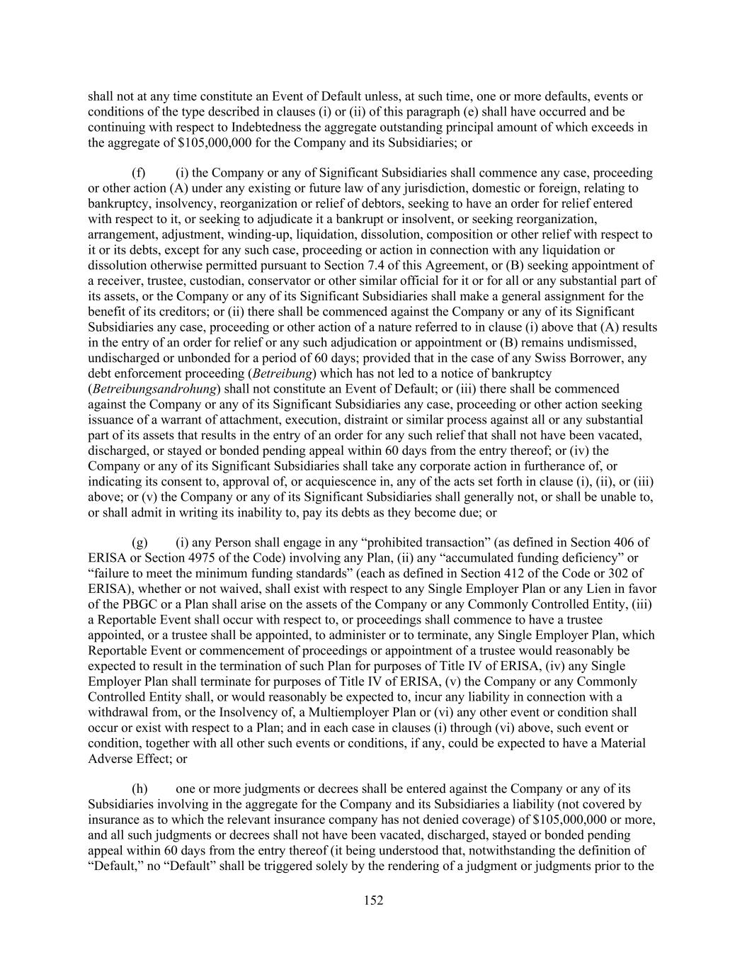 152 shall not at any time constitute an Event of Default unless, at such time, one or more defaults, events or conditions of the type described in clauses (i) or (ii) of this paragraph (e) shall have occurred and be continuing with respect to Indebtedness the aggregate outstanding principal amount of which exceeds in the aggregate of $105,000,000 for the Company and its Subsidiaries; or (f) (i) the Company or any of Significant Subsidiaries shall commence any case, proceeding or other action (A) under any existing or future law of any jurisdiction, domestic or foreign, relating to bankruptcy, insolvency, reorganization or relief of debtors, seeking to have an order for relief entered with respect to it, or seeking to adjudicate it a bankrupt or insolvent, or seeking reorganization, arrangement, adjustment, winding-up, liquidation, dissolution, composition or other relief with respect to it or its debts, except for any such case, proceeding or action in connection with any liquidation or dissolution otherwise permitted pursuant to Section 7.4 of this Agreement, or (B) seeking appointment of a receiver, trustee, custodian, conservator or other similar official for it or for all or any substantial part of its assets, or the Company or any of its Significant Subsidiaries shall make a general assignment for the benefit of its creditors; or (ii) there shall be commenced against the Company or any of its Significant Subsidiaries any case, proceeding or other action of a nature referred to in clause (i) above that (A) results in the entry of an order for relief or any such adjudication or appointment or (B) remains undismissed, undischarged or unbonded for a period of 60 days; provided that in the case of any Swiss Borrower, any debt enforcement proceeding (Betreibung) which has not led to a notice of bankruptcy (Betreibungsandrohung) shall not constitute an Event of Default; or (iii) there shall be commenced against the Company or any of its Significant Subsidiaries any case, proceeding or other action seeking issuance of a warrant of attachment, execution, distraint or similar process against all or any substantial part of its assets that results in the entry of an order for any such relief that shall not have been vacated, discharged, or stayed or bonded pending appeal within 60 days from the entry thereof; or (iv) the Company or any of its Significant Subsidiaries shall take any corporate action in furtherance of, or indicating its consent to, approval of, or acquiescence in, any of the acts set forth in clause (i), (ii), or (iii) above; or (v) the Company or any of its Significant Subsidiaries shall generally not, or shall be unable to, or shall admit in writing its inability to, pay its debts as they become due; or (g) (i) any Person shall engage in any “prohibited transaction” (as defined in Section 406 of ERISA or Section 4975 of the Code) involving any Plan, (ii) any “accumulated funding deficiency” or “failure to meet the minimum funding standards” (each as defined in Section 412 of the Code or 302 of ERISA), whether or not waived, shall exist with respect to any Single Employer Plan or any Lien in favor of the PBGC or a Plan shall arise on the assets of the Company or any Commonly Controlled Entity, (iii) a Reportable Event shall occur with respect to, or proceedings shall commence to have a trustee appointed, or a trustee shall be appointed, to administer or to terminate, any Single Employer Plan, which Reportable Event or commencement of proceedings or appointment of a trustee would reasonably be expected to result in the termination of such Plan for purposes of Title IV of ERISA, (iv) any Single Employer Plan shall terminate for purposes of Title IV of ERISA, (v) the Company or any Commonly Controlled Entity shall, or would reasonably be expected to, incur any liability in connection with a withdrawal from, or the Insolvency of, a Multiemployer Plan or (vi) any other event or condition shall occur or exist with respect to a Plan; and in each case in clauses (i) through (vi) above, such event or condition, together with all other such events or conditions, if any, could be expected to have a Material Adverse Effect; or (h) one or more judgments or decrees shall be entered against the Company or any of its Subsidiaries involving in the aggregate for the Company and its Subsidiaries a liability (not covered by insurance as to which the relevant insurance company has not denied coverage) of $105,000,000 or more, and all such judgments or decrees shall not have been vacated, discharged, stayed or bonded pending appeal within 60 days from the entry thereof (it being understood that, notwithstanding the definition of “Default,” no “Default” shall be triggered solely by the rendering of a judgment or judgments prior to the