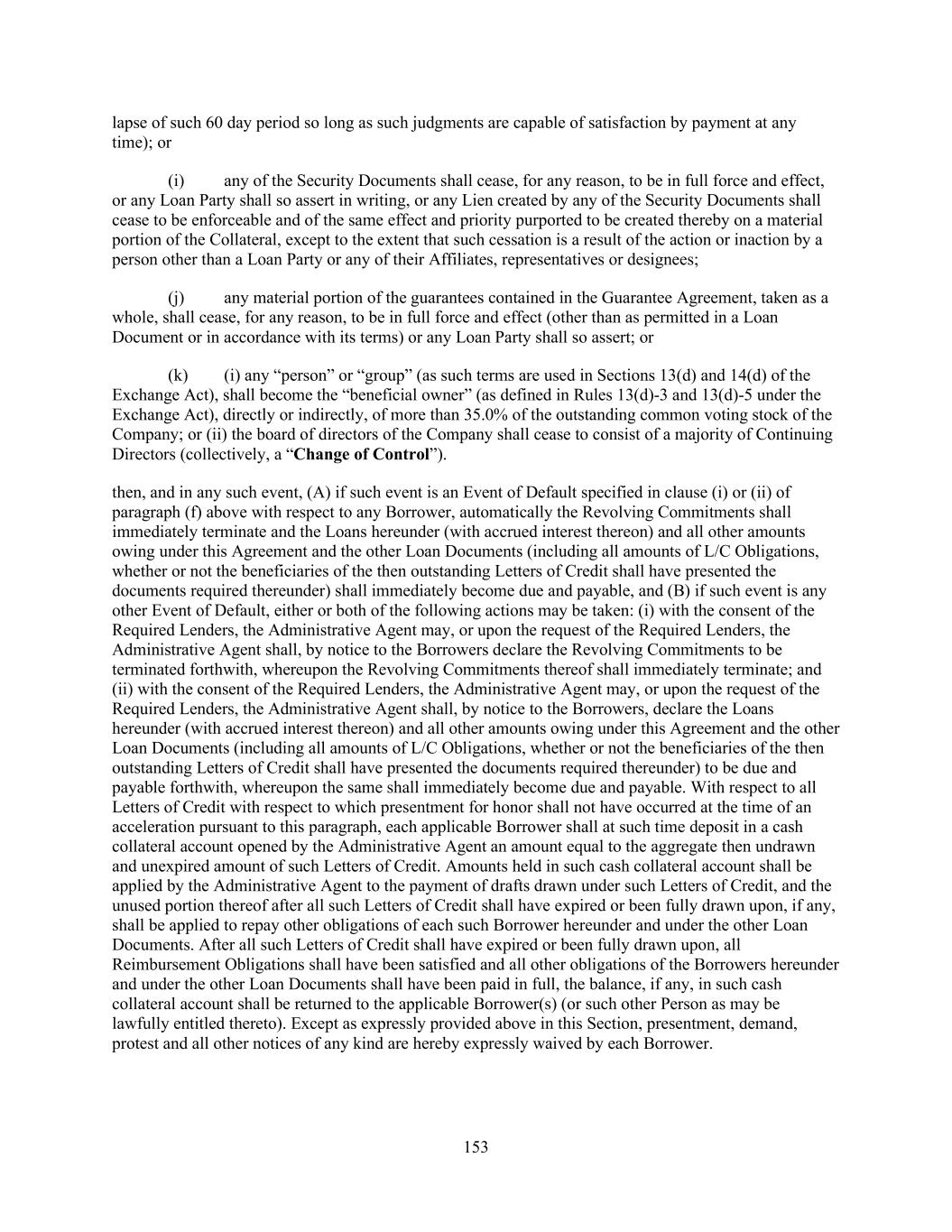153 lapse of such 60 day period so long as such judgments are capable of satisfaction by payment at any time); or (i) any of the Security Documents shall cease, for any reason, to be in full force and effect, or any Loan Party shall so assert in writing, or any Lien created by any of the Security Documents shall cease to be enforceable and of the same effect and priority purported to be created thereby on a material portion of the Collateral, except to the extent that such cessation is a result of the action or inaction by a person other than a Loan Party or any of their Affiliates, representatives or designees; (j) any material portion of the guarantees contained in the Guarantee Agreement, taken as a whole, shall cease, for any reason, to be in full force and effect (other than as permitted in a Loan Document or in accordance with its terms) or any Loan Party shall so assert; or (k) (i) any “person” or “group” (as such terms are used in Sections 13(d) and 14(d) of the Exchange Act), shall become the “beneficial owner” (as defined in Rules 13(d)-3 and 13(d)-5 under the Exchange Act), directly or indirectly, of more than 35.0% of the outstanding common voting stock of the Company; or (ii) the board of directors of the Company shall cease to consist of a majority of Continuing Directors (collectively, a “Change of Control”). then, and in any such event, (A) if such event is an Event of Default specified in clause (i) or (ii) of paragraph (f) above with respect to any Borrower, automatically the Revolving Commitments shall immediately terminate and the Loans hereunder (with accrued interest thereon) and all other amounts owing under this Agreement and the other Loan Documents (including all amounts of L/C Obligations, whether or not the beneficiaries of the then outstanding Letters of Credit shall have presented the documents required thereunder) shall immediately become due and payable, and (B) if such event is any other Event of Default, either or both of the following actions may be taken: (i) with the consent of the Required Lenders, the Administrative Agent may, or upon the request of the Required Lenders, the Administrative Agent shall, by notice to the Borrowers declare the Revolving Commitments to be terminated forthwith, whereupon the Revolving Commitments thereof shall immediately terminate; and (ii) with the consent of the Required Lenders, the Administrative Agent may, or upon the request of the Required Lenders, the Administrative Agent shall, by notice to the Borrowers, declare the Loans hereunder (with accrued interest thereon) and all other amounts owing under this Agreement and the other Loan Documents (including all amounts of L/C Obligations, whether or not the beneficiaries of the then outstanding Letters of Credit shall have presented the documents required thereunder) to be due and payable forthwith, whereupon the same shall immediately become due and payable. With respect to all Letters of Credit with respect to which presentment for honor shall not have occurred at the time of an acceleration pursuant to this paragraph, each applicable Borrower shall at such time deposit in a cash collateral account opened by the Administrative Agent an amount equal to the aggregate then undrawn and unexpired amount of such Letters of Credit. Amounts held in such cash collateral account shall be applied by the Administrative Agent to the payment of drafts drawn under such Letters of Credit, and the unused portion thereof after all such Letters of Credit shall have expired or been fully drawn upon, if any, shall be applied to repay other obligations of each such Borrower hereunder and under the other Loan Documents. After all such Letters of Credit shall have expired or been fully drawn upon, all Reimbursement Obligations shall have been satisfied and all other obligations of the Borrowers hereunder and under the other Loan Documents shall have been paid in full, the balance, if any, in such cash collateral account shall be returned to the applicable Borrower(s) (or such other Person as may be lawfully entitled thereto). Except as expressly provided above in this Section, presentment, demand, protest and all other notices of any kind are hereby expressly waived by each Borrower.