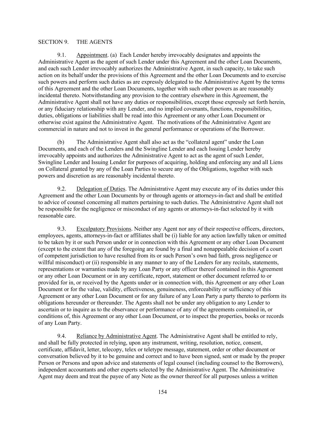 154 SECTION 9. THE AGENTS 9.1. Appointment. (a) Each Lender hereby irrevocably designates and appoints the Administrative Agent as the agent of such Lender under this Agreement and the other Loan Documents, and each such Lender irrevocably authorizes the Administrative Agent, in such capacity, to take such action on its behalf under the provisions of this Agreement and the other Loan Documents and to exercise such powers and perform such duties as are expressly delegated to the Administrative Agent by the terms of this Agreement and the other Loan Documents, together with such other powers as are reasonably incidental thereto. Notwithstanding any provision to the contrary elsewhere in this Agreement, the Administrative Agent shall not have any duties or responsibilities, except those expressly set forth herein, or any fiduciary relationship with any Lender, and no implied covenants, functions, responsibilities, duties, obligations or liabilities shall be read into this Agreement or any other Loan Document or otherwise exist against the Administrative Agent. The motivations of the Administrative Agent are commercial in nature and not to invest in the general performance or operations of the Borrower. (b) The Administrative Agent shall also act as the “collateral agent” under the Loan Documents, and each of the Lenders and the Swingline Lender and each Issuing Lender hereby irrevocably appoints and authorizes the Administrative Agent to act as the agent of such Lender, Swingline Lender and Issuing Lender for purposes of acquiring, holding and enforcing any and all Liens on Collateral granted by any of the Loan Parties to secure any of the Obligations, together with such powers and discretion as are reasonably incidental thereto. 9.2. Delegation of Duties. The Administrative Agent may execute any of its duties under this Agreement and the other Loan Documents by or through agents or attorneys-in-fact and shall be entitled to advice of counsel concerning all matters pertaining to such duties. The Administrative Agent shall not be responsible for the negligence or misconduct of any agents or attorneys-in-fact selected by it with reasonable care. 9.3. Exculpatory Provisions. Neither any Agent nor any of their respective officers, directors, employees, agents, attorneys-in-fact or affiliates shall be (i) liable for any action lawfully taken or omitted to be taken by it or such Person under or in connection with this Agreement or any other Loan Document (except to the extent that any of the foregoing are found by a final and nonappealable decision of a court of competent jurisdiction to have resulted from its or such Person’s own bad faith, gross negligence or willful misconduct) or (ii) responsible in any manner to any of the Lenders for any recitals, statements, representations or warranties made by any Loan Party or any officer thereof contained in this Agreement or any other Loan Document or in any certificate, report, statement or other document referred to or provided for in, or received by the Agents under or in connection with, this Agreement or any other Loan Document or for the value, validity, effectiveness, genuineness, enforceability or sufficiency of this Agreement or any other Loan Document or for any failure of any Loan Party a party thereto to perform its obligations hereunder or thereunder. The Agents shall not be under any obligation to any Lender to ascertain or to inquire as to the observance or performance of any of the agreements contained in, or conditions of, this Agreement or any other Loan Document, or to inspect the properties, books or records of any Loan Party. 9.4. Reliance by Administrative Agent. The Administrative Agent shall be entitled to rely, and shall be fully protected in relying, upon any instrument, writing, resolution, notice, consent, certificate, affidavit, letter, telecopy, telex or teletype message, statement, order or other document or conversation believed by it to be genuine and correct and to have been signed, sent or made by the proper Person or Persons and upon advice and statements of legal counsel (including counsel to the Borrowers), independent accountants and other experts selected by the Administrative Agent. The Administrative Agent may deem and treat the payee of any Note as the owner thereof for all purposes unless a written
