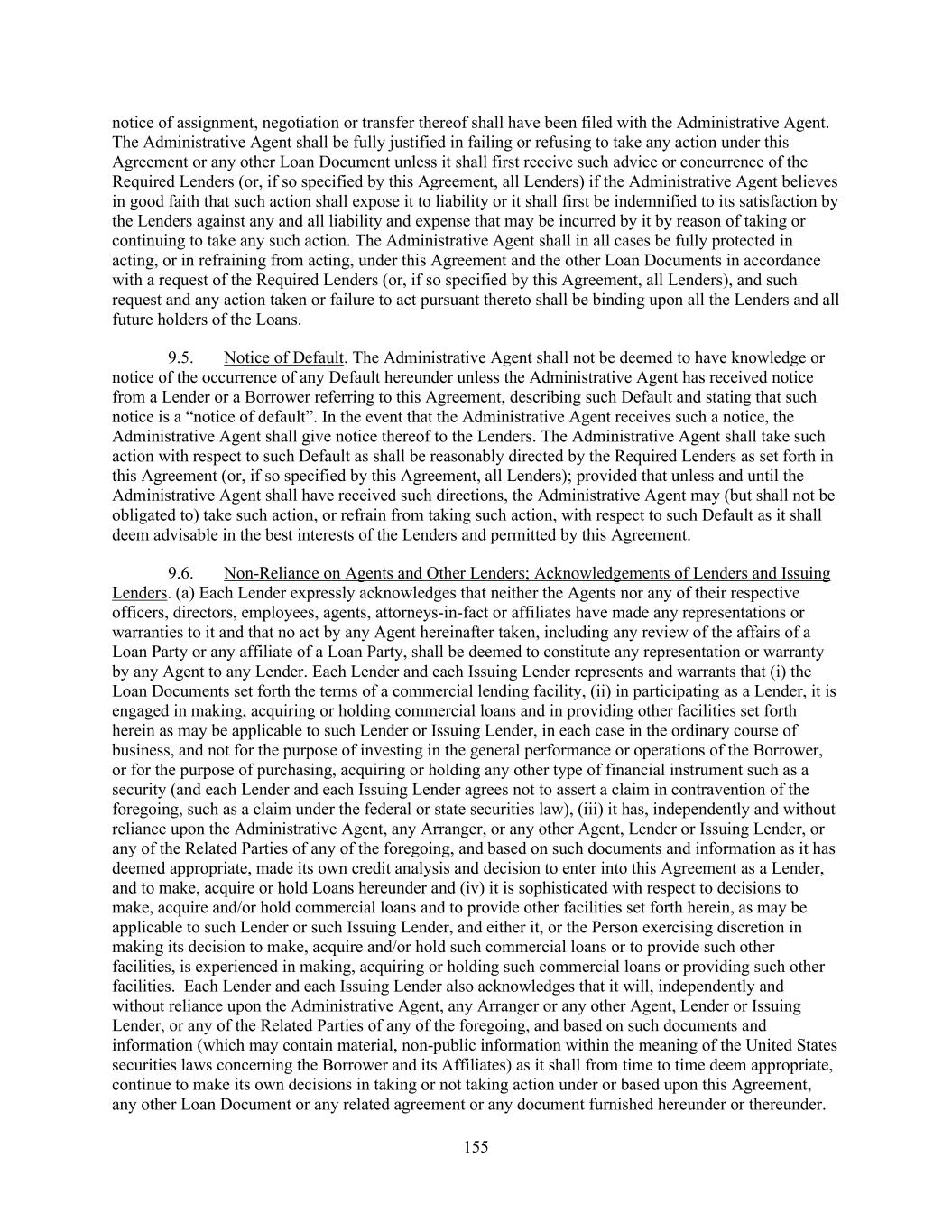 155 notice of assignment, negotiation or transfer thereof shall have been filed with the Administrative Agent. The Administrative Agent shall be fully justified in failing or refusing to take any action under this Agreement or any other Loan Document unless it shall first receive such advice or concurrence of the Required Lenders (or, if so specified by this Agreement, all Lenders) if the Administrative Agent believes in good faith that such action shall expose it to liability or it shall first be indemnified to its satisfaction by the Lenders against any and all liability and expense that may be incurred by it by reason of taking or continuing to take any such action. The Administrative Agent shall in all cases be fully protected in acting, or in refraining from acting, under this Agreement and the other Loan Documents in accordance with a request of the Required Lenders (or, if so specified by this Agreement, all Lenders), and such request and any action taken or failure to act pursuant thereto shall be binding upon all the Lenders and all future holders of the Loans. 9.5. Notice of Default. The Administrative Agent shall not be deemed to have knowledge or notice of the occurrence of any Default hereunder unless the Administrative Agent has received notice from a Lender or a Borrower referring to this Agreement, describing such Default and stating that such notice is a “notice of default”. In the event that the Administrative Agent receives such a notice, the Administrative Agent shall give notice thereof to the Lenders. The Administrative Agent shall take such action with respect to such Default as shall be reasonably directed by the Required Lenders as set forth in this Agreement (or, if so specified by this Agreement, all Lenders); provided that unless and until the Administrative Agent shall have received such directions, the Administrative Agent may (but shall not be obligated to) take such action, or refrain from taking such action, with respect to such Default as it shall deem advisable in the best interests of the Lenders and permitted by this Agreement. 9.6. Non-Reliance on Agents and Other Lenders; Acknowledgements of Lenders and Issuing Lenders. (a) Each Lender expressly acknowledges that neither the Agents nor any of their respective officers, directors, employees, agents, attorneys-in-fact or affiliates have made any representations or warranties to it and that no act by any Agent hereinafter taken, including any review of the affairs of a Loan Party or any affiliate of a Loan Party, shall be deemed to constitute any representation or warranty by any Agent to any Lender. Each Lender and each Issuing Lender represents and warrants that (i) the Loan Documents set forth the terms of a commercial lending facility, (ii) in participating as a Lender, it is engaged in making, acquiring or holding commercial loans and in providing other facilities set forth herein as may be applicable to such Lender or Issuing Lender, in each case in the ordinary course of business, and not for the purpose of investing in the general performance or operations of the Borrower, or for the purpose of purchasing, acquiring or holding any other type of financial instrument such as a security (and each Lender and each Issuing Lender agrees not to assert a claim in contravention of the foregoing, such as a claim under the federal or state securities law), (iii) it has, independently and without reliance upon the Administrative Agent, any Arranger, or any other Agent, Lender or Issuing Lender, or any of the Related Parties of any of the foregoing, and based on such documents and information as it has deemed appropriate, made its own credit analysis and decision to enter into this Agreement as a Lender, and to make, acquire or hold Loans hereunder and (iv) it is sophisticated with respect to decisions to make, acquire and/or hold commercial loans and to provide other facilities set forth herein, as may be applicable to such Lender or such Issuing Lender, and either it, or the Person exercising discretion in making its decision to make, acquire and/or hold such commercial loans or to provide such other facilities, is experienced in making, acquiring or holding such commercial loans or providing such other facilities. Each Lender and each Issuing Lender also acknowledges that it will, independently and without reliance upon the Administrative Agent, any Arranger or any other Agent, Lender or Issuing Lender, or any of the Related Parties of any of the foregoing, and based on such documents and information (which may contain material, non-public information within the meaning of the United States securities laws concerning the Borrower and its Affiliates) as it shall from time to time deem appropriate, continue to make its own decisions in taking or not taking action under or based upon this Agreement, any other Loan Document or any related agreement or any document furnished hereunder or thereunder.