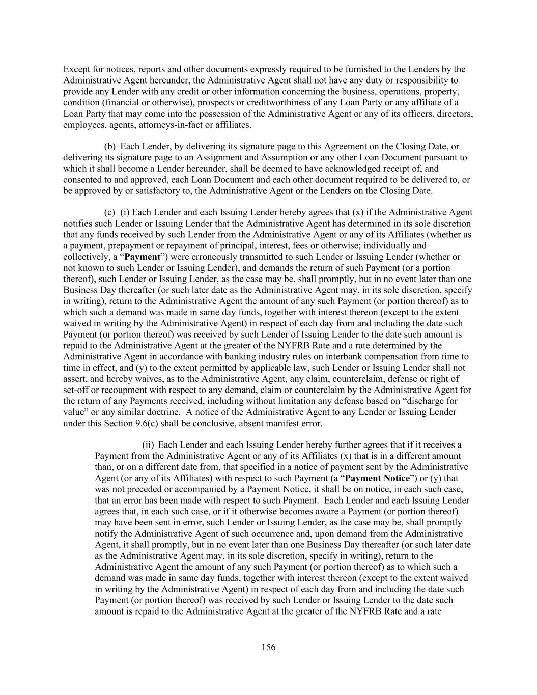 156 Except for notices, reports and other documents expressly required to be furnished to the Lenders by the Administrative Agent hereunder, the Administrative Agent shall not have any duty or responsibility to provide any Lender with any credit or other information concerning the business, operations, property, condition (financial or otherwise), prospects or creditworthiness of any Loan Party or any affiliate of a Loan Party that may come into the possession of the Administrative Agent or any of its officers, directors, employees, agents, attorneys-in-fact or affiliates. (b) Each Lender, by delivering its signature page to this Agreement on the Closing Date, or delivering its signature page to an Assignment and Assumption or any other Loan Document pursuant to which it shall become a Lender hereunder, shall be deemed to have acknowledged receipt of, and consented to and approved, each Loan Document and each other document required to be delivered to, or be approved by or satisfactory to, the Administrative Agent or the Lenders on the Closing Date. (c) (i) Each Lender and each Issuing Lender hereby agrees that (x) if the Administrative Agent notifies such Lender or Issuing Lender that the Administrative Agent has determined in its sole discretion that any funds received by such Lender from the Administrative Agent or any of its Affiliates (whether as a payment, prepayment or repayment of principal, interest, fees or otherwise; individually and collectively, a “Payment”) were erroneously transmitted to such Lender or Issuing Lender (whether or not known to such Lender or Issuing Lender), and demands the return of such Payment (or a portion thereof), such Lender or Issuing Lender, as the case may be, shall promptly, but in no event later than one Business Day thereafter (or such later date as the Administrative Agent may, in its sole discretion, specify in writing), return to the Administrative Agent the amount of any such Payment (or portion thereof) as to which such a demand was made in same day funds, together with interest thereon (except to the extent waived in writing by the Administrative Agent) in respect of each day from and including the date such Payment (or portion thereof) was received by such Lender of Issuing Lender to the date such amount is repaid to the Administrative Agent at the greater of the NYFRB Rate and a rate determined by the Administrative Agent in accordance with banking industry rules on interbank compensation from time to time in effect, and (y) to the extent permitted by applicable law, such Lender or Issuing Lender shall not assert, and hereby waives, as to the Administrative Agent, any claim, counterclaim, defense or right of set-off or recoupment with respect to any demand, claim or counterclaim by the Administrative Agent for the return of any Payments received, including without limitation any defense based on “discharge for value” or any similar doctrine. A notice of the Administrative Agent to any Lender or Issuing Lender under this Section 9.6(c) shall be conclusive, absent manifest error. (ii) Each Lender and each Issuing Lender hereby further agrees that if it receives a Payment from the Administrative Agent or any of its Affiliates (x) that is in a different amount than, or on a different date from, that specified in a notice of payment sent by the Administrative Agent (or any of its Affiliates) with respect to such Payment (a “Payment Notice”) or (y) that was not preceded or accompanied by a Payment Notice, it shall be on notice, in each such case, that an error has been made with respect to such Payment. Each Lender and each Issuing Lender agrees that, in each such case, or if it otherwise becomes aware a Payment (or portion thereof) may have been sent in error, such Lender or Issuing Lender, as the case may be, shall promptly notify the Administrative Agent of such occurrence and, upon demand from the Administrative Agent, it shall promptly, but in no event later than one Business Day thereafter (or such later date as the Administrative Agent may, in its sole discretion, specify in writing), return to the Administrative Agent the amount of any such Payment (or portion thereof) as to which such a demand was made in same day funds, together with interest thereon (except to the extent waived in writing by the Administrative Agent) in respect of each day from and including the date such Payment (or portion thereof) was received by such Lender or Issuing Lender to the date such amount is repaid to the Administrative Agent at the greater of the NYFRB Rate and a rate