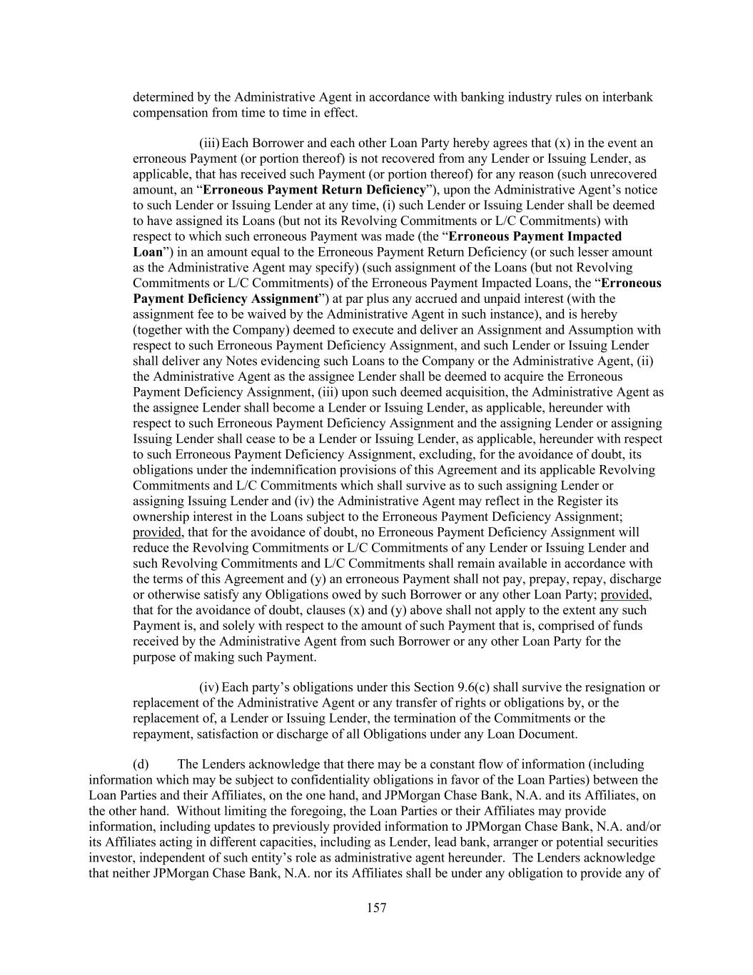157 determined by the Administrative Agent in accordance with banking industry rules on interbank compensation from time to time in effect. (iii) Each Borrower and each other Loan Party hereby agrees that (x) in the event an erroneous Payment (or portion thereof) is not recovered from any Lender or Issuing Lender, as applicable, that has received such Payment (or portion thereof) for any reason (such unrecovered amount, an “Erroneous Payment Return Deficiency”), upon the Administrative Agent’s notice to such Lender or Issuing Lender at any time, (i) such Lender or Issuing Lender shall be deemed to have assigned its Loans (but not its Revolving Commitments or L/C Commitments) with respect to which such erroneous Payment was made (the “Erroneous Payment Impacted Loan”) in an amount equal to the Erroneous Payment Return Deficiency (or such lesser amount as the Administrative Agent may specify) (such assignment of the Loans (but not Revolving Commitments or L/C Commitments) of the Erroneous Payment Impacted Loans, the “Erroneous Payment Deficiency Assignment”) at par plus any accrued and unpaid interest (with the assignment fee to be waived by the Administrative Agent in such instance), and is hereby (together with the Company) deemed to execute and deliver an Assignment and Assumption with respect to such Erroneous Payment Deficiency Assignment, and such Lender or Issuing Lender shall deliver any Notes evidencing such Loans to the Company or the Administrative Agent, (ii) the Administrative Agent as the assignee Lender shall be deemed to acquire the Erroneous Payment Deficiency Assignment, (iii) upon such deemed acquisition, the Administrative Agent as the assignee Lender shall become a Lender or Issuing Lender, as applicable, hereunder with respect to such Erroneous Payment Deficiency Assignment and the assigning Lender or assigning Issuing Lender shall cease to be a Lender or Issuing Lender, as applicable, hereunder with respect to such Erroneous Payment Deficiency Assignment, excluding, for the avoidance of doubt, its obligations under the indemnification provisions of this Agreement and its applicable Revolving Commitments and L/C Commitments which shall survive as to such assigning Lender or assigning Issuing Lender and (iv) the Administrative Agent may reflect in the Register its ownership interest in the Loans subject to the Erroneous Payment Deficiency Assignment; provided, that for the avoidance of doubt, no Erroneous Payment Deficiency Assignment will reduce the Revolving Commitments or L/C Commitments of any Lender or Issuing Lender and such Revolving Commitments and L/C Commitments shall remain available in accordance with the terms of this Agreement and (y) an erroneous Payment shall not pay, prepay, repay, discharge or otherwise satisfy any Obligations owed by such Borrower or any other Loan Party; provided, that for the avoidance of doubt, clauses (x) and (y) above shall not apply to the extent any such Payment is, and solely with respect to the amount of such Payment that is, comprised of funds received by the Administrative Agent from such Borrower or any other Loan Party for the purpose of making such Payment. (iv) Each party’s obligations under this Section 9.6(c) shall survive the resignation or replacement of the Administrative Agent or any transfer of rights or obligations by, or the replacement of, a Lender or Issuing Lender, the termination of the Commitments or the repayment, satisfaction or discharge of all Obligations under any Loan Document. (d) The Lenders acknowledge that there may be a constant flow of information (including information which may be subject to confidentiality obligations in favor of the Loan Parties) between the Loan Parties and their Affiliates, on the one hand, and JPMorgan Chase Bank, N.A. and its Affiliates, on the other hand. Without limiting the foregoing, the Loan Parties or their Affiliates may provide information, including updates to previously provided information to JPMorgan Chase Bank, N.A. and/or its Affiliates acting in different capacities, including as Lender, lead bank, arranger or potential securities investor, independent of such entity’s role as administrative agent hereunder. The Lenders acknowledge that neither JPMorgan Chase Bank, N.A. nor its Affiliates shall be under any obligation to provide any of