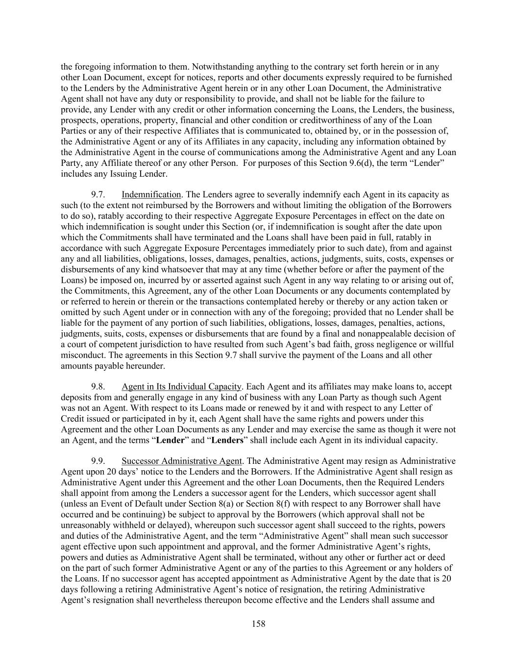 158 the foregoing information to them. Notwithstanding anything to the contrary set forth herein or in any other Loan Document, except for notices, reports and other documents expressly required to be furnished to the Lenders by the Administrative Agent herein or in any other Loan Document, the Administrative Agent shall not have any duty or responsibility to provide, and shall not be liable for the failure to provide, any Lender with any credit or other information concerning the Loans, the Lenders, the business, prospects, operations, property, financial and other condition or creditworthiness of any of the Loan Parties or any of their respective Affiliates that is communicated to, obtained by, or in the possession of, the Administrative Agent or any of its Affiliates in any capacity, including any information obtained by the Administrative Agent in the course of communications among the Administrative Agent and any Loan Party, any Affiliate thereof or any other Person. For purposes of this Section 9.6(d), the term “Lender” includes any Issuing Lender. 9.7. Indemnification. The Lenders agree to severally indemnify each Agent in its capacity as such (to the extent not reimbursed by the Borrowers and without limiting the obligation of the Borrowers to do so), ratably according to their respective Aggregate Exposure Percentages in effect on the date on which indemnification is sought under this Section (or, if indemnification is sought after the date upon which the Commitments shall have terminated and the Loans shall have been paid in full, ratably in accordance with such Aggregate Exposure Percentages immediately prior to such date), from and against any and all liabilities, obligations, losses, damages, penalties, actions, judgments, suits, costs, expenses or disbursements of any kind whatsoever that may at any time (whether before or after the payment of the Loans) be imposed on, incurred by or asserted against such Agent in any way relating to or arising out of, the Commitments, this Agreement, any of the other Loan Documents or any documents contemplated by or referred to herein or therein or the transactions contemplated hereby or thereby or any action taken or omitted by such Agent under or in connection with any of the foregoing; provided that no Lender shall be liable for the payment of any portion of such liabilities, obligations, losses, damages, penalties, actions, judgments, suits, costs, expenses or disbursements that are found by a final and nonappealable decision of a court of competent jurisdiction to have resulted from such Agent’s bad faith, gross negligence or willful misconduct. The agreements in this Section 9.7 shall survive the payment of the Loans and all other amounts payable hereunder. 9.8. Agent in Its Individual Capacity. Each Agent and its affiliates may make loans to, accept deposits from and generally engage in any kind of business with any Loan Party as though such Agent was not an Agent. With respect to its Loans made or renewed by it and with respect to any Letter of Credit issued or participated in by it, each Agent shall have the same rights and powers under this Agreement and the other Loan Documents as any Lender and may exercise the same as though it were not an Agent, and the terms “Lender” and “Lenders” shall include each Agent in its individual capacity. 9.9. Successor Administrative Agent. The Administrative Agent may resign as Administrative Agent upon 20 days’ notice to the Lenders and the Borrowers. If the Administrative Agent shall resign as Administrative Agent under this Agreement and the other Loan Documents, then the Required Lenders shall appoint from among the Lenders a successor agent for the Lenders, which successor agent shall (unless an Event of Default under Section 8(a) or Section 8(f) with respect to any Borrower shall have occurred and be continuing) be subject to approval by the Borrowers (which approval shall not be unreasonably withheld or delayed), whereupon such successor agent shall succeed to the rights, powers and duties of the Administrative Agent, and the term “Administrative Agent” shall mean such successor agent effective upon such appointment and approval, and the former Administrative Agent’s rights, powers and duties as Administrative Agent shall be terminated, without any other or further act or deed on the part of such former Administrative Agent or any of the parties to this Agreement or any holders of the Loans. If no successor agent has accepted appointment as Administrative Agent by the date that is 20 days following a retiring Administrative Agent’s notice of resignation, the retiring Administrative Agent’s resignation shall nevertheless thereupon become effective and the Lenders shall assume and