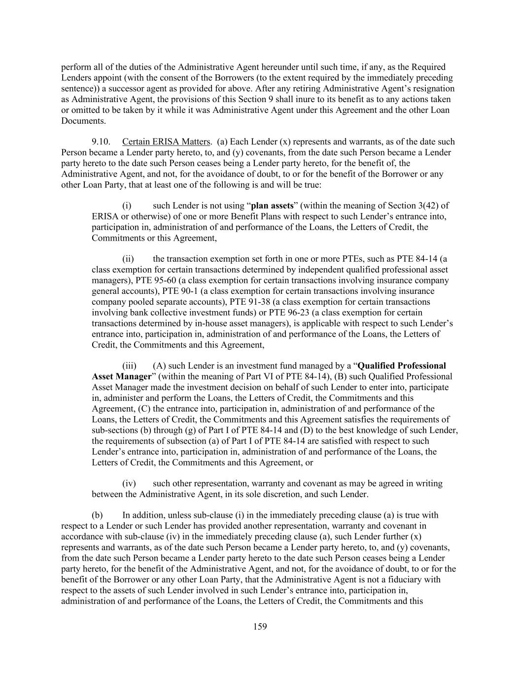 159 perform all of the duties of the Administrative Agent hereunder until such time, if any, as the Required Lenders appoint (with the consent of the Borrowers (to the extent required by the immediately preceding sentence)) a successor agent as provided for above. After any retiring Administrative Agent’s resignation as Administrative Agent, the provisions of this Section 9 shall inure to its benefit as to any actions taken or omitted to be taken by it while it was Administrative Agent under this Agreement and the other Loan Documents. 9.10. Certain ERISA Matters. (a) Each Lender (x) represents and warrants, as of the date such Person became a Lender party hereto, to, and (y) covenants, from the date such Person became a Lender party hereto to the date such Person ceases being a Lender party hereto, for the benefit of, the Administrative Agent, and not, for the avoidance of doubt, to or for the benefit of the Borrower or any other Loan Party, that at least one of the following is and will be true: (i) such Lender is not using “plan assets” (within the meaning of Section 3(42) of ERISA or otherwise) of one or more Benefit Plans with respect to such Lender’s entrance into, participation in, administration of and performance of the Loans, the Letters of Credit, the Commitments or this Agreement, (ii) the transaction exemption set forth in one or more PTEs, such as PTE 84-14 (a class exemption for certain transactions determined by independent qualified professional asset managers), PTE 95-60 (a class exemption for certain transactions involving insurance company general accounts), PTE 90-1 (a class exemption for certain transactions involving insurance company pooled separate accounts), PTE 91-38 (a class exemption for certain transactions involving bank collective investment funds) or PTE 96-23 (a class exemption for certain transactions determined by in-house asset managers), is applicable with respect to such Lender’s entrance into, participation in, administration of and performance of the Loans, the Letters of Credit, the Commitments and this Agreement, (iii) (A) such Lender is an investment fund managed by a “Qualified Professional Asset Manager” (within the meaning of Part VI of PTE 84-14), (B) such Qualified Professional Asset Manager made the investment decision on behalf of such Lender to enter into, participate in, administer and perform the Loans, the Letters of Credit, the Commitments and this Agreement, (C) the entrance into, participation in, administration of and performance of the Loans, the Letters of Credit, the Commitments and this Agreement satisfies the requirements of sub-sections (b) through (g) of Part I of PTE 84-14 and (D) to the best knowledge of such Lender, the requirements of subsection (a) of Part I of PTE 84-14 are satisfied with respect to such Lender’s entrance into, participation in, administration of and performance of the Loans, the Letters of Credit, the Commitments and this Agreement, or (iv) such other representation, warranty and covenant as may be agreed in writing between the Administrative Agent, in its sole discretion, and such Lender. (b) In addition, unless sub-clause (i) in the immediately preceding clause (a) is true with respect to a Lender or such Lender has provided another representation, warranty and covenant in accordance with sub-clause (iv) in the immediately preceding clause (a), such Lender further (x) represents and warrants, as of the date such Person became a Lender party hereto, to, and (y) covenants, from the date such Person became a Lender party hereto to the date such Person ceases being a Lender party hereto, for the benefit of the Administrative Agent, and not, for the avoidance of doubt, to or for the benefit of the Borrower or any other Loan Party, that the Administrative Agent is not a fiduciary with respect to the assets of such Lender involved in such Lender’s entrance into, participation in, administration of and performance of the Loans, the Letters of Credit, the Commitments and this