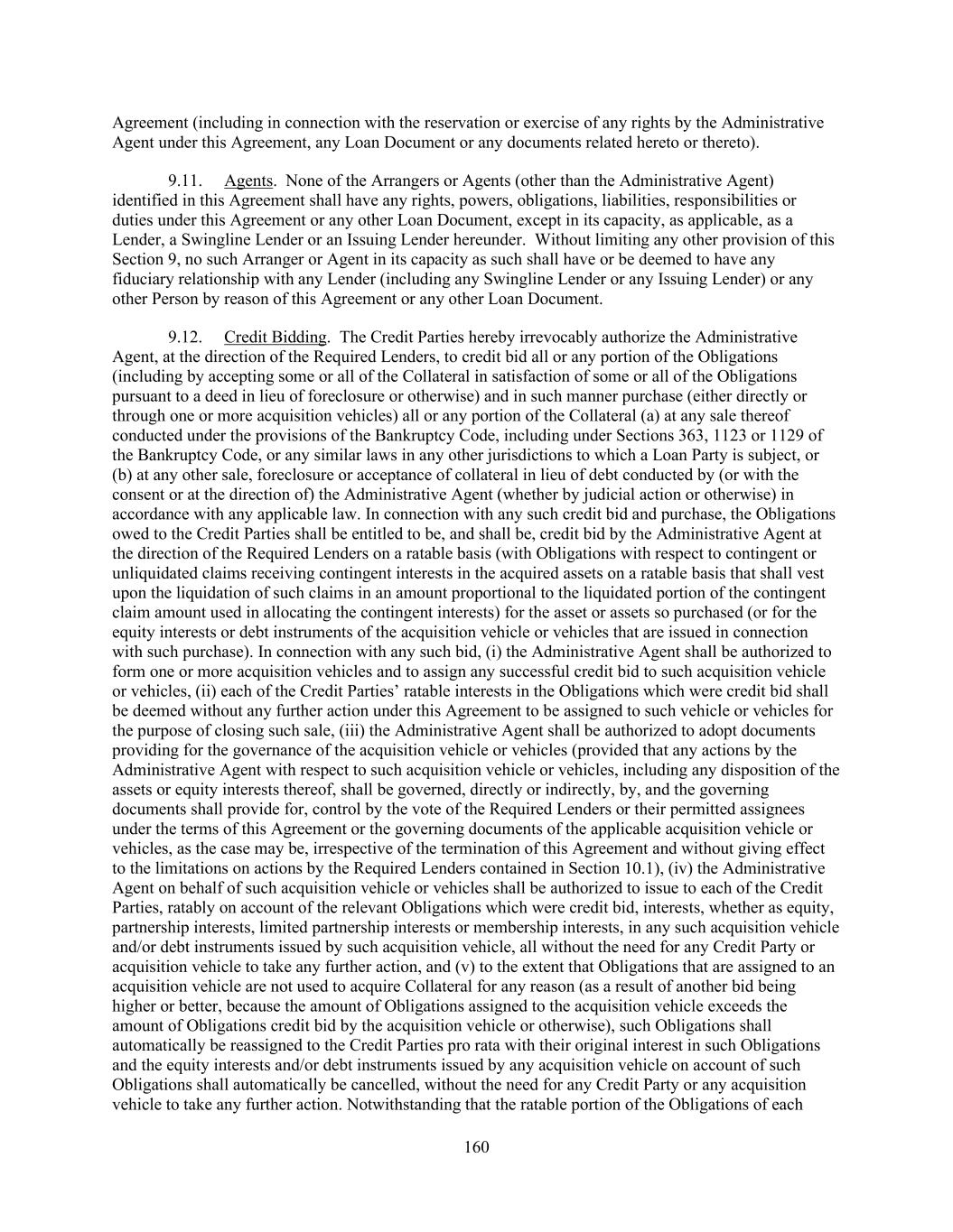 160 Agreement (including in connection with the reservation or exercise of any rights by the Administrative Agent under this Agreement, any Loan Document or any documents related hereto or thereto). 9.11. Agents. None of the Arrangers or Agents (other than the Administrative Agent) identified in this Agreement shall have any rights, powers, obligations, liabilities, responsibilities or duties under this Agreement or any other Loan Document, except in its capacity, as applicable, as a Lender, a Swingline Lender or an Issuing Lender hereunder. Without limiting any other provision of this Section 9, no such Arranger or Agent in its capacity as such shall have or be deemed to have any fiduciary relationship with any Lender (including any Swingline Lender or any Issuing Lender) or any other Person by reason of this Agreement or any other Loan Document. 9.12. Credit Bidding. The Credit Parties hereby irrevocably authorize the Administrative Agent, at the direction of the Required Lenders, to credit bid all or any portion of the Obligations (including by accepting some or all of the Collateral in satisfaction of some or all of the Obligations pursuant to a deed in lieu of foreclosure or otherwise) and in such manner purchase (either directly or through one or more acquisition vehicles) all or any portion of the Collateral (a) at any sale thereof conducted under the provisions of the Bankruptcy Code, including under Sections 363, 1123 or 1129 of the Bankruptcy Code, or any similar laws in any other jurisdictions to which a Loan Party is subject, or (b) at any other sale, foreclosure or acceptance of collateral in lieu of debt conducted by (or with the consent or at the direction of) the Administrative Agent (whether by judicial action or otherwise) in accordance with any applicable law. In connection with any such credit bid and purchase, the Obligations owed to the Credit Parties shall be entitled to be, and shall be, credit bid by the Administrative Agent at the direction of the Required Lenders on a ratable basis (with Obligations with respect to contingent or unliquidated claims receiving contingent interests in the acquired assets on a ratable basis that shall vest upon the liquidation of such claims in an amount proportional to the liquidated portion of the contingent claim amount used in allocating the contingent interests) for the asset or assets so purchased (or for the equity interests or debt instruments of the acquisition vehicle or vehicles that are issued in connection with such purchase). In connection with any such bid, (i) the Administrative Agent shall be authorized to form one or more acquisition vehicles and to assign any successful credit bid to such acquisition vehicle or vehicles, (ii) each of the Credit Parties’ ratable interests in the Obligations which were credit bid shall be deemed without any further action under this Agreement to be assigned to such vehicle or vehicles for the purpose of closing such sale, (iii) the Administrative Agent shall be authorized to adopt documents providing for the governance of the acquisition vehicle or vehicles (provided that any actions by the Administrative Agent with respect to such acquisition vehicle or vehicles, including any disposition of the assets or equity interests thereof, shall be governed, directly or indirectly, by, and the governing documents shall provide for, control by the vote of the Required Lenders or their permitted assignees under the terms of this Agreement or the governing documents of the applicable acquisition vehicle or vehicles, as the case may be, irrespective of the termination of this Agreement and without giving effect to the limitations on actions by the Required Lenders contained in Section 10.1), (iv) the Administrative Agent on behalf of such acquisition vehicle or vehicles shall be authorized to issue to each of the Credit Parties, ratably on account of the relevant Obligations which were credit bid, interests, whether as equity, partnership interests, limited partnership interests or membership interests, in any such acquisition vehicle and/or debt instruments issued by such acquisition vehicle, all without the need for any Credit Party or acquisition vehicle to take any further action, and (v) to the extent that Obligations that are assigned to an acquisition vehicle are not used to acquire Collateral for any reason (as a result of another bid being higher or better, because the amount of Obligations assigned to the acquisition vehicle exceeds the amount of Obligations credit bid by the acquisition vehicle or otherwise), such Obligations shall automatically be reassigned to the Credit Parties pro rata with their original interest in such Obligations and the equity interests and/or debt instruments issued by any acquisition vehicle on account of such Obligations shall automatically be cancelled, without the need for any Credit Party or any acquisition vehicle to take any further action. Notwithstanding that the ratable portion of the Obligations of each