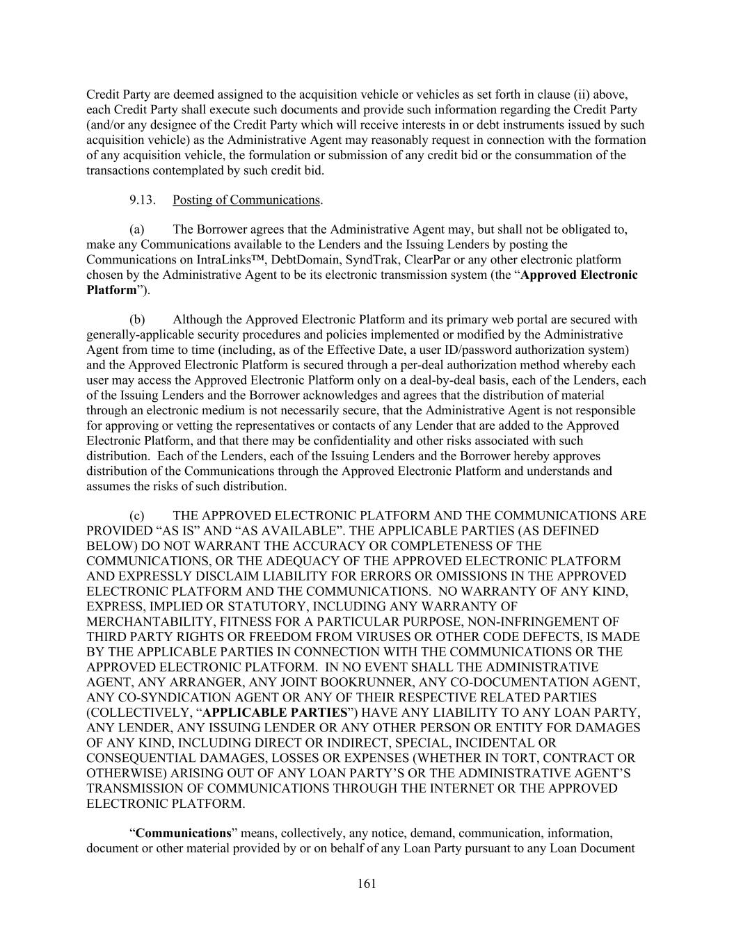 161 Credit Party are deemed assigned to the acquisition vehicle or vehicles as set forth in clause (ii) above, each Credit Party shall execute such documents and provide such information regarding the Credit Party (and/or any designee of the Credit Party which will receive interests in or debt instruments issued by such acquisition vehicle) as the Administrative Agent may reasonably request in connection with the formation of any acquisition vehicle, the formulation or submission of any credit bid or the consummation of the transactions contemplated by such credit bid. 9.13. Posting of Communications. (a) The Borrower agrees that the Administrative Agent may, but shall not be obligated to, make any Communications available to the Lenders and the Issuing Lenders by posting the Communications on IntraLinks™, DebtDomain, SyndTrak, ClearPar or any other electronic platform chosen by the Administrative Agent to be its electronic transmission system (the “Approved Electronic Platform”). (b) Although the Approved Electronic Platform and its primary web portal are secured with generally-applicable security procedures and policies implemented or modified by the Administrative Agent from time to time (including, as of the Effective Date, a user ID/password authorization system) and the Approved Electronic Platform is secured through a per-deal authorization method whereby each user may access the Approved Electronic Platform only on a deal-by-deal basis, each of the Lenders, each of the Issuing Lenders and the Borrower acknowledges and agrees that the distribution of material through an electronic medium is not necessarily secure, that the Administrative Agent is not responsible for approving or vetting the representatives or contacts of any Lender that are added to the Approved Electronic Platform, and that there may be confidentiality and other risks associated with such distribution. Each of the Lenders, each of the Issuing Lenders and the Borrower hereby approves distribution of the Communications through the Approved Electronic Platform and understands and assumes the risks of such distribution. (c) THE APPROVED ELECTRONIC PLATFORM AND THE COMMUNICATIONS ARE PROVIDED “AS IS” AND “AS AVAILABLE”. THE APPLICABLE PARTIES (AS DEFINED BELOW) DO NOT WARRANT THE ACCURACY OR COMPLETENESS OF THE COMMUNICATIONS, OR THE ADEQUACY OF THE APPROVED ELECTRONIC PLATFORM AND EXPRESSLY DISCLAIM LIABILITY FOR ERRORS OR OMISSIONS IN THE APPROVED ELECTRONIC PLATFORM AND THE COMMUNICATIONS. NO WARRANTY OF ANY KIND, EXPRESS, IMPLIED OR STATUTORY, INCLUDING ANY WARRANTY OF MERCHANTABILITY, FITNESS FOR A PARTICULAR PURPOSE, NON-INFRINGEMENT OF THIRD PARTY RIGHTS OR FREEDOM FROM VIRUSES OR OTHER CODE DEFECTS, IS MADE BY THE APPLICABLE PARTIES IN CONNECTION WITH THE COMMUNICATIONS OR THE APPROVED ELECTRONIC PLATFORM. IN NO EVENT SHALL THE ADMINISTRATIVE AGENT, ANY ARRANGER, ANY JOINT BOOKRUNNER, ANY CO-DOCUMENTATION AGENT, ANY CO-SYNDICATION AGENT OR ANY OF THEIR RESPECTIVE RELATED PARTIES (COLLECTIVELY, “APPLICABLE PARTIES”) HAVE ANY LIABILITY TO ANY LOAN PARTY, ANY LENDER, ANY ISSUING LENDER OR ANY OTHER PERSON OR ENTITY FOR DAMAGES OF ANY KIND, INCLUDING DIRECT OR INDIRECT, SPECIAL, INCIDENTAL OR CONSEQUENTIAL DAMAGES, LOSSES OR EXPENSES (WHETHER IN TORT, CONTRACT OR OTHERWISE) ARISING OUT OF ANY LOAN PARTY’S OR THE ADMINISTRATIVE AGENT’S TRANSMISSION OF COMMUNICATIONS THROUGH THE INTERNET OR THE APPROVED ELECTRONIC PLATFORM. “Communications” means, collectively, any notice, demand, communication, information, document or other material provided by or on behalf of any Loan Party pursuant to any Loan Document