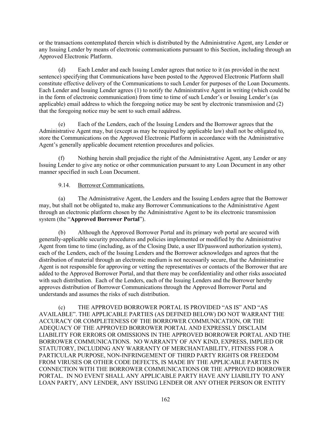 162 or the transactions contemplated therein which is distributed by the Administrative Agent, any Lender or any Issuing Lender by means of electronic communications pursuant to this Section, including through an Approved Electronic Platform. (d) Each Lender and each Issuing Lender agrees that notice to it (as provided in the next sentence) specifying that Communications have been posted to the Approved Electronic Platform shall constitute effective delivery of the Communications to such Lender for purposes of the Loan Documents. Each Lender and Issuing Lender agrees (1) to notify the Administrative Agent in writing (which could be in the form of electronic communication) from time to time of such Lender’s or Issuing Lender’s (as applicable) email address to which the foregoing notice may be sent by electronic transmission and (2) that the foregoing notice may be sent to such email address. (e) Each of the Lenders, each of the Issuing Lenders and the Borrower agrees that the Administrative Agent may, but (except as may be required by applicable law) shall not be obligated to, store the Communications on the Approved Electronic Platform in accordance with the Administrative Agent’s generally applicable document retention procedures and policies. (f) Nothing herein shall prejudice the right of the Administrative Agent, any Lender or any Issuing Lender to give any notice or other communication pursuant to any Loan Document in any other manner specified in such Loan Document. 9.14. Borrower Communications. (a) The Administrative Agent, the Lenders and the Issuing Lenders agree that the Borrower may, but shall not be obligated to, make any Borrower Communications to the Administrative Agent through an electronic platform chosen by the Administrative Agent to be its electronic transmission system (the “Approved Borrower Portal”). (b) Although the Approved Borrower Portal and its primary web portal are secured with generally-applicable security procedures and policies implemented or modified by the Administrative Agent from time to time (including, as of the Closing Date, a user ID/password authorization system), each of the Lenders, each of the Issuing Lenders and the Borrower acknowledges and agrees that the distribution of material through an electronic medium is not necessarily secure, that the Administrative Agent is not responsible for approving or vetting the representatives or contacts of the Borrower that are added to the Approved Borrower Portal, and that there may be confidentiality and other risks associated with such distribution. Each of the Lenders, each of the Issuing Lenders and the Borrower hereby approves distribution of Borrower Communications through the Approved Borrower Portal and understands and assumes the risks of such distribution. (c) THE APPROVED BORROWER PORTAL IS PROVIDED “AS IS” AND “AS AVAILABLE”. THE APPLICABLE PARTIES (AS DEFINED BELOW) DO NOT WARRANT THE ACCURACY OR COMPLETENESS OF THE BORROWER COMMUNICATION, OR THE ADEQUACY OF THE APPROVED BORROWER PORTAL AND EXPRESSLY DISCLAIM LIABILITY FOR ERRORS OR OMISSIONS IN THE APPROVED BORROWER PORTAL AND THE BORROWER COMMUNICATIONS. NO WARRANTY OF ANY KIND, EXPRESS, IMPLIED OR STATUTORY, INCLUDING ANY WARRANTY OF MERCHANTABILITY, FITNESS FOR A PARTICULAR PURPOSE, NON-INFRINGEMENT OF THIRD PARTY RIGHTS OR FREEDOM FROM VIRUSES OR OTHER CODE DEFECTS, IS MADE BY THE APPLICABLE PARTIES IN CONNECTION WITH THE BORROWER COMMUNICATIONS OR THE APPROVED BORROWER PORTAL. IN NO EVENT SHALL ANY APPLICABLE PARTY HAVE ANY LIABILITY TO ANY LOAN PARTY, ANY LENDER, ANY ISSUING LENDER OR ANY OTHER PERSON OR ENTITY