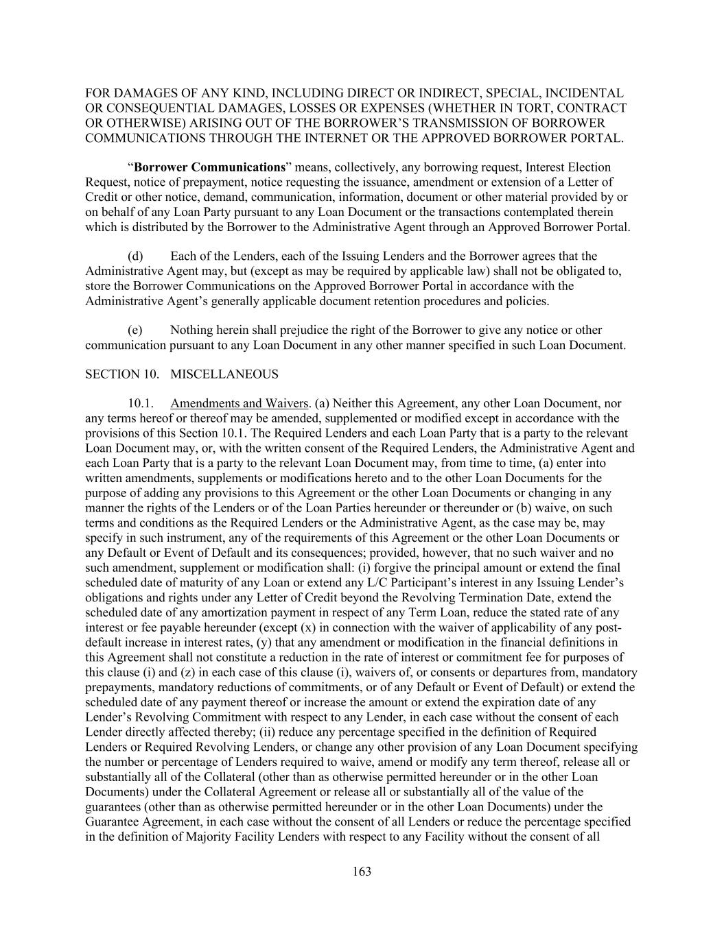 163 FOR DAMAGES OF ANY KIND, INCLUDING DIRECT OR INDIRECT, SPECIAL, INCIDENTAL OR CONSEQUENTIAL DAMAGES, LOSSES OR EXPENSES (WHETHER IN TORT, CONTRACT OR OTHERWISE) ARISING OUT OF THE BORROWER’S TRANSMISSION OF BORROWER COMMUNICATIONS THROUGH THE INTERNET OR THE APPROVED BORROWER PORTAL. “Borrower Communications” means, collectively, any borrowing request, Interest Election Request, notice of prepayment, notice requesting the issuance, amendment or extension of a Letter of Credit or other notice, demand, communication, information, document or other material provided by or on behalf of any Loan Party pursuant to any Loan Document or the transactions contemplated therein which is distributed by the Borrower to the Administrative Agent through an Approved Borrower Portal. (d) Each of the Lenders, each of the Issuing Lenders and the Borrower agrees that the Administrative Agent may, but (except as may be required by applicable law) shall not be obligated to, store the Borrower Communications on the Approved Borrower Portal in accordance with the Administrative Agent’s generally applicable document retention procedures and policies. (e) Nothing herein shall prejudice the right of the Borrower to give any notice or other communication pursuant to any Loan Document in any other manner specified in such Loan Document. SECTION 10. MISCELLANEOUS 10.1. Amendments and Waivers. (a) Neither this Agreement, any other Loan Document, nor any terms hereof or thereof may be amended, supplemented or modified except in accordance with the provisions of this Section 10.1. The Required Lenders and each Loan Party that is a party to the relevant Loan Document may, or, with the written consent of the Required Lenders, the Administrative Agent and each Loan Party that is a party to the relevant Loan Document may, from time to time, (a) enter into written amendments, supplements or modifications hereto and to the other Loan Documents for the purpose of adding any provisions to this Agreement or the other Loan Documents or changing in any manner the rights of the Lenders or of the Loan Parties hereunder or thereunder or (b) waive, on such terms and conditions as the Required Lenders or the Administrative Agent, as the case may be, may specify in such instrument, any of the requirements of this Agreement or the other Loan Documents or any Default or Event of Default and its consequences; provided, however, that no such waiver and no such amendment, supplement or modification shall: (i) forgive the principal amount or extend the final scheduled date of maturity of any Loan or extend any L/C Participant’s interest in any Issuing Lender’s obligations and rights under any Letter of Credit beyond the Revolving Termination Date, extend the scheduled date of any amortization payment in respect of any Term Loan, reduce the stated rate of any interest or fee payable hereunder (except (x) in connection with the waiver of applicability of any post- default increase in interest rates, (y) that any amendment or modification in the financial definitions in this Agreement shall not constitute a reduction in the rate of interest or commitment fee for purposes of this clause (i) and (z) in each case of this clause (i), waivers of, or consents or departures from, mandatory prepayments, mandatory reductions of commitments, or of any Default or Event of Default) or extend the scheduled date of any payment thereof or increase the amount or extend the expiration date of any Lender’s Revolving Commitment with respect to any Lender, in each case without the consent of each Lender directly affected thereby; (ii) reduce any percentage specified in the definition of Required Lenders or Required Revolving Lenders, or change any other provision of any Loan Document specifying the number or percentage of Lenders required to waive, amend or modify any term thereof, release all or substantially all of the Collateral (other than as otherwise permitted hereunder or in the other Loan Documents) under the Collateral Agreement or release all or substantially all of the value of the guarantees (other than as otherwise permitted hereunder or in the other Loan Documents) under the Guarantee Agreement, in each case without the consent of all Lenders or reduce the percentage specified in the definition of Majority Facility Lenders with respect to any Facility without the consent of all