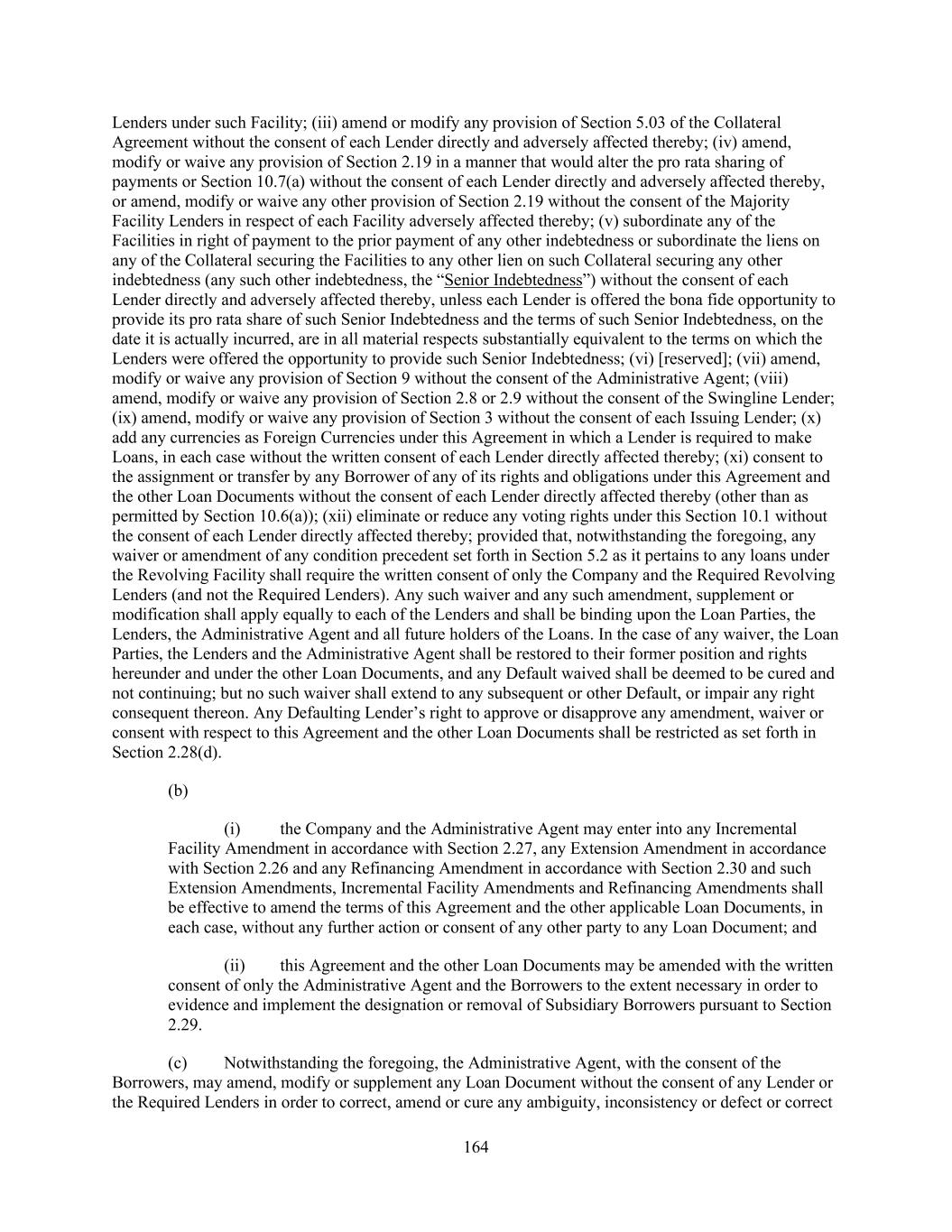 164 Lenders under such Facility; (iii) amend or modify any provision of Section 5.03 of the Collateral Agreement without the consent of each Lender directly and adversely affected thereby; (iv) amend, modify or waive any provision of Section 2.19 in a manner that would alter the pro rata sharing of payments or Section 10.7(a) without the consent of each Lender directly and adversely affected thereby, or amend, modify or waive any other provision of Section 2.19 without the consent of the Majority Facility Lenders in respect of each Facility adversely affected thereby; (v) subordinate any of the Facilities in right of payment to the prior payment of any other indebtedness or subordinate the liens on any of the Collateral securing the Facilities to any other lien on such Collateral securing any other indebtedness (any such other indebtedness, the “Senior Indebtedness”) without the consent of each Lender directly and adversely affected thereby, unless each Lender is offered the bona fide opportunity to provide its pro rata share of such Senior Indebtedness and the terms of such Senior Indebtedness, on the date it is actually incurred, are in all material respects substantially equivalent to the terms on which the Lenders were offered the opportunity to provide such Senior Indebtedness; (vi) [reserved]; (vii) amend, modify or waive any provision of Section 9 without the consent of the Administrative Agent; (viii) amend, modify or waive any provision of Section 2.8 or 2.9 without the consent of the Swingline Lender; (ix) amend, modify or waive any provision of Section 3 without the consent of each Issuing Lender; (x) add any currencies as Foreign Currencies under this Agreement in which a Lender is required to make Loans, in each case without the written consent of each Lender directly affected thereby; (xi) consent to the assignment or transfer by any Borrower of any of its rights and obligations under this Agreement and the other Loan Documents without the consent of each Lender directly affected thereby (other than as permitted by Section 10.6(a)); (xii) eliminate or reduce any voting rights under this Section 10.1 without the consent of each Lender directly affected thereby; provided that, notwithstanding the foregoing, any waiver or amendment of any condition precedent set forth in Section 5.2 as it pertains to any loans under the Revolving Facility shall require the written consent of only the Company and the Required Revolving Lenders (and not the Required Lenders). Any such waiver and any such amendment, supplement or modification shall apply equally to each of the Lenders and shall be binding upon the Loan Parties, the Lenders, the Administrative Agent and all future holders of the Loans. In the case of any waiver, the Loan Parties, the Lenders and the Administrative Agent shall be restored to their former position and rights hereunder and under the other Loan Documents, and any Default waived shall be deemed to be cured and not continuing; but no such waiver shall extend to any subsequent or other Default, or impair any right consequent thereon. Any Defaulting Lender’s right to approve or disapprove any amendment, waiver or consent with respect to this Agreement and the other Loan Documents shall be restricted as set forth in Section 2.28(d). (b) (i) the Company and the Administrative Agent may enter into any Incremental Facility Amendment in accordance with Section 2.27, any Extension Amendment in accordance with Section 2.26 and any Refinancing Amendment in accordance with Section 2.30 and such Extension Amendments, Incremental Facility Amendments and Refinancing Amendments shall be effective to amend the terms of this Agreement and the other applicable Loan Documents, in each case, without any further action or consent of any other party to any Loan Document; and (ii) this Agreement and the other Loan Documents may be amended with the written consent of only the Administrative Agent and the Borrowers to the extent necessary in order to evidence and implement the designation or removal of Subsidiary Borrowers pursuant to Section 2.29. (c) Notwithstanding the foregoing, the Administrative Agent, with the consent of the Borrowers, may amend, modify or supplement any Loan Document without the consent of any Lender or the Required Lenders in order to correct, amend or cure any ambiguity, inconsistency or defect or correct
