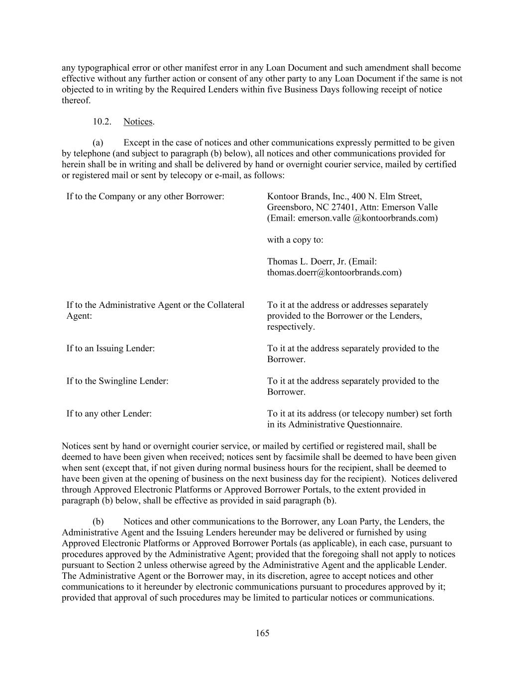 165 any typographical error or other manifest error in any Loan Document and such amendment shall become effective without any further action or consent of any other party to any Loan Document if the same is not objected to in writing by the Required Lenders within five Business Days following receipt of notice thereof. 10.2. Notices. (a) Except in the case of notices and other communications expressly permitted to be given by telephone (and subject to paragraph (b) below), all notices and other communications provided for herein shall be in writing and shall be delivered by hand or overnight courier service, mailed by certified or registered mail or sent by telecopy or e-mail, as follows: If to the Company or any other Borrower: Kontoor Brands, Inc., 400 N. Elm Street, Greensboro, NC 27401, Attn: Emerson Valle (Email: emerson.valle @kontoorbrands.com) with a copy to: Thomas L. Doerr, Jr. (Email: thomas.doerr@kontoorbrands.com) If to the Administrative Agent or the Collateral Agent: To it at the address or addresses separately provided to the Borrower or the Lenders, respectively. If to an Issuing Lender: To it at the address separately provided to the Borrower. If to the Swingline Lender: To it at the address separately provided to the Borrower. If to any other Lender: To it at its address (or telecopy number) set forth in its Administrative Questionnaire. Notices sent by hand or overnight courier service, or mailed by certified or registered mail, shall be deemed to have been given when received; notices sent by facsimile shall be deemed to have been given when sent (except that, if not given during normal business hours for the recipient, shall be deemed to have been given at the opening of business on the next business day for the recipient). Notices delivered through Approved Electronic Platforms or Approved Borrower Portals, to the extent provided in paragraph (b) below, shall be effective as provided in said paragraph (b). (b) Notices and other communications to the Borrower, any Loan Party, the Lenders, the Administrative Agent and the Issuing Lenders hereunder may be delivered or furnished by using Approved Electronic Platforms or Approved Borrower Portals (as applicable), in each case, pursuant to procedures approved by the Administrative Agent; provided that the foregoing shall not apply to notices pursuant to Section 2 unless otherwise agreed by the Administrative Agent and the applicable Lender. The Administrative Agent or the Borrower may, in its discretion, agree to accept notices and other communications to it hereunder by electronic communications pursuant to procedures approved by it; provided that approval of such procedures may be limited to particular notices or communications.