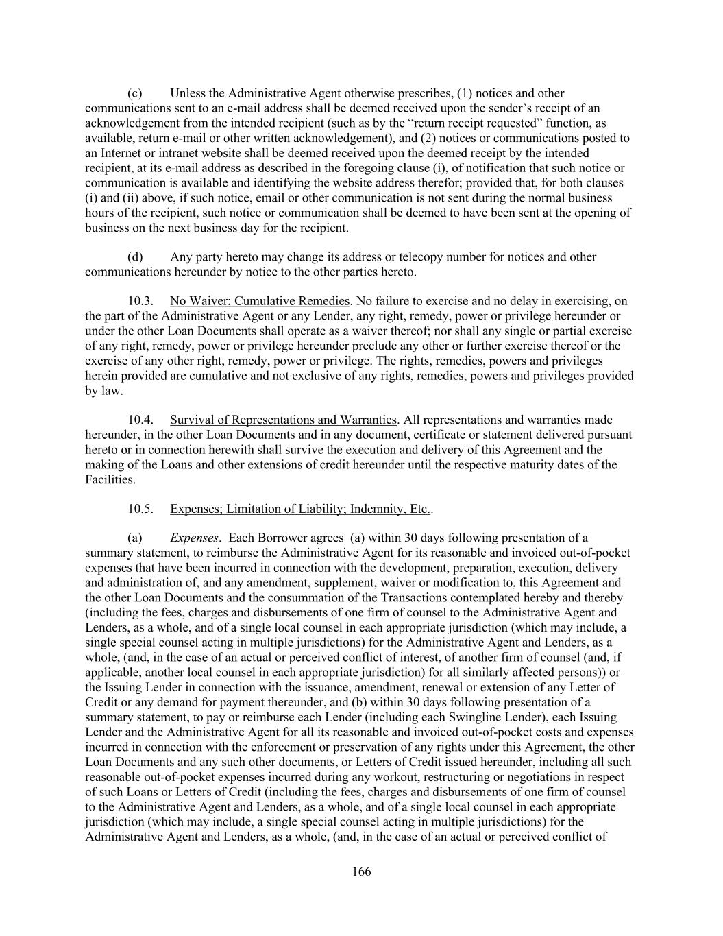 166 (c) Unless the Administrative Agent otherwise prescribes, (1) notices and other communications sent to an e-mail address shall be deemed received upon the sender’s receipt of an acknowledgement from the intended recipient (such as by the “return receipt requested” function, as available, return e-mail or other written acknowledgement), and (2) notices or communications posted to an Internet or intranet website shall be deemed received upon the deemed receipt by the intended recipient, at its e-mail address as described in the foregoing clause (i), of notification that such notice or communication is available and identifying the website address therefor; provided that, for both clauses (i) and (ii) above, if such notice, email or other communication is not sent during the normal business hours of the recipient, such notice or communication shall be deemed to have been sent at the opening of business on the next business day for the recipient. (d) Any party hereto may change its address or telecopy number for notices and other communications hereunder by notice to the other parties hereto. 10.3. No Waiver; Cumulative Remedies. No failure to exercise and no delay in exercising, on the part of the Administrative Agent or any Lender, any right, remedy, power or privilege hereunder or under the other Loan Documents shall operate as a waiver thereof; nor shall any single or partial exercise of any right, remedy, power or privilege hereunder preclude any other or further exercise thereof or the exercise of any other right, remedy, power or privilege. The rights, remedies, powers and privileges herein provided are cumulative and not exclusive of any rights, remedies, powers and privileges provided by law. 10.4. Survival of Representations and Warranties. All representations and warranties made hereunder, in the other Loan Documents and in any document, certificate or statement delivered pursuant hereto or in connection herewith shall survive the execution and delivery of this Agreement and the making of the Loans and other extensions of credit hereunder until the respective maturity dates of the Facilities. 10.5. Expenses; Limitation of Liability; Indemnity, Etc.. (a) Expenses. Each Borrower agrees (a) within 30 days following presentation of a summary statement, to reimburse the Administrative Agent for its reasonable and invoiced out-of-pocket expenses that have been incurred in connection with the development, preparation, execution, delivery and administration of, and any amendment, supplement, waiver or modification to, this Agreement and the other Loan Documents and the consummation of the Transactions contemplated hereby and thereby (including the fees, charges and disbursements of one firm of counsel to the Administrative Agent and Lenders, as a whole, and of a single local counsel in each appropriate jurisdiction (which may include, a single special counsel acting in multiple jurisdictions) for the Administrative Agent and Lenders, as a whole, (and, in the case of an actual or perceived conflict of interest, of another firm of counsel (and, if applicable, another local counsel in each appropriate jurisdiction) for all similarly affected persons)) or the Issuing Lender in connection with the issuance, amendment, renewal or extension of any Letter of Credit or any demand for payment thereunder, and (b) within 30 days following presentation of a summary statement, to pay or reimburse each Lender (including each Swingline Lender), each Issuing Lender and the Administrative Agent for all its reasonable and invoiced out-of-pocket costs and expenses incurred in connection with the enforcement or preservation of any rights under this Agreement, the other Loan Documents and any such other documents, or Letters of Credit issued hereunder, including all such reasonable out-of-pocket expenses incurred during any workout, restructuring or negotiations in respect of such Loans or Letters of Credit (including the fees, charges and disbursements of one firm of counsel to the Administrative Agent and Lenders, as a whole, and of a single local counsel in each appropriate jurisdiction (which may include, a single special counsel acting in multiple jurisdictions) for the Administrative Agent and Lenders, as a whole, (and, in the case of an actual or perceived conflict of