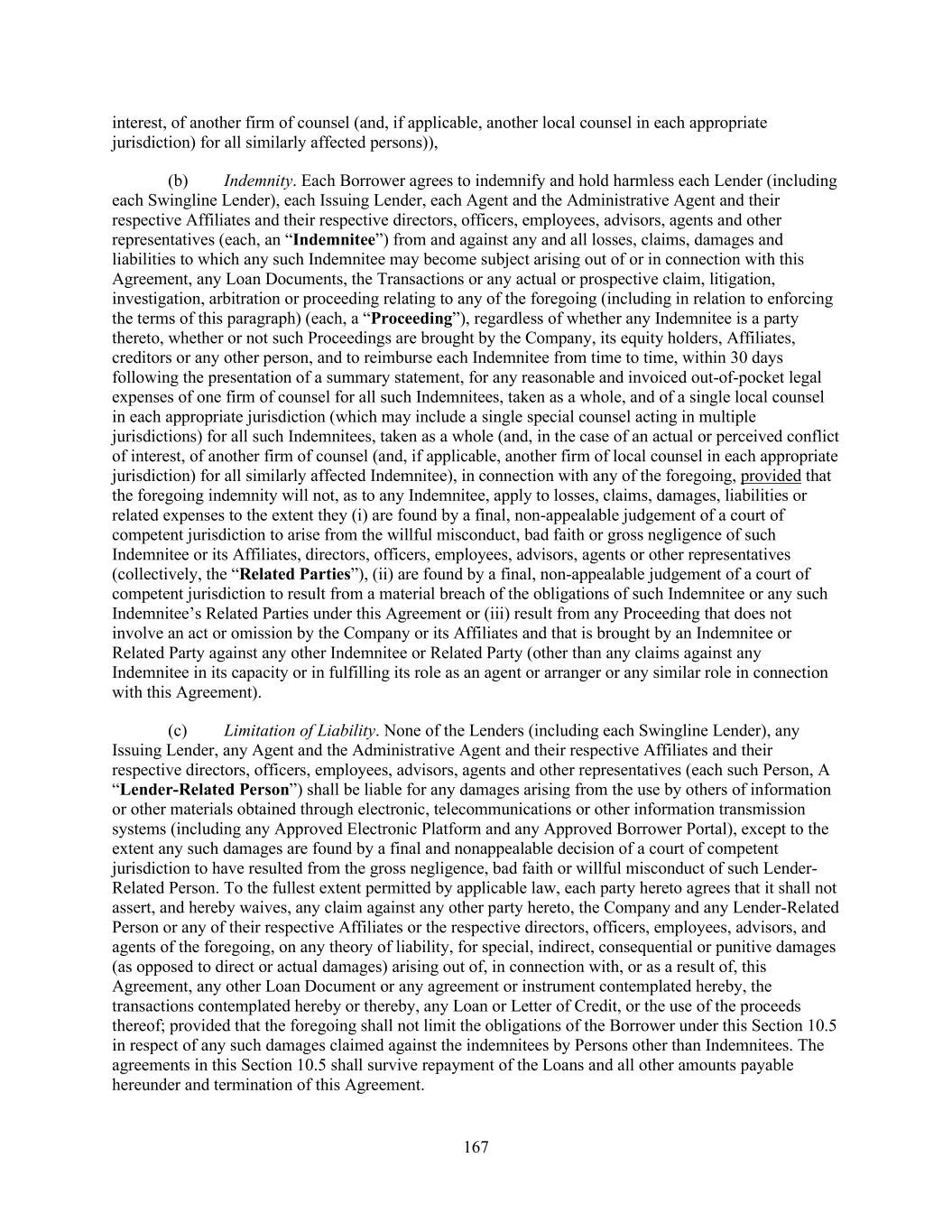 167 interest, of another firm of counsel (and, if applicable, another local counsel in each appropriate jurisdiction) for all similarly affected persons)), (b) Indemnity. Each Borrower agrees to indemnify and hold harmless each Lender (including each Swingline Lender), each Issuing Lender, each Agent and the Administrative Agent and their respective Affiliates and their respective directors, officers, employees, advisors, agents and other representatives (each, an “Indemnitee”) from and against any and all losses, claims, damages and liabilities to which any such Indemnitee may become subject arising out of or in connection with this Agreement, any Loan Documents, the Transactions or any actual or prospective claim, litigation, investigation, arbitration or proceeding relating to any of the foregoing (including in relation to enforcing the terms of this paragraph) (each, a “Proceeding”), regardless of whether any Indemnitee is a party thereto, whether or not such Proceedings are brought by the Company, its equity holders, Affiliates, creditors or any other person, and to reimburse each Indemnitee from time to time, within 30 days following the presentation of a summary statement, for any reasonable and invoiced out-of-pocket legal expenses of one firm of counsel for all such Indemnitees, taken as a whole, and of a single local counsel in each appropriate jurisdiction (which may include a single special counsel acting in multiple jurisdictions) for all such Indemnitees, taken as a whole (and, in the case of an actual or perceived conflict of interest, of another firm of counsel (and, if applicable, another firm of local counsel in each appropriate jurisdiction) for all similarly affected Indemnitee), in connection with any of the foregoing, provided that the foregoing indemnity will not, as to any Indemnitee, apply to losses, claims, damages, liabilities or related expenses to the extent they (i) are found by a final, non-appealable judgement of a court of competent jurisdiction to arise from the willful misconduct, bad faith or gross negligence of such Indemnitee or its Affiliates, directors, officers, employees, advisors, agents or other representatives (collectively, the “Related Parties”), (ii) are found by a final, non-appealable judgement of a court of competent jurisdiction to result from a material breach of the obligations of such Indemnitee or any such Indemnitee’s Related Parties under this Agreement or (iii) result from any Proceeding that does not involve an act or omission by the Company or its Affiliates and that is brought by an Indemnitee or Related Party against any other Indemnitee or Related Party (other than any claims against any Indemnitee in its capacity or in fulfilling its role as an agent or arranger or any similar role in connection with this Agreement). (c) Limitation of Liability. None of the Lenders (including each Swingline Lender), any Issuing Lender, any Agent and the Administrative Agent and their respective Affiliates and their respective directors, officers, employees, advisors, agents and other representatives (each such Person, A “Lender-Related Person”) shall be liable for any damages arising from the use by others of information or other materials obtained through electronic, telecommunications or other information transmission systems (including any Approved Electronic Platform and any Approved Borrower Portal), except to the extent any such damages are found by a final and nonappealable decision of a court of competent jurisdiction to have resulted from the gross negligence, bad faith or willful misconduct of such Lender- Related Person. To the fullest extent permitted by applicable law, each party hereto agrees that it shall not assert, and hereby waives, any claim against any other party hereto, the Company and any Lender-Related Person or any of their respective Affiliates or the respective directors, officers, employees, advisors, and agents of the foregoing, on any theory of liability, for special, indirect, consequential or punitive damages (as opposed to direct or actual damages) arising out of, in connection with, or as a result of, this Agreement, any other Loan Document or any agreement or instrument contemplated hereby, the transactions contemplated hereby or thereby, any Loan or Letter of Credit, or the use of the proceeds thereof; provided that the foregoing shall not limit the obligations of the Borrower under this Section 10.5 in respect of any such damages claimed against the indemnitees by Persons other than Indemnitees. The agreements in this Section 10.5 shall survive repayment of the Loans and all other amounts payable hereunder and termination of this Agreement.