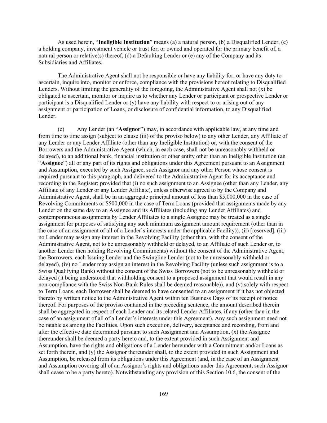 169 As used herein, “Ineligible Institution” means (a) a natural person, (b) a Disqualified Lender, (c) a holding company, investment vehicle or trust for, or owned and operated for the primary benefit of, a natural person or relative(s) thereof, (d) a Defaulting Lender or (e) any of the Company and its Subsidiaries and Affiliates. The Administrative Agent shall not be responsible or have any liability for, or have any duty to ascertain, inquire into, monitor or enforce, compliance with the provisions hereof relating to Disqualified Lenders. Without limiting the generality of the foregoing, the Administrative Agent shall not (x) be obligated to ascertain, monitor or inquire as to whether any Lender or participant or prospective Lender or participant is a Disqualified Lender or (y) have any liability with respect to or arising out of any assignment or participation of Loans, or disclosure of confidential information, to any Disqualified Lender. (c) Any Lender (an “Assignor”) may, in accordance with applicable law, at any time and from time to time assign (subject to clause (iii) of the proviso below) to any other Lender, any Affiliate of any Lender or any Lender Affiliate (other than any Ineligible Institution) or, with the consent of the Borrowers and the Administrative Agent (which, in each case, shall not be unreasonably withheld or delayed), to an additional bank, financial institution or other entity other than an Ineligible Institution (an “Assignee”) all or any part of its rights and obligations under this Agreement pursuant to an Assignment and Assumption, executed by such Assignee, such Assignor and any other Person whose consent is required pursuant to this paragraph, and delivered to the Administrative Agent for its acceptance and recording in the Register; provided that (i) no such assignment to an Assignee (other than any Lender, any Affiliate of any Lender or any Lender Affiliate), unless otherwise agreed to by the Company and Administrative Agent, shall be in an aggregate principal amount of less than $5,000,000 in the case of Revolving Commitments or $500,000 in the case of Term Loans (provided that assignments made by any Lender on the same day to an Assignee and its Affiliates (including any Lender Affiliates) and contemporaneous assignments by Lender Affiliates to a single Assignee may be treated as a single assignment for purposes of satisfying any such minimum assignment amount requirement (other than in the case of an assignment of all of a Lender’s interests under the applicable Facility)), (ii) [reserved], (iii) no Lender may assign any interest in the Revolving Facility (other than, with the consent of the Administrative Agent, not to be unreasonably withheld or delayed, to an Affiliate of such Lender or, to another Lender then holding Revolving Commitments) without the consent of the Administrative Agent, the Borrowers, each Issuing Lender and the Swingline Lender (not to be unreasonably withheld or delayed), (iv) no Lender may assign an interest in the Revolving Facility (unless such assignment is to a Swiss Qualifying Bank) without the consent of the Swiss Borrowers (not to be unreasonably withheld or delayed (it being understood that withholding consent to a proposed assignment that would result in any non-compliance with the Swiss Non-Bank Rules shall be deemed reasonable)), and (v) solely with respect to Term Loans, each Borrower shall be deemed to have consented to an assignment if it has not objected thereto by written notice to the Administrative Agent within ten Business Days of its receipt of notice thereof. For purposes of the proviso contained in the preceding sentence, the amount described therein shall be aggregated in respect of each Lender and its related Lender Affiliates, if any (other than in the case of an assignment of all of a Lender’s interests under this Agreement). Any such assignment need not be ratable as among the Facilities. Upon such execution, delivery, acceptance and recording, from and after the effective date determined pursuant to such Assignment and Assumption, (x) the Assignee thereunder shall be deemed a party hereto and, to the extent provided in such Assignment and Assumption, have the rights and obligations of a Lender hereunder with a Commitment and/or Loans as set forth therein, and (y) the Assignor thereunder shall, to the extent provided in such Assignment and Assumption, be released from its obligations under this Agreement (and, in the case of an Assignment and Assumption covering all of an Assignor’s rights and obligations under this Agreement, such Assignor shall cease to be a party hereto). Notwithstanding any provision of this Section 10.6, the consent of the