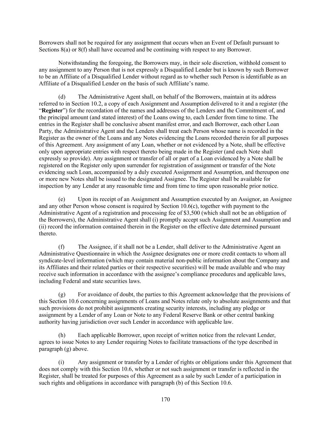 170 Borrowers shall not be required for any assignment that occurs when an Event of Default pursuant to Sections 8(a) or 8(f) shall have occurred and be continuing with respect to any Borrower. Notwithstanding the foregoing, the Borrowers may, in their sole discretion, withhold consent to any assignment to any Person that is not expressly a Disqualified Lender but is known by such Borrower to be an Affiliate of a Disqualified Lender without regard as to whether such Person is identifiable as an Affiliate of a Disqualified Lender on the basis of such Affiliate’s name. (d) The Administrative Agent shall, on behalf of the Borrowers, maintain at its address referred to in Section 10.2, a copy of each Assignment and Assumption delivered to it and a register (the “Register”) for the recordation of the names and addresses of the Lenders and the Commitment of, and the principal amount (and stated interest) of the Loans owing to, each Lender from time to time. The entries in the Register shall be conclusive absent manifest error, and each Borrower, each other Loan Party, the Administrative Agent and the Lenders shall treat each Person whose name is recorded in the Register as the owner of the Loans and any Notes evidencing the Loans recorded therein for all purposes of this Agreement. Any assignment of any Loan, whether or not evidenced by a Note, shall be effective only upon appropriate entries with respect thereto being made in the Register (and each Note shall expressly so provide). Any assignment or transfer of all or part of a Loan evidenced by a Note shall be registered on the Register only upon surrender for registration of assignment or transfer of the Note evidencing such Loan, accompanied by a duly executed Assignment and Assumption, and thereupon one or more new Notes shall be issued to the designated Assignee. The Register shall be available for inspection by any Lender at any reasonable time and from time to time upon reasonable prior notice. (e) Upon its receipt of an Assignment and Assumption executed by an Assignor, an Assignee and any other Person whose consent is required by Section 10.6(c), together with payment to the Administrative Agent of a registration and processing fee of $3,500 (which shall not be an obligation of the Borrowers), the Administrative Agent shall (i) promptly accept such Assignment and Assumption and (ii) record the information contained therein in the Register on the effective date determined pursuant thereto. (f) The Assignee, if it shall not be a Lender, shall deliver to the Administrative Agent an Administrative Questionnaire in which the Assignee designates one or more credit contacts to whom all syndicate-level information (which may contain material non-public information about the Company and its Affiliates and their related parties or their respective securities) will be made available and who may receive such information in accordance with the assignee’s compliance procedures and applicable laws, including Federal and state securities laws. (g) For avoidance of doubt, the parties to this Agreement acknowledge that the provisions of this Section 10.6 concerning assignments of Loans and Notes relate only to absolute assignments and that such provisions do not prohibit assignments creating security interests, including any pledge or assignment by a Lender of any Loan or Note to any Federal Reserve Bank or other central banking authority having jurisdiction over such Lender in accordance with applicable law. (h) Each applicable Borrower, upon receipt of written notice from the relevant Lender, agrees to issue Notes to any Lender requiring Notes to facilitate transactions of the type described in paragraph (g) above. (i) Any assignment or transfer by a Lender of rights or obligations under this Agreement that does not comply with this Section 10.6, whether or not such assignment or transfer is reflected in the Register, shall be treated for purposes of this Agreement as a sale by such Lender of a participation in such rights and obligations in accordance with paragraph (b) of this Section 10.6.