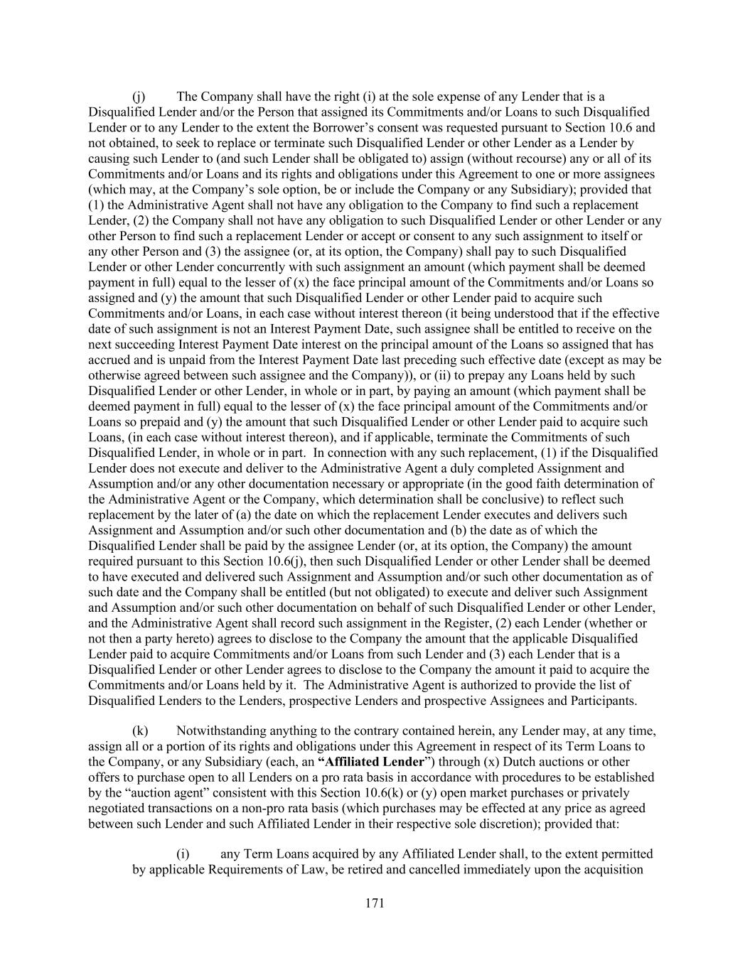 171 (j) The Company shall have the right (i) at the sole expense of any Lender that is a Disqualified Lender and/or the Person that assigned its Commitments and/or Loans to such Disqualified Lender or to any Lender to the extent the Borrower’s consent was requested pursuant to Section 10.6 and not obtained, to seek to replace or terminate such Disqualified Lender or other Lender as a Lender by causing such Lender to (and such Lender shall be obligated to) assign (without recourse) any or all of its Commitments and/or Loans and its rights and obligations under this Agreement to one or more assignees (which may, at the Company’s sole option, be or include the Company or any Subsidiary); provided that (1) the Administrative Agent shall not have any obligation to the Company to find such a replacement Lender, (2) the Company shall not have any obligation to such Disqualified Lender or other Lender or any other Person to find such a replacement Lender or accept or consent to any such assignment to itself or any other Person and (3) the assignee (or, at its option, the Company) shall pay to such Disqualified Lender or other Lender concurrently with such assignment an amount (which payment shall be deemed payment in full) equal to the lesser of (x) the face principal amount of the Commitments and/or Loans so assigned and (y) the amount that such Disqualified Lender or other Lender paid to acquire such Commitments and/or Loans, in each case without interest thereon (it being understood that if the effective date of such assignment is not an Interest Payment Date, such assignee shall be entitled to receive on the next succeeding Interest Payment Date interest on the principal amount of the Loans so assigned that has accrued and is unpaid from the Interest Payment Date last preceding such effective date (except as may be otherwise agreed between such assignee and the Company)), or (ii) to prepay any Loans held by such Disqualified Lender or other Lender, in whole or in part, by paying an amount (which payment shall be deemed payment in full) equal to the lesser of (x) the face principal amount of the Commitments and/or Loans so prepaid and (y) the amount that such Disqualified Lender or other Lender paid to acquire such Loans, (in each case without interest thereon), and if applicable, terminate the Commitments of such Disqualified Lender, in whole or in part. In connection with any such replacement, (1) if the Disqualified Lender does not execute and deliver to the Administrative Agent a duly completed Assignment and Assumption and/or any other documentation necessary or appropriate (in the good faith determination of the Administrative Agent or the Company, which determination shall be conclusive) to reflect such replacement by the later of (a) the date on which the replacement Lender executes and delivers such Assignment and Assumption and/or such other documentation and (b) the date as of which the Disqualified Lender shall be paid by the assignee Lender (or, at its option, the Company) the amount required pursuant to this Section 10.6(j), then such Disqualified Lender or other Lender shall be deemed to have executed and delivered such Assignment and Assumption and/or such other documentation as of such date and the Company shall be entitled (but not obligated) to execute and deliver such Assignment and Assumption and/or such other documentation on behalf of such Disqualified Lender or other Lender, and the Administrative Agent shall record such assignment in the Register, (2) each Lender (whether or not then a party hereto) agrees to disclose to the Company the amount that the applicable Disqualified Lender paid to acquire Commitments and/or Loans from such Lender and (3) each Lender that is a Disqualified Lender or other Lender agrees to disclose to the Company the amount it paid to acquire the Commitments and/or Loans held by it. The Administrative Agent is authorized to provide the list of Disqualified Lenders to the Lenders, prospective Lenders and prospective Assignees and Participants. (k) Notwithstanding anything to the contrary contained herein, any Lender may, at any time, assign all or a portion of its rights and obligations under this Agreement in respect of its Term Loans to the Company, or any Subsidiary (each, an “Affiliated Lender”) through (x) Dutch auctions or other offers to purchase open to all Lenders on a pro rata basis in accordance with procedures to be established by the “auction agent” consistent with this Section 10.6(k) or (y) open market purchases or privately negotiated transactions on a non-pro rata basis (which purchases may be effected at any price as agreed between such Lender and such Affiliated Lender in their respective sole discretion); provided that: (i) any Term Loans acquired by any Affiliated Lender shall, to the extent permitted by applicable Requirements of Law, be retired and cancelled immediately upon the acquisition