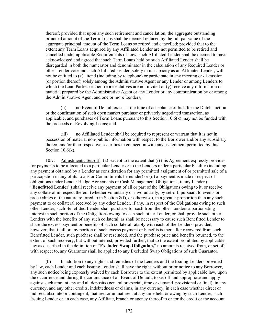 172 thereof; provided that upon any such retirement and cancellation, the aggregate outstanding principal amount of the Term Loans shall be deemed reduced by the full par value of the aggregate principal amount of the Term Loans so retired and cancelled; provided that to the extent any Term Loans acquired by any Affiliated Lender are not permitted to be retired and cancelled under applicable Requirements of Law, such Affiliated Lender shall be deemed to have acknowledged and agreed that such Term Loans held by such Affiliated Lender shall be disregarded in both the numerator and denominator in the calculation of any Required Lender or other Lender vote and such Affiliated Lender, solely in its capacity as an Affiliated Lender, will not be entitled to (x) attend (including by telephone) or participate in any meeting or discussion (or portion thereof) solely among the Administrative Agent or any Lender or among Lenders to which the Loan Parties or their representatives are not invited or (y) receive any information or material prepared by the Administrative Agent or any Lender or any communication by or among the Administrative Agent and one or more Lenders; (ii) no Event of Default exists at the time of acceptance of bids for the Dutch auction or the confirmation of such open market purchase or privately negotiated transaction, as applicable, and purchases of Term Loans pursuant to this Section 10.6(k) may not be funded with the proceeds of Revolving Loans; and (iii) no Affiliated Lender shall be required to represent or warrant that it is not in possession of material non-public information with respect to the Borrower and/or any subsidiary thereof and/or their respective securities in connection with any assignment permitted by this Section 10.6(k). 10.7. Adjustments; Set-off. (a) Except to the extent that (i) this Agreement expressly provides for payments to be allocated to a particular Lender or to the Lenders under a particular Facility (including any payment obtained by a Lender as consideration for any permitted assignment of or permitted sale of a participation in any of its Loans or Commitments hereunder) or (ii) a payment is made in respect of obligations under Lender Hedge Agreements or Cash Management Obligations, if any Lender (a “Benefitted Lender”) shall receive any payment of all or part of the Obligations owing to it, or receive any collateral in respect thereof (whether voluntarily or involuntarily, by set-off, pursuant to events or proceedings of the nature referred to in Section 8(f), or otherwise), in a greater proportion than any such payment to or collateral received by any other Lender, if any, in respect of the Obligations owing to such other Lender, such Benefitted Lender shall purchase for cash from the other Lenders a participating interest in such portion of the Obligations owing to each such other Lender, or shall provide such other Lenders with the benefits of any such collateral, as shall be necessary to cause such Benefitted Lender to share the excess payment or benefits of such collateral ratably with each of the Lenders; provided, however, that if all or any portion of such excess payment or benefits is thereafter recovered from such Benefitted Lender, such purchase shall be rescinded, and the purchase price and benefits returned, to the extent of such recovery, but without interest; provided further, that to the extent prohibited by applicable law as described in the definition of “Excluded Swap Obligation,” no amounts received from, or set off with respect to, any Guarantor shall be applied to any Excluded Swap Obligations of such Guarantor. (b) In addition to any rights and remedies of the Lenders and the Issuing Lenders provided by law, each Lender and each Issuing Lender shall have the right, without prior notice to any Borrower, any such notice being expressly waived by each Borrower to the extent permitted by applicable law, upon the occurrence and during the continuance of an Event of Default, to set off and appropriate and apply against such amount any and all deposits (general or special, time or demand, provisional or final), in any currency, and any other credits, indebtedness or claims, in any currency, in each case whether direct or indirect, absolute or contingent, matured or unmatured, at any time held or owing by such Lender, such Issuing Lender or, in each case, any Affiliate, branch or agency thereof to or for the credit or the account