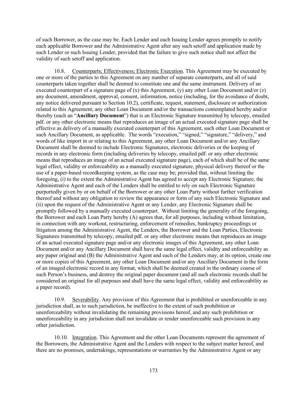 173 of such Borrower, as the case may be. Each Lender and each Issuing Lender agrees promptly to notify each applicable Borrower and the Administrative Agent after any such setoff and application made by such Lender or such Issuing Lender, provided that the failure to give such notice shall not affect the validity of such setoff and application. 10.8. Counterparts; Effectiveness; Electronic Execution. This Agreement may be executed by one or more of the parties to this Agreement on any number of separate counterparts, and all of said counterparts taken together shall be deemed to constitute one and the same instrument. Delivery of an executed counterpart of a signature page of (x) this Agreement, (y) any other Loan Document and/or (z) any document, amendment, approval, consent, information, notice (including, for the avoidance of doubt, any notice delivered pursuant to Section 10.2), certificate, request, statement, disclosure or authorization related to this Agreement, any other Loan Document and/or the transactions contemplated hereby and/or thereby (each an “Ancillary Document”) that is an Electronic Signature transmitted by telecopy, emailed pdf. or any other electronic means that reproduces an image of an actual executed signature page shall be effective as delivery of a manually executed counterpart of this Agreement, such other Loan Document or such Ancillary Document, as applicable. The words “execution,” “signed,” “signature,” “delivery,” and words of like import in or relating to this Agreement, any other Loan Document and/or any Ancillary Document shall be deemed to include Electronic Signatures, electronic deliveries or the keeping of records in any electronic form (including deliveries by telecopy, emailed pdf. or any other electronic means that reproduces an image of an actual executed signature page), each of which shall be of the same legal effect, validity or enforceability as a manually executed signature, physical delivery thereof or the use of a paper-based recordkeeping system, as the case may be; provided that, without limiting the foregoing, (i) to the extent the Administrative Agent has agreed to accept any Electronic Signature, the Administrative Agent and each of the Lenders shall be entitled to rely on such Electronic Signature purportedly given by or on behalf of the Borrower or any other Loan Party without further verification thereof and without any obligation to review the appearance or form of any such Electronic Signature and (ii) upon the request of the Administrative Agent or any Lender, any Electronic Signature shall be promptly followed by a manually executed counterpart. Without limiting the generality of the foregoing, the Borrower and each Loan Party hereby (A) agrees that, for all purposes, including without limitation, in connection with any workout, restructuring, enforcement of remedies, bankruptcy proceedings or litigation among the Administrative Agent, the Lenders, the Borrower and the Loan Parties, Electronic Signatures transmitted by telecopy, emailed pdf. or any other electronic means that reproduces an image of an actual executed signature page and/or any electronic images of this Agreement, any other Loan Document and/or any Ancillary Document shall have the same legal effect, validity and enforceability as any paper original and (B) the Administrative Agent and each of the Lenders may, at its option, create one or more copies of this Agreement, any other Loan Document and/or any Ancillary Document in the form of an imaged electronic record in any format, which shall be deemed created in the ordinary course of such Person’s business, and destroy the original paper document (and all such electronic records shall be considered an original for all purposes and shall have the same legal effect, validity and enforceability as a paper record). 10.9. Severability. Any provision of this Agreement that is prohibited or unenforceable in any jurisdiction shall, as to such jurisdiction, be ineffective to the extent of such prohibition or unenforceability without invalidating the remaining provisions hereof, and any such prohibition or unenforceability in any jurisdiction shall not invalidate or render unenforceable such provision in any other jurisdiction. 10.10. Integration. This Agreement and the other Loan Documents represent the agreement of the Borrowers, the Administrative Agent and the Lenders with respect to the subject matter hereof, and there are no promises, undertakings, representations or warranties by the Administrative Agent or any