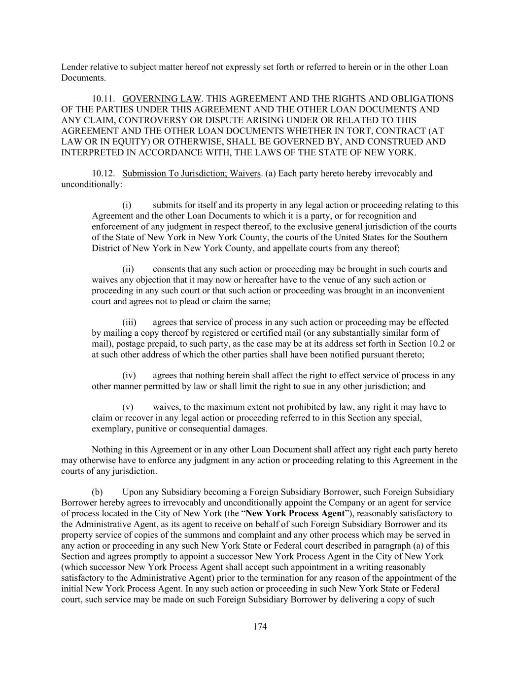 174 Lender relative to subject matter hereof not expressly set forth or referred to herein or in the other Loan Documents. 10.11. GOVERNING LAW. THIS AGREEMENT AND THE RIGHTS AND OBLIGATIONS OF THE PARTIES UNDER THIS AGREEMENT AND THE OTHER LOAN DOCUMENTS AND ANY CLAIM, CONTROVERSY OR DISPUTE ARISING UNDER OR RELATED TO THIS AGREEMENT AND THE OTHER LOAN DOCUMENTS WHETHER IN TORT, CONTRACT (AT LAW OR IN EQUITY) OR OTHERWISE, SHALL BE GOVERNED BY, AND CONSTRUED AND INTERPRETED IN ACCORDANCE WITH, THE LAWS OF THE STATE OF NEW YORK. 10.12. Submission To Jurisdiction; Waivers. (a) Each party hereto hereby irrevocably and unconditionally: (i) submits for itself and its property in any legal action or proceeding relating to this Agreement and the other Loan Documents to which it is a party, or for recognition and enforcement of any judgment in respect thereof, to the exclusive general jurisdiction of the courts of the State of New York in New York County, the courts of the United States for the Southern District of New York in New York County, and appellate courts from any thereof; (ii) consents that any such action or proceeding may be brought in such courts and waives any objection that it may now or hereafter have to the venue of any such action or proceeding in any such court or that such action or proceeding was brought in an inconvenient court and agrees not to plead or claim the same; (iii) agrees that service of process in any such action or proceeding may be effected by mailing a copy thereof by registered or certified mail (or any substantially similar form of mail), postage prepaid, to such party, as the case may be at its address set forth in Section 10.2 or at such other address of which the other parties shall have been notified pursuant thereto; (iv) agrees that nothing herein shall affect the right to effect service of process in any other manner permitted by law or shall limit the right to sue in any other jurisdiction; and (v) waives, to the maximum extent not prohibited by law, any right it may have to claim or recover in any legal action or proceeding referred to in this Section any special, exemplary, punitive or consequential damages. Nothing in this Agreement or in any other Loan Document shall affect any right each party hereto may otherwise have to enforce any judgment in any action or proceeding relating to this Agreement in the courts of any jurisdiction. (b) Upon any Subsidiary becoming a Foreign Subsidiary Borrower, such Foreign Subsidiary Borrower hereby agrees to irrevocably and unconditionally appoint the Company or an agent for service of process located in the City of New York (the “New York Process Agent”), reasonably satisfactory to the Administrative Agent, as its agent to receive on behalf of such Foreign Subsidiary Borrower and its property service of copies of the summons and complaint and any other process which may be served in any action or proceeding in any such New York State or Federal court described in paragraph (a) of this Section and agrees promptly to appoint a successor New York Process Agent in the City of New York (which successor New York Process Agent shall accept such appointment in a writing reasonably satisfactory to the Administrative Agent) prior to the termination for any reason of the appointment of the initial New York Process Agent. In any such action or proceeding in such New York State or Federal court, such service may be made on such Foreign Subsidiary Borrower by delivering a copy of such