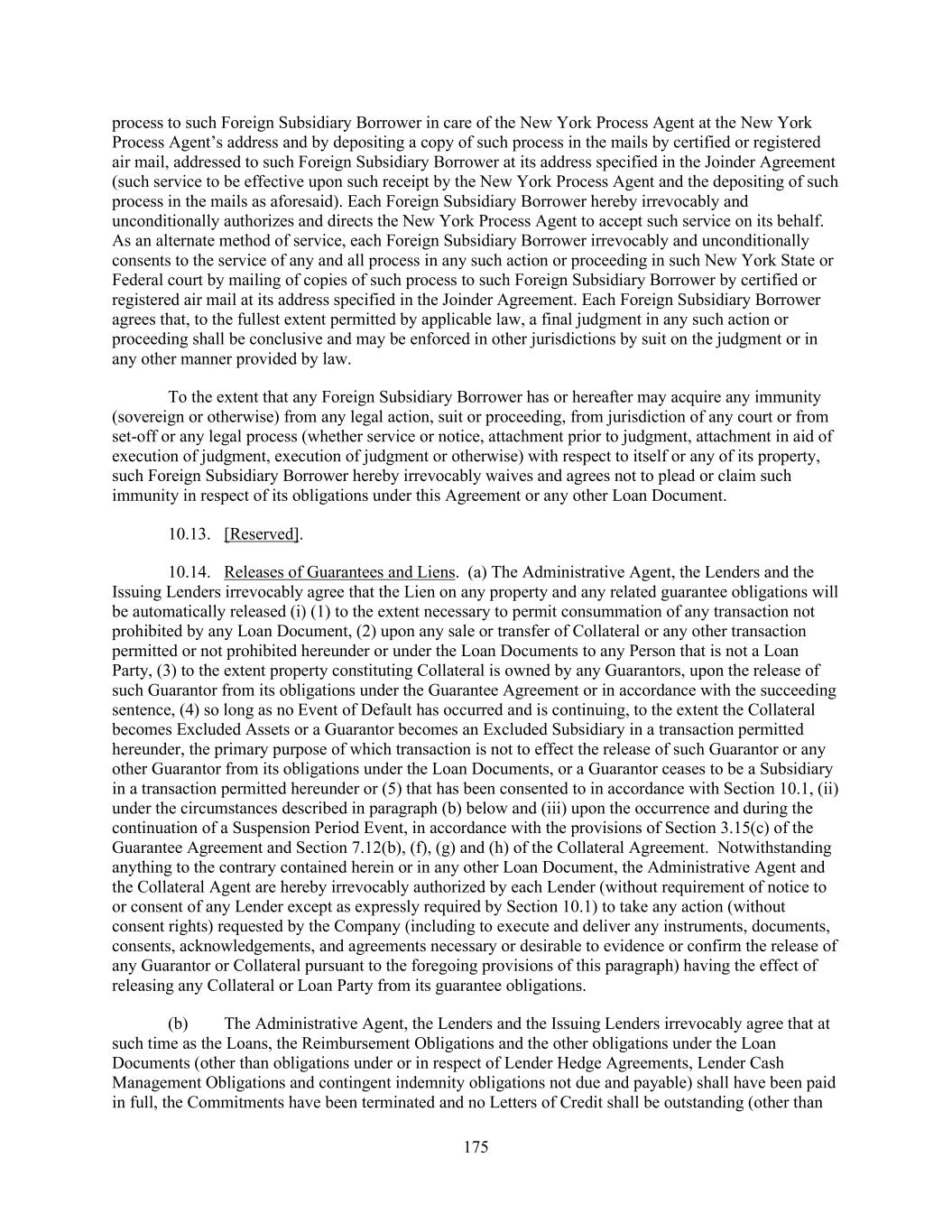 175 process to such Foreign Subsidiary Borrower in care of the New York Process Agent at the New York Process Agent’s address and by depositing a copy of such process in the mails by certified or registered air mail, addressed to such Foreign Subsidiary Borrower at its address specified in the Joinder Agreement (such service to be effective upon such receipt by the New York Process Agent and the depositing of such process in the mails as aforesaid). Each Foreign Subsidiary Borrower hereby irrevocably and unconditionally authorizes and directs the New York Process Agent to accept such service on its behalf. As an alternate method of service, each Foreign Subsidiary Borrower irrevocably and unconditionally consents to the service of any and all process in any such action or proceeding in such New York State or Federal court by mailing of copies of such process to such Foreign Subsidiary Borrower by certified or registered air mail at its address specified in the Joinder Agreement. Each Foreign Subsidiary Borrower agrees that, to the fullest extent permitted by applicable law, a final judgment in any such action or proceeding shall be conclusive and may be enforced in other jurisdictions by suit on the judgment or in any other manner provided by law. To the extent that any Foreign Subsidiary Borrower has or hereafter may acquire any immunity (sovereign or otherwise) from any legal action, suit or proceeding, from jurisdiction of any court or from set-off or any legal process (whether service or notice, attachment prior to judgment, attachment in aid of execution of judgment, execution of judgment or otherwise) with respect to itself or any of its property, such Foreign Subsidiary Borrower hereby irrevocably waives and agrees not to plead or claim such immunity in respect of its obligations under this Agreement or any other Loan Document. 10.13. [Reserved]. 10.14. Releases of Guarantees and Liens. (a) The Administrative Agent, the Lenders and the Issuing Lenders irrevocably agree that the Lien on any property and any related guarantee obligations will be automatically released (i) (1) to the extent necessary to permit consummation of any transaction not prohibited by any Loan Document, (2) upon any sale or transfer of Collateral or any other transaction permitted or not prohibited hereunder or under the Loan Documents to any Person that is not a Loan Party, (3) to the extent property constituting Collateral is owned by any Guarantors, upon the release of such Guarantor from its obligations under the Guarantee Agreement or in accordance with the succeeding sentence, (4) so long as no Event of Default has occurred and is continuing, to the extent the Collateral becomes Excluded Assets or a Guarantor becomes an Excluded Subsidiary in a transaction permitted hereunder, the primary purpose of which transaction is not to effect the release of such Guarantor or any other Guarantor from its obligations under the Loan Documents, or a Guarantor ceases to be a Subsidiary in a transaction permitted hereunder or (5) that has been consented to in accordance with Section 10.1, (ii) under the circumstances described in paragraph (b) below and (iii) upon the occurrence and during the continuation of a Suspension Period Event, in accordance with the provisions of Section 3.15(c) of the Guarantee Agreement and Section 7.12(b), (f), (g) and (h) of the Collateral Agreement. Notwithstanding anything to the contrary contained herein or in any other Loan Document, the Administrative Agent and the Collateral Agent are hereby irrevocably authorized by each Lender (without requirement of notice to or consent of any Lender except as expressly required by Section 10.1) to take any action (without consent rights) requested by the Company (including to execute and deliver any instruments, documents, consents, acknowledgements, and agreements necessary or desirable to evidence or confirm the release of any Guarantor or Collateral pursuant to the foregoing provisions of this paragraph) having the effect of releasing any Collateral or Loan Party from its guarantee obligations. (b) The Administrative Agent, the Lenders and the Issuing Lenders irrevocably agree that at such time as the Loans, the Reimbursement Obligations and the other obligations under the Loan Documents (other than obligations under or in respect of Lender Hedge Agreements, Lender Cash Management Obligations and contingent indemnity obligations not due and payable) shall have been paid in full, the Commitments have been terminated and no Letters of Credit shall be outstanding (other than
