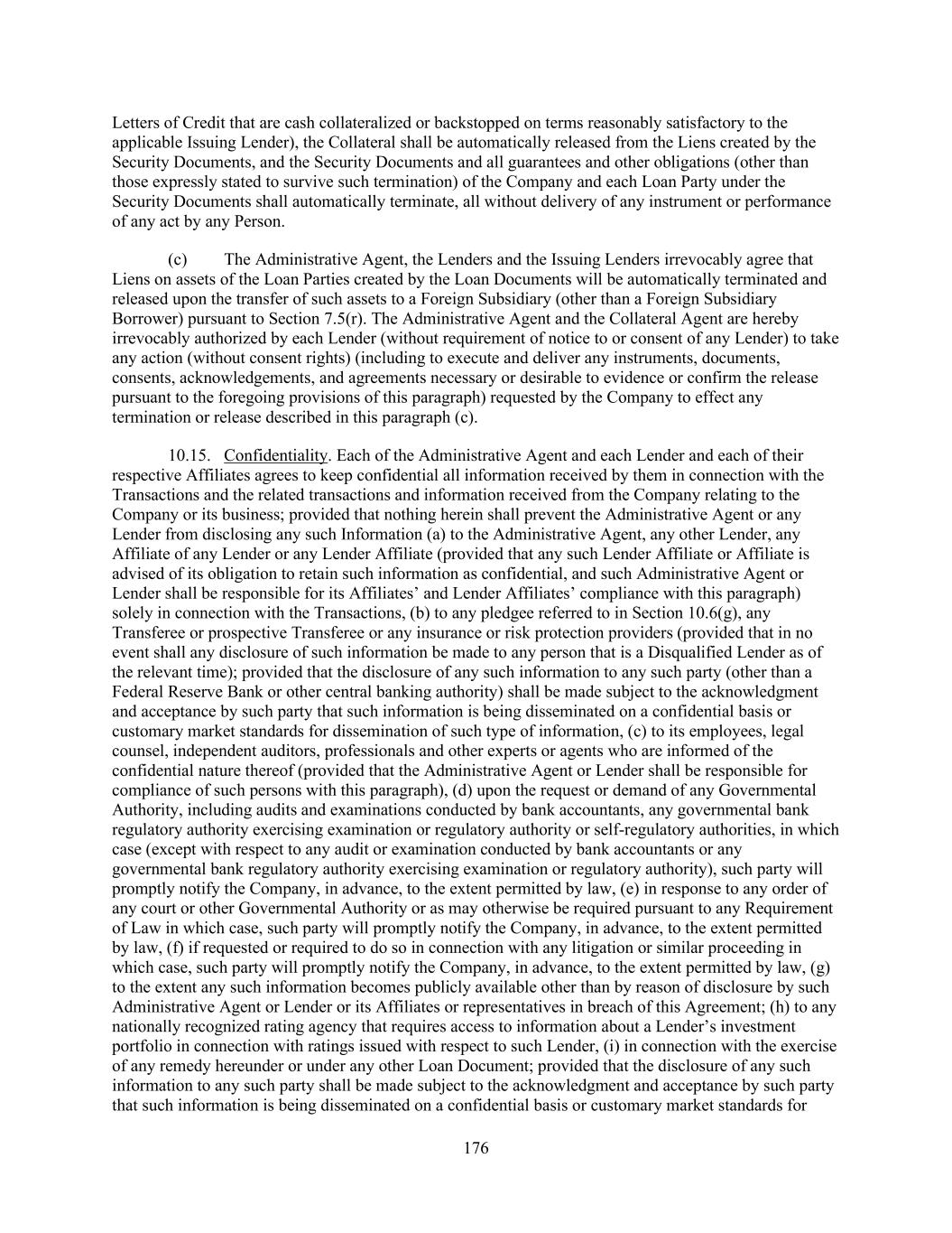 176 Letters of Credit that are cash collateralized or backstopped on terms reasonably satisfactory to the applicable Issuing Lender), the Collateral shall be automatically released from the Liens created by the Security Documents, and the Security Documents and all guarantees and other obligations (other than those expressly stated to survive such termination) of the Company and each Loan Party under the Security Documents shall automatically terminate, all without delivery of any instrument or performance of any act by any Person. (c) The Administrative Agent, the Lenders and the Issuing Lenders irrevocably agree that Liens on assets of the Loan Parties created by the Loan Documents will be automatically terminated and released upon the transfer of such assets to a Foreign Subsidiary (other than a Foreign Subsidiary Borrower) pursuant to Section 7.5(r). The Administrative Agent and the Collateral Agent are hereby irrevocably authorized by each Lender (without requirement of notice to or consent of any Lender) to take any action (without consent rights) (including to execute and deliver any instruments, documents, consents, acknowledgements, and agreements necessary or desirable to evidence or confirm the release pursuant to the foregoing provisions of this paragraph) requested by the Company to effect any termination or release described in this paragraph (c). 10.15. Confidentiality. Each of the Administrative Agent and each Lender and each of their respective Affiliates agrees to keep confidential all information received by them in connection with the Transactions and the related transactions and information received from the Company relating to the Company or its business; provided that nothing herein shall prevent the Administrative Agent or any Lender from disclosing any such Information (a) to the Administrative Agent, any other Lender, any Affiliate of any Lender or any Lender Affiliate (provided that any such Lender Affiliate or Affiliate is advised of its obligation to retain such information as confidential, and such Administrative Agent or Lender shall be responsible for its Affiliates’ and Lender Affiliates’ compliance with this paragraph) solely in connection with the Transactions, (b) to any pledgee referred to in Section 10.6(g), any Transferee or prospective Transferee or any insurance or risk protection providers (provided that in no event shall any disclosure of such information be made to any person that is a Disqualified Lender as of the relevant time); provided that the disclosure of any such information to any such party (other than a Federal Reserve Bank or other central banking authority) shall be made subject to the acknowledgment and acceptance by such party that such information is being disseminated on a confidential basis or customary market standards for dissemination of such type of information, (c) to its employees, legal counsel, independent auditors, professionals and other experts or agents who are informed of the confidential nature thereof (provided that the Administrative Agent or Lender shall be responsible for compliance of such persons with this paragraph), (d) upon the request or demand of any Governmental Authority, including audits and examinations conducted by bank accountants, any governmental bank regulatory authority exercising examination or regulatory authority or self-regulatory authorities, in which case (except with respect to any audit or examination conducted by bank accountants or any governmental bank regulatory authority exercising examination or regulatory authority), such party will promptly notify the Company, in advance, to the extent permitted by law, (e) in response to any order of any court or other Governmental Authority or as may otherwise be required pursuant to any Requirement of Law in which case, such party will promptly notify the Company, in advance, to the extent permitted by law, (f) if requested or required to do so in connection with any litigation or similar proceeding in which case, such party will promptly notify the Company, in advance, to the extent permitted by law, (g) to the extent any such information becomes publicly available other than by reason of disclosure by such Administrative Agent or Lender or its Affiliates or representatives in breach of this Agreement; (h) to any nationally recognized rating agency that requires access to information about a Lender’s investment portfolio in connection with ratings issued with respect to such Lender, (i) in connection with the exercise of any remedy hereunder or under any other Loan Document; provided that the disclosure of any such information to any such party shall be made subject to the acknowledgment and acceptance by such party that such information is being disseminated on a confidential basis or customary market standards for
