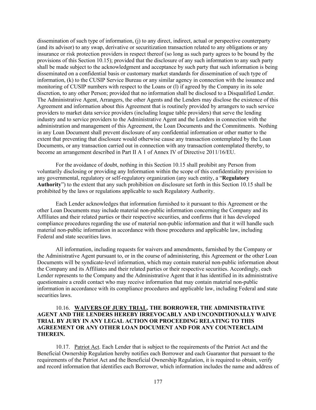 177 dissemination of such type of information, (j) to any direct, indirect, actual or perspective counterparty (and its advisor) to any swap, derivative or securitization transaction related to any obligations or any insurance or risk protection providers in respect thereof (so long as such party agrees to be bound by the provisions of this Section 10.15); provided that the disclosure of any such information to any such party shall be made subject to the acknowledgment and acceptance by such party that such information is being disseminated on a confidential basis or customary market standards for dissemination of such type of information, (k) to the CUSIP Service Bureau or any similar agency in connection with the issuance and monitoring of CUSIP numbers with respect to the Loans or (l) if agreed by the Company in its sole discretion, to any other Person; provided that no information shall be disclosed to a Disqualified Lender. The Administrative Agent, Arrangers, the other Agents and the Lenders may disclose the existence of this Agreement and information about this Agreement that is routinely provided by arrangers to such service providers to market data service providers (including league table providers) that serve the lending industry and to service providers to the Administrative Agent and the Lenders in connection with the administration and management of this Agreement, the Loan Documents and the Commitments. Nothing in any Loan Document shall prevent disclosure of any confidential information or other matter to the extent that preventing that disclosure would otherwise cause any transaction contemplated by the Loan Documents, or any transaction carried out in connection with any transaction contemplated thereby, to become an arrangement described in Part II A 1 of Annex IV of Directive 2011/16/EU. For the avoidance of doubt, nothing in this Section 10.15 shall prohibit any Person from voluntarily disclosing or providing any Information within the scope of this confidentiality provision to any governmental, regulatory or self-regulatory organization (any such entity, a “Regulatory Authority”) to the extent that any such prohibition on disclosure set forth in this Section 10.15 shall be prohibited by the laws or regulations applicable to such Regulatory Authority. Each Lender acknowledges that information furnished to it pursuant to this Agreement or the other Loan Documents may include material non-public information concerning the Company and its Affiliates and their related parties or their respective securities, and confirms that it has developed compliance procedures regarding the use of material non-public information and that it will handle such material non-public information in accordance with those procedures and applicable law, including Federal and state securities laws. All information, including requests for waivers and amendments, furnished by the Company or the Administrative Agent pursuant to, or in the course of administering, this Agreement or the other Loan Documents will be syndicate-level information, which may contain material non-public information about the Company and its Affiliates and their related parties or their respective securities. Accordingly, each Lender represents to the Company and the Administrative Agent that it has identified in its administrative questionnaire a credit contact who may receive information that may contain material non-public information in accordance with its compliance procedures and applicable law, including Federal and state securities laws. 10.16. WAIVERS OF JURY TRIAL. THE BORROWER, THE ADMINISTRATIVE AGENT AND THE LENDERS HEREBY IRREVOCABLY AND UNCONDITIONALLY WAIVE TRIAL BY JURY IN ANY LEGAL ACTION OR PROCEEDING RELATING TO THIS AGREEMENT OR ANY OTHER LOAN DOCUMENT AND FOR ANY COUNTERCLAIM THEREIN. 10.17. Patriot Act. Each Lender that is subject to the requirements of the Patriot Act and the Beneficial Ownership Regulation hereby notifies each Borrower and each Guarantor that pursuant to the requirements of the Patriot Act and the Beneficial Ownership Regulation, it is required to obtain, verify and record information that identifies each Borrower, which information includes the name and address of