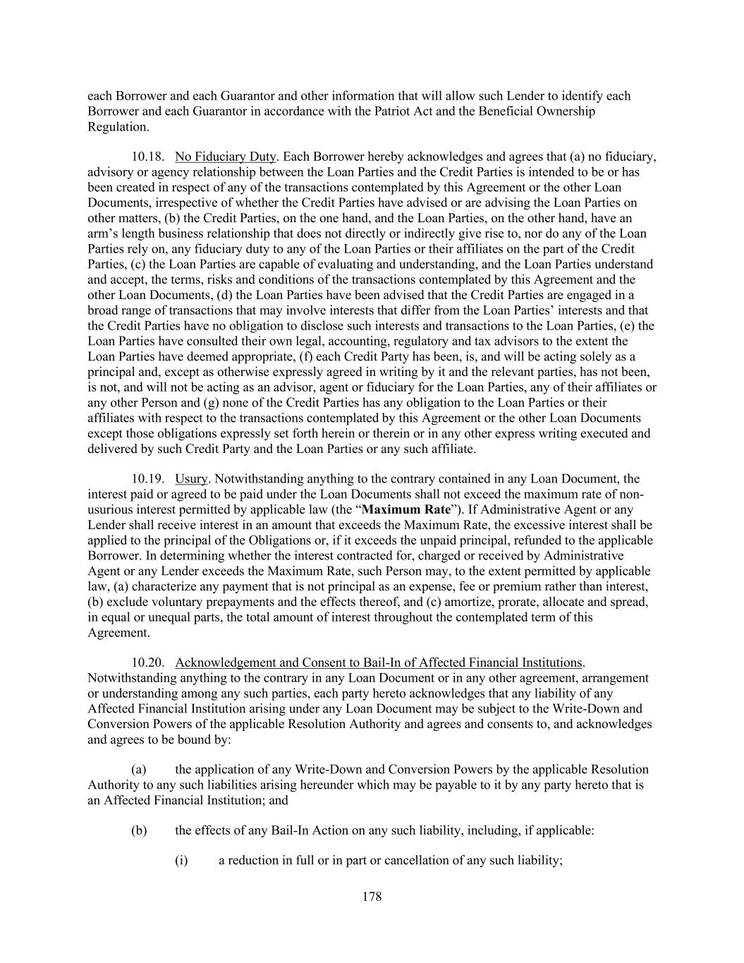 178 each Borrower and each Guarantor and other information that will allow such Lender to identify each Borrower and each Guarantor in accordance with the Patriot Act and the Beneficial Ownership Regulation. 10.18. No Fiduciary Duty. Each Borrower hereby acknowledges and agrees that (a) no fiduciary, advisory or agency relationship between the Loan Parties and the Credit Parties is intended to be or has been created in respect of any of the transactions contemplated by this Agreement or the other Loan Documents, irrespective of whether the Credit Parties have advised or are advising the Loan Parties on other matters, (b) the Credit Parties, on the one hand, and the Loan Parties, on the other hand, have an arm’s length business relationship that does not directly or indirectly give rise to, nor do any of the Loan Parties rely on, any fiduciary duty to any of the Loan Parties or their affiliates on the part of the Credit Parties, (c) the Loan Parties are capable of evaluating and understanding, and the Loan Parties understand and accept, the terms, risks and conditions of the transactions contemplated by this Agreement and the other Loan Documents, (d) the Loan Parties have been advised that the Credit Parties are engaged in a broad range of transactions that may involve interests that differ from the Loan Parties’ interests and that the Credit Parties have no obligation to disclose such interests and transactions to the Loan Parties, (e) the Loan Parties have consulted their own legal, accounting, regulatory and tax advisors to the extent the Loan Parties have deemed appropriate, (f) each Credit Party has been, is, and will be acting solely as a principal and, except as otherwise expressly agreed in writing by it and the relevant parties, has not been, is not, and will not be acting as an advisor, agent or fiduciary for the Loan Parties, any of their affiliates or any other Person and (g) none of the Credit Parties has any obligation to the Loan Parties or their affiliates with respect to the transactions contemplated by this Agreement or the other Loan Documents except those obligations expressly set forth herein or therein or in any other express writing executed and delivered by such Credit Party and the Loan Parties or any such affiliate. 10.19. Usury. Notwithstanding anything to the contrary contained in any Loan Document, the interest paid or agreed to be paid under the Loan Documents shall not exceed the maximum rate of non- usurious interest permitted by applicable law (the “Maximum Rate”). If Administrative Agent or any Lender shall receive interest in an amount that exceeds the Maximum Rate, the excessive interest shall be applied to the principal of the Obligations or, if it exceeds the unpaid principal, refunded to the applicable Borrower. In determining whether the interest contracted for, charged or received by Administrative Agent or any Lender exceeds the Maximum Rate, such Person may, to the extent permitted by applicable law, (a) characterize any payment that is not principal as an expense, fee or premium rather than interest, (b) exclude voluntary prepayments and the effects thereof, and (c) amortize, prorate, allocate and spread, in equal or unequal parts, the total amount of interest throughout the contemplated term of this Agreement. 10.20. Acknowledgement and Consent to Bail-In of Affected Financial Institutions. Notwithstanding anything to the contrary in any Loan Document or in any other agreement, arrangement or understanding among any such parties, each party hereto acknowledges that any liability of any Affected Financial Institution arising under any Loan Document may be subject to the Write-Down and Conversion Powers of the applicable Resolution Authority and agrees and consents to, and acknowledges and agrees to be bound by: (a) the application of any Write-Down and Conversion Powers by the applicable Resolution Authority to any such liabilities arising hereunder which may be payable to it by any party hereto that is an Affected Financial Institution; and (b) the effects of any Bail-In Action on any such liability, including, if applicable: (i) a reduction in full or in part or cancellation of any such liability;