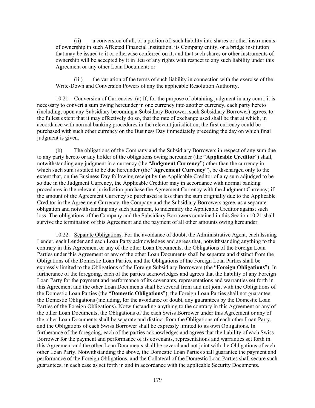 179 (ii) a conversion of all, or a portion of, such liability into shares or other instruments of ownership in such Affected Financial Institution, its Company entity, or a bridge institution that may be issued to it or otherwise conferred on it, and that such shares or other instruments of ownership will be accepted by it in lieu of any rights with respect to any such liability under this Agreement or any other Loan Document; or (iii) the variation of the terms of such liability in connection with the exercise of the Write-Down and Conversion Powers of any the applicable Resolution Authority. 10.21. Conversion of Currencies. (a) If, for the purpose of obtaining judgment in any court, it is necessary to convert a sum owing hereunder in one currency into another currency, each party hereto (including, upon any Subsidiary becoming a Subsidiary Borrower, such Subsidiary Borrower) agrees, to the fullest extent that it may effectively do so, that the rate of exchange used shall be that at which, in accordance with normal banking procedures in the relevant jurisdiction, the first currency could be purchased with such other currency on the Business Day immediately preceding the day on which final judgment is given. (b) The obligations of the Company and the Subsidiary Borrowers in respect of any sum due to any party hereto or any holder of the obligations owing hereunder (the “Applicable Creditor”) shall, notwithstanding any judgment in a currency (the “Judgment Currency”) other than the currency in which such sum is stated to be due hereunder (the “Agreement Currency”), be discharged only to the extent that, on the Business Day following receipt by the Applicable Creditor of any sum adjudged to be so due in the Judgment Currency, the Applicable Creditor may in accordance with normal banking procedures in the relevant jurisdiction purchase the Agreement Currency with the Judgment Currency; if the amount of the Agreement Currency so purchased is less than the sum originally due to the Applicable Creditor in the Agreement Currency, the Company and the Subsidiary Borrowers agree, as a separate obligation and notwithstanding any such judgment, to indemnify the Applicable Creditor against such loss. The obligations of the Company and the Subsidiary Borrowers contained in this Section 10.21 shall survive the termination of this Agreement and the payment of all other amounts owing hereunder. 10.22. Separate Obligations. For the avoidance of doubt, the Administrative Agent, each Issuing Lender, each Lender and each Loan Party acknowledges and agrees that, notwithstanding anything to the contrary in this Agreement or any of the other Loan Documents, the Obligations of the Foreign Loan Parties under this Agreement or any of the other Loan Documents shall be separate and distinct from the Obligations of the Domestic Loan Parties, and the Obligations of the Foreign Loan Parties shall be expressly limited to the Obligations of the Foreign Subsidiary Borrowers (the “Foreign Obligations”). In furtherance of the foregoing, each of the parties acknowledges and agrees that the liability of any Foreign Loan Party for the payment and performance of its covenants, representations and warranties set forth in this Agreement and the other Loan Documents shall be several from and not joint with the Obligations of the Domestic Loan Parties (the “Domestic Obligations”); the Foreign Loan Parties shall not guarantee the Domestic Obligations (including, for the avoidance of doubt, any guarantees by the Domestic Loan Parties of the Foreign Obligations). Notwithstanding anything to the contrary in this Agreement or any of the other Loan Documents, the Obligations of the each Swiss Borrower under this Agreement or any of the other Loan Documents shall be separate and distinct from the Obligations of each other Loan Party, and the Obligations of each Swiss Borrower shall be expressly limited to its own Obligations. In furtherance of the foregoing, each of the parties acknowledges and agrees that the liability of each Swiss Borrower for the payment and performance of its covenants, representations and warranties set forth in this Agreement and the other Loan Documents shall be several and not joint with the Obligations of each other Loan Party. Notwithstanding the above, the Domestic Loan Parties shall guarantee the payment and performance of the Foreign Obligations, and the Collateral of the Domestic Loan Parties shall secure such guarantees, in each case as set forth in and in accordance with the applicable Security Documents.