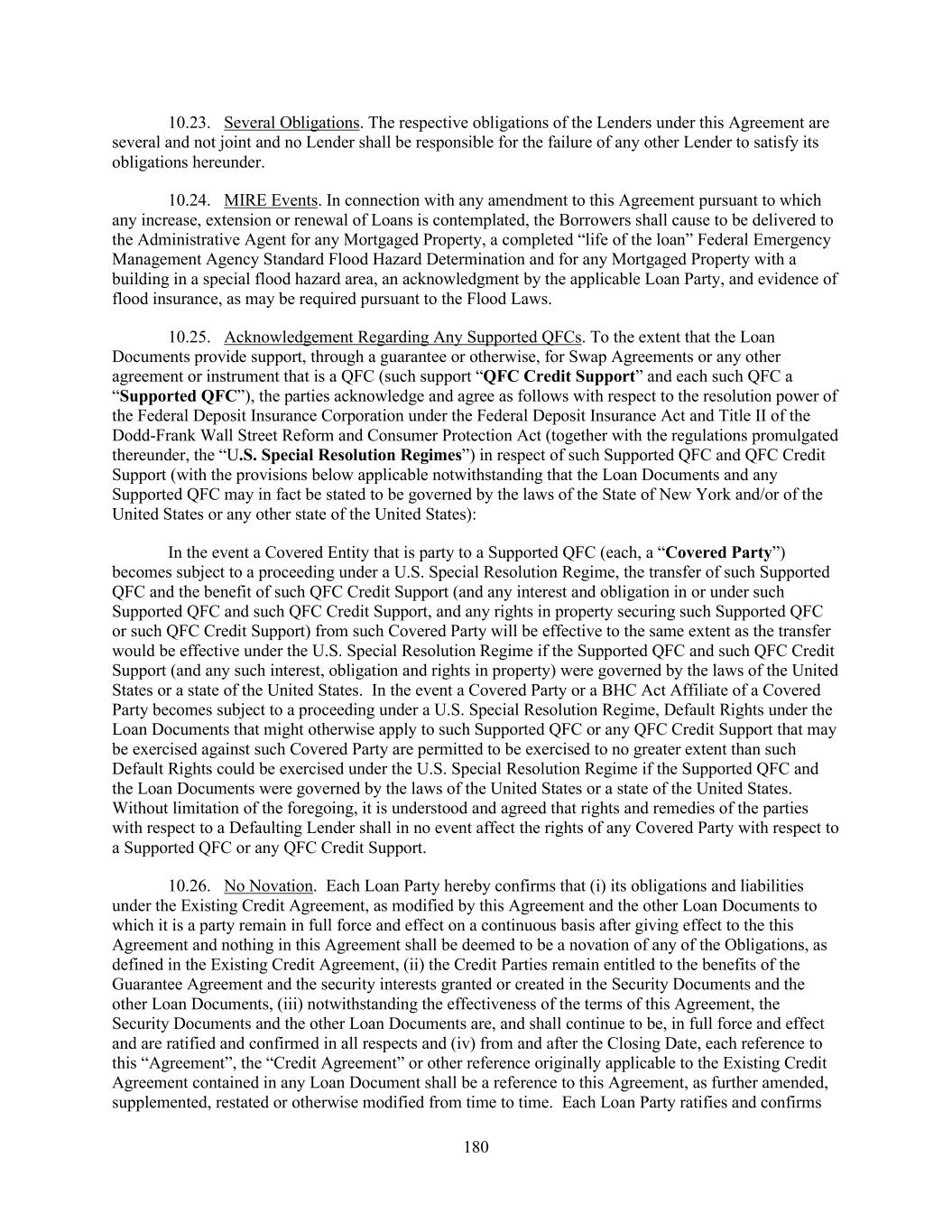 180 10.23. Several Obligations. The respective obligations of the Lenders under this Agreement are several and not joint and no Lender shall be responsible for the failure of any other Lender to satisfy its obligations hereunder. 10.24. MIRE Events. In connection with any amendment to this Agreement pursuant to which any increase, extension or renewal of Loans is contemplated, the Borrowers shall cause to be delivered to the Administrative Agent for any Mortgaged Property, a completed “life of the loan” Federal Emergency Management Agency Standard Flood Hazard Determination and for any Mortgaged Property with a building in a special flood hazard area, an acknowledgment by the applicable Loan Party, and evidence of flood insurance, as may be required pursuant to the Flood Laws. 10.25. Acknowledgement Regarding Any Supported QFCs. To the extent that the Loan Documents provide support, through a guarantee or otherwise, for Swap Agreements or any other agreement or instrument that is a QFC (such support “QFC Credit Support” and each such QFC a “Supported QFC”), the parties acknowledge and agree as follows with respect to the resolution power of the Federal Deposit Insurance Corporation under the Federal Deposit Insurance Act and Title II of the Dodd-Frank Wall Street Reform and Consumer Protection Act (together with the regulations promulgated thereunder, the “U.S. Special Resolution Regimes”) in respect of such Supported QFC and QFC Credit Support (with the provisions below applicable notwithstanding that the Loan Documents and any Supported QFC may in fact be stated to be governed by the laws of the State of New York and/or of the United States or any other state of the United States): In the event a Covered Entity that is party to a Supported QFC (each, a “Covered Party”) becomes subject to a proceeding under a U.S. Special Resolution Regime, the transfer of such Supported QFC and the benefit of such QFC Credit Support (and any interest and obligation in or under such Supported QFC and such QFC Credit Support, and any rights in property securing such Supported QFC or such QFC Credit Support) from such Covered Party will be effective to the same extent as the transfer would be effective under the U.S. Special Resolution Regime if the Supported QFC and such QFC Credit Support (and any such interest, obligation and rights in property) were governed by the laws of the United States or a state of the United States. In the event a Covered Party or a BHC Act Affiliate of a Covered Party becomes subject to a proceeding under a U.S. Special Resolution Regime, Default Rights under the Loan Documents that might otherwise apply to such Supported QFC or any QFC Credit Support that may be exercised against such Covered Party are permitted to be exercised to no greater extent than such Default Rights could be exercised under the U.S. Special Resolution Regime if the Supported QFC and the Loan Documents were governed by the laws of the United States or a state of the United States. Without limitation of the foregoing, it is understood and agreed that rights and remedies of the parties with respect to a Defaulting Lender shall in no event affect the rights of any Covered Party with respect to a Supported QFC or any QFC Credit Support. 10.26. No Novation. Each Loan Party hereby confirms that (i) its obligations and liabilities under the Existing Credit Agreement, as modified by this Agreement and the other Loan Documents to which it is a party remain in full force and effect on a continuous basis after giving effect to the this Agreement and nothing in this Agreement shall be deemed to be a novation of any of the Obligations, as defined in the Existing Credit Agreement, (ii) the Credit Parties remain entitled to the benefits of the Guarantee Agreement and the security interests granted or created in the Security Documents and the other Loan Documents, (iii) notwithstanding the effectiveness of the terms of this Agreement, the Security Documents and the other Loan Documents are, and shall continue to be, in full force and effect and are ratified and confirmed in all respects and (iv) from and after the Closing Date, each reference to this “Agreement”, the “Credit Agreement” or other reference originally applicable to the Existing Credit Agreement contained in any Loan Document shall be a reference to this Agreement, as further amended, supplemented, restated or otherwise modified from time to time. Each Loan Party ratifies and confirms