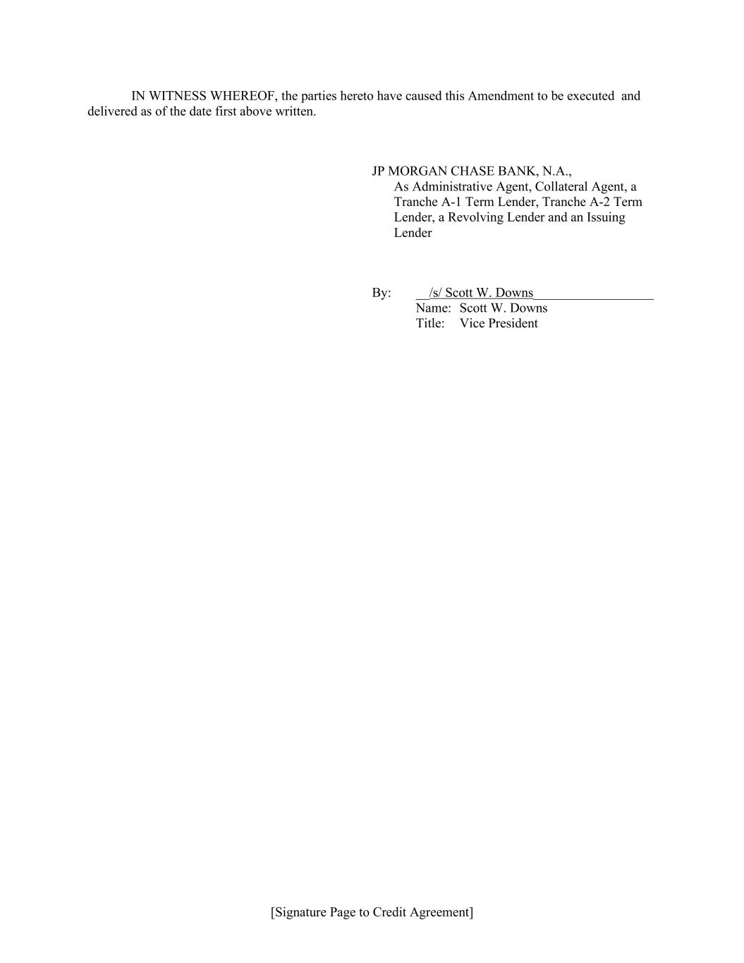 [Signature Page to Credit Agreement] IN WITNESS WHEREOF, the parties hereto have caused this Amendment to be executed and delivered as of the date first above written. JP MORGAN CHASE BANK, N.A., As Administrative Agent, Collateral Agent, a Tranche A-1 Term Lender, Tranche A-2 Term Lender, a Revolving Lender and an Issuing Lender By: __/s/ Scott W. Downs__________________ Name: Scott W. Downs Title: Vice President