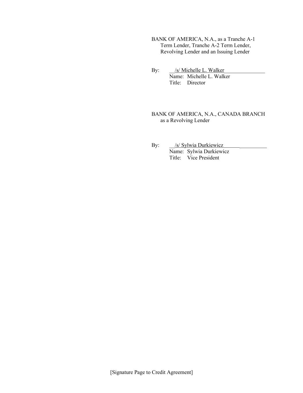 [Signature Page to Credit Agreement] BANK OF AMERICA, N.A., as a Tranche A-1 Term Lender, Tranche A-2 Term Lender, Revolving Lender and an Issuing Lender By: __/s/ Michelle L. Walker_______________ Name: Michelle L. Walker Title: Director BANK OF AMERICA, N.A., CANADA BRANCH as a Revolving Lender By: __/s/ Sylwia Durkiewicz __________ Name: Sylwia Durkiewicz Title: Vice President