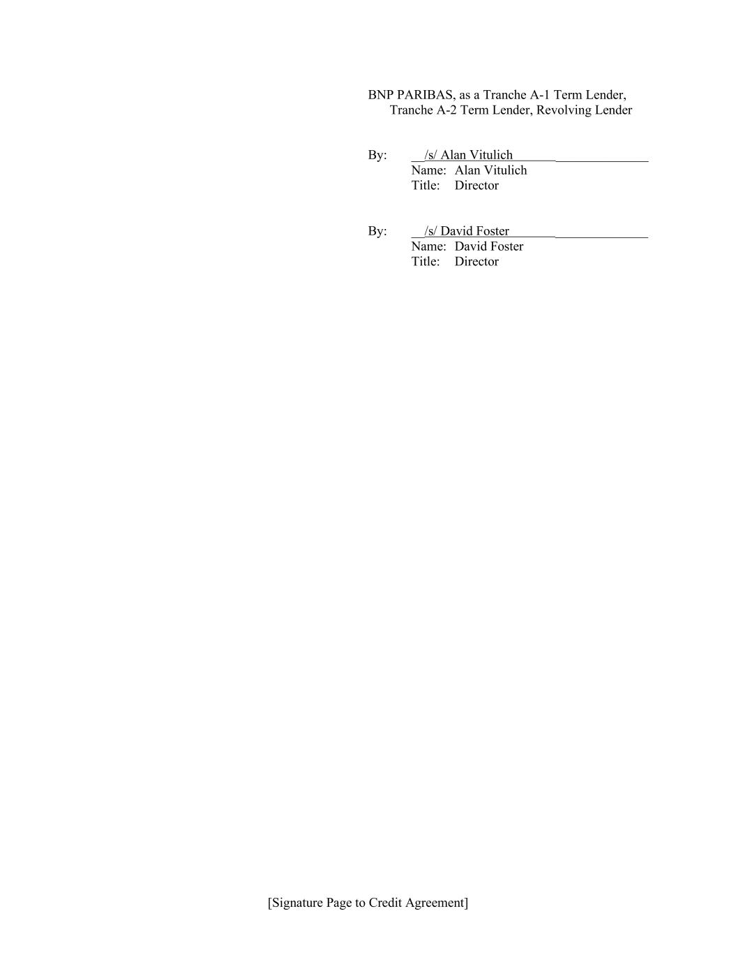 [Signature Page to Credit Agreement] BNP PARIBAS, as a Tranche A-1 Term Lender, Tranche A-2 Term Lender, Revolving Lender By: __/s/ Alan Vitulich ______________ Name: Alan Vitulich Title: Director By: __/s/ David Foster ______________ Name: David Foster Title: Director