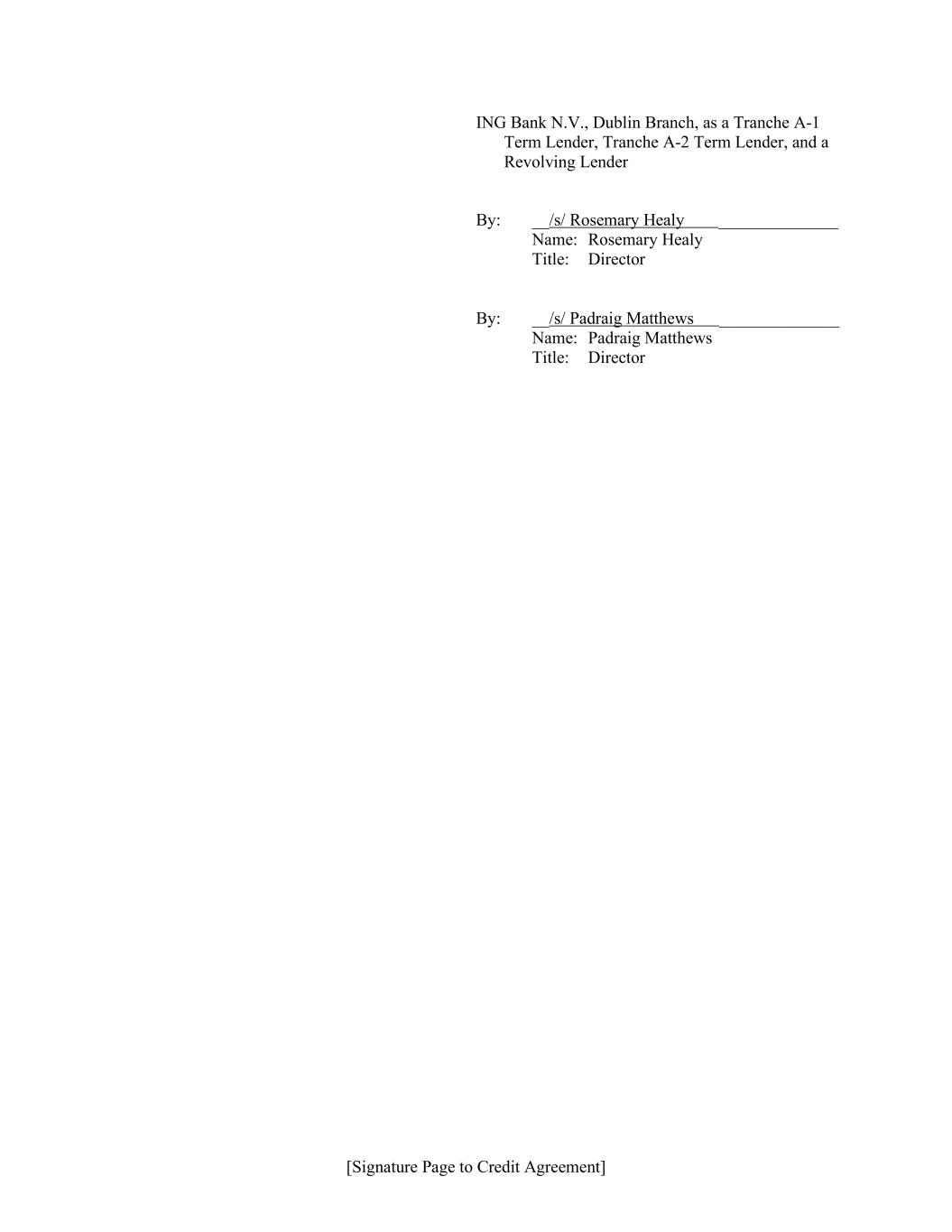 [Signature Page to Credit Agreement] ING Bank N.V., Dublin Branch, as a Tranche A-1 Term Lender, Tranche A-2 Term Lender, and a Revolving Lender By: __/s/ Rosemary Healy ______________ Name: Rosemary Healy Title: Director By: __/s/ Padraig Matthews ______________ Name: Padraig Matthews Title: Director