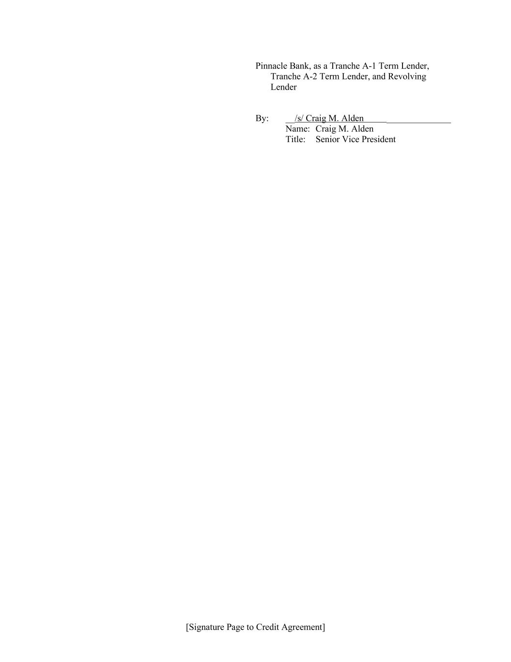 [Signature Page to Credit Agreement] Pinnacle Bank, as a Tranche A-1 Term Lender, Tranche A-2 Term Lender, and Revolving Lender By: __/s/ Craig M. Alden ______________ Name: Craig M. Alden Title: Senior Vice President