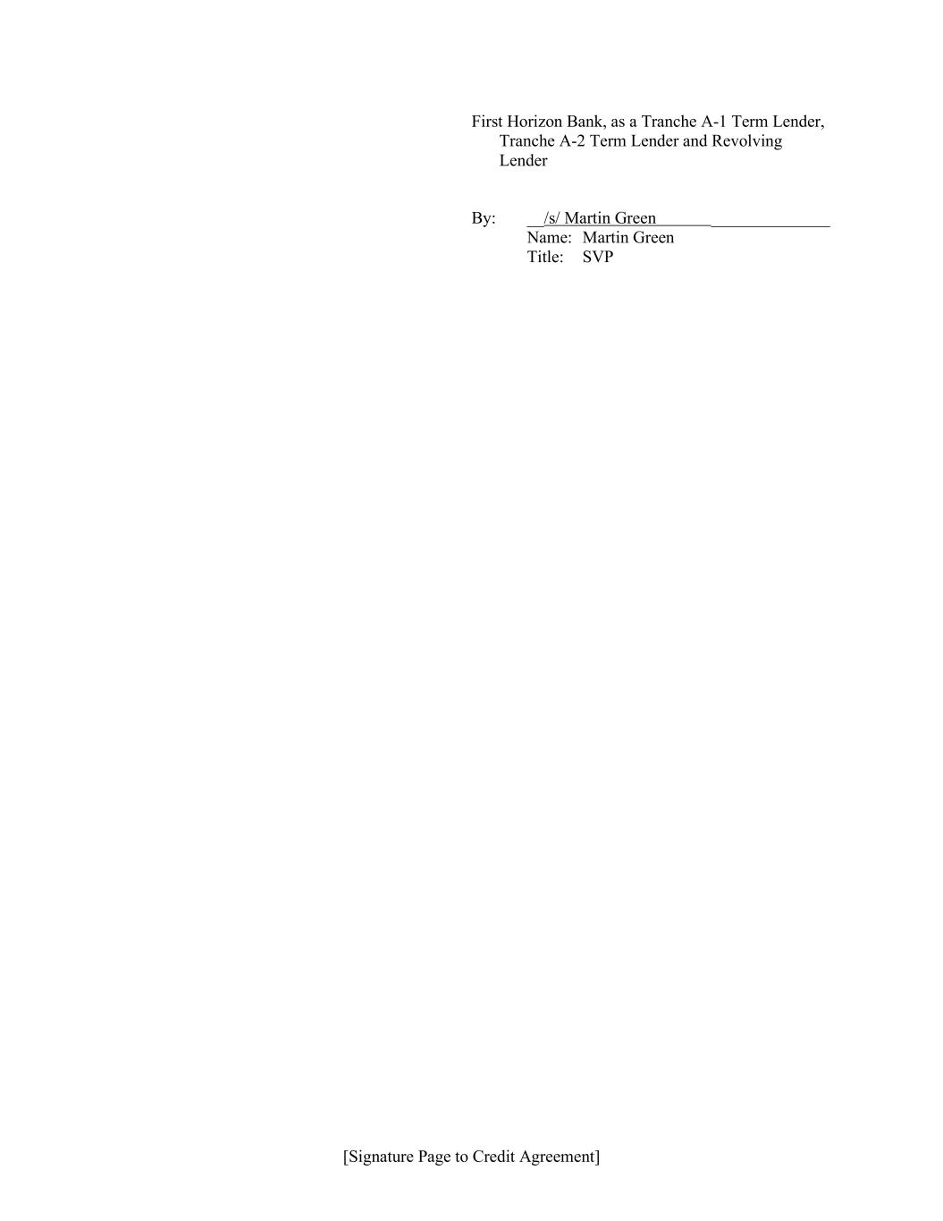 [Signature Page to Credit Agreement] First Horizon Bank, as a Tranche A-1 Term Lender, Tranche A-2 Term Lender and Revolving Lender By: __/s/ Martin Green ______________ Name: Martin Green Title: SVP