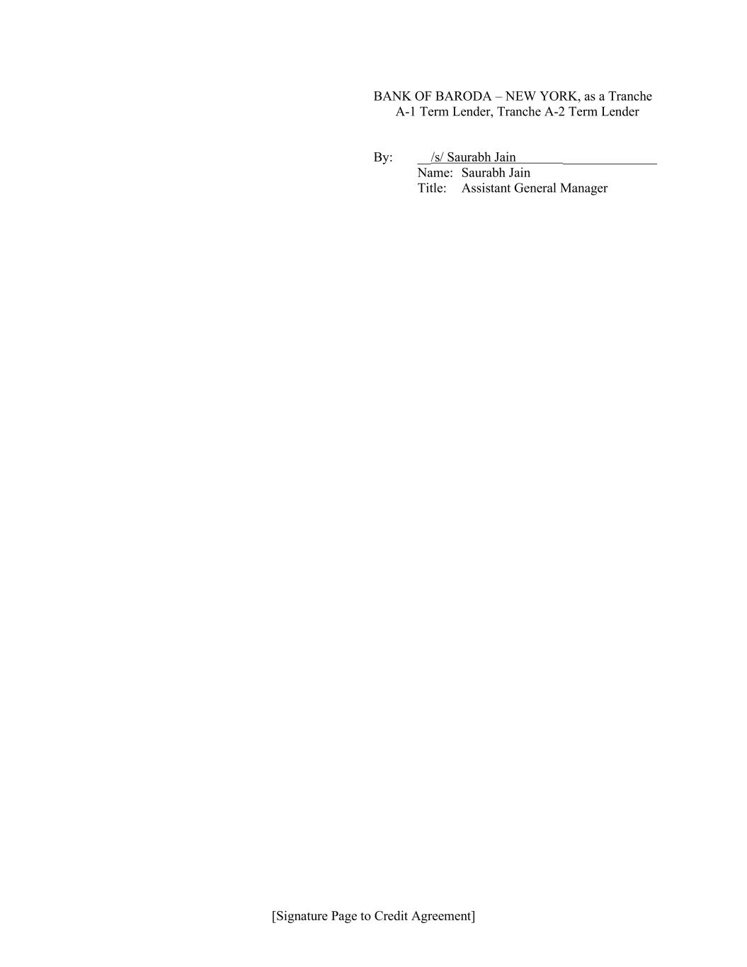 [Signature Page to Credit Agreement] BANK OF BARODA – NEW YORK, as a Tranche A-1 Term Lender, Tranche A-2 Term Lender By: __/s/ Saurabh Jain ______________ Name: Saurabh Jain Title: Assistant General Manager