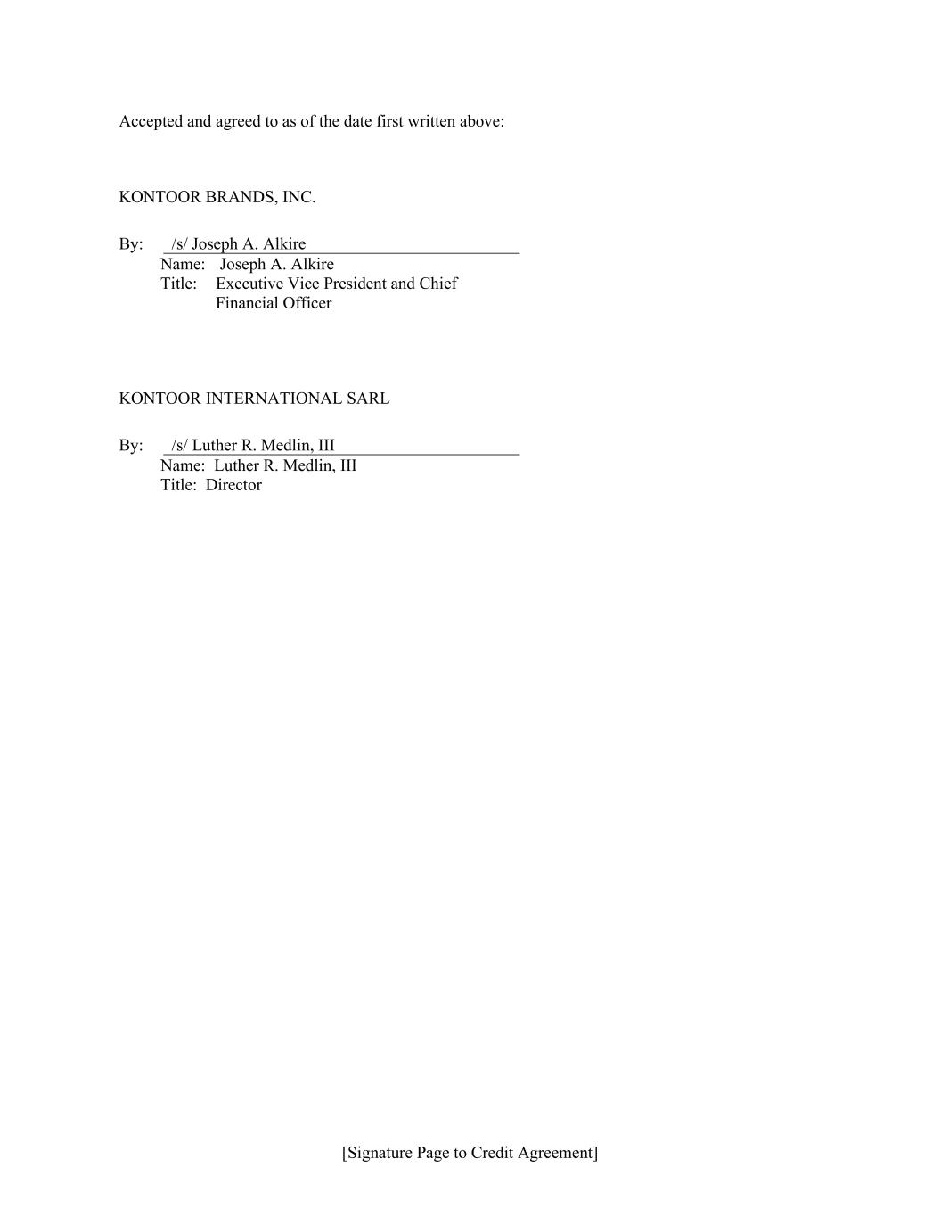 [Signature Page to Credit Agreement] Accepted and agreed to as of the date first written above: KONTOOR BRANDS, INC. By: /s/ Joseph A. Alkire Name: Joseph A. Alkire Title: Executive Vice President and Chief Financial Officer KONTOOR INTERNATIONAL SARL By: /s/ Luther R. Medlin, III Name: Luther R. Medlin, III Title: Director